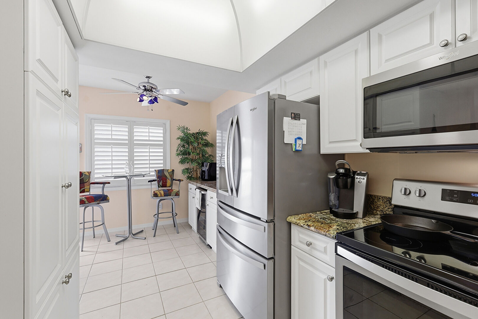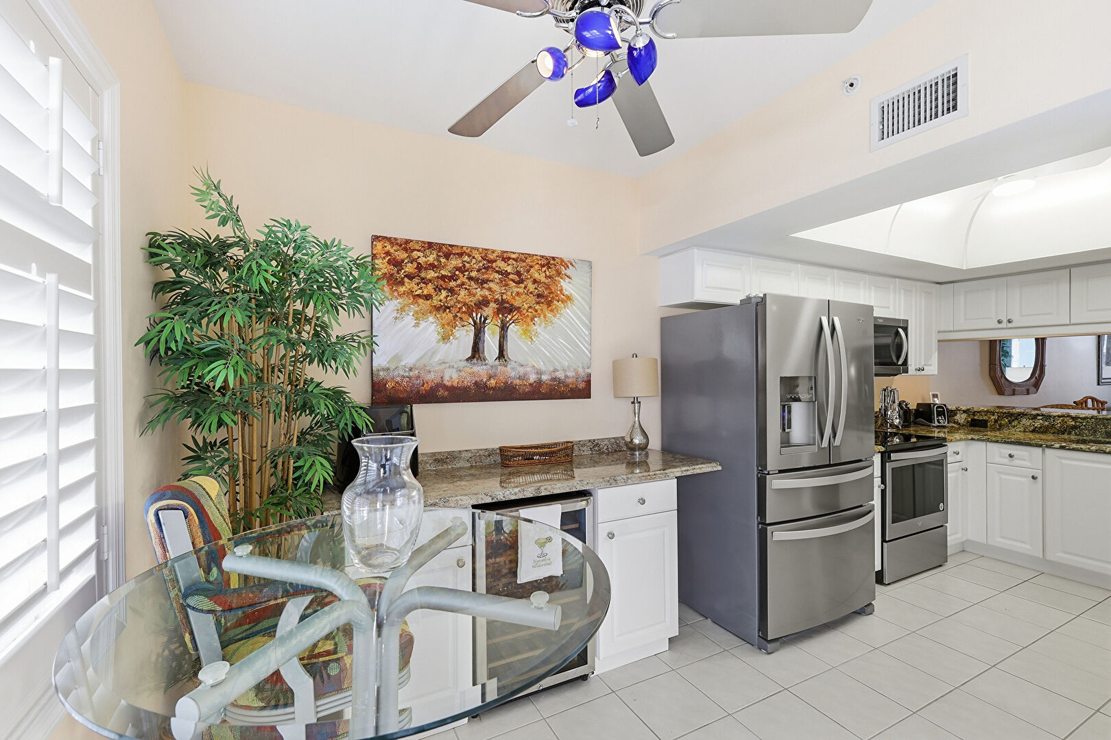 Baseboards Wall, Ceiling Fan, Drywall, Kitchen Peninsula, Natural Light, Pass Through Window, Raised Cabinets, Stone Countertops, Tile Floor, Vent, Wine Cooler, Drywall, Raised Cabinets, Stone Countertops, Tile Floor