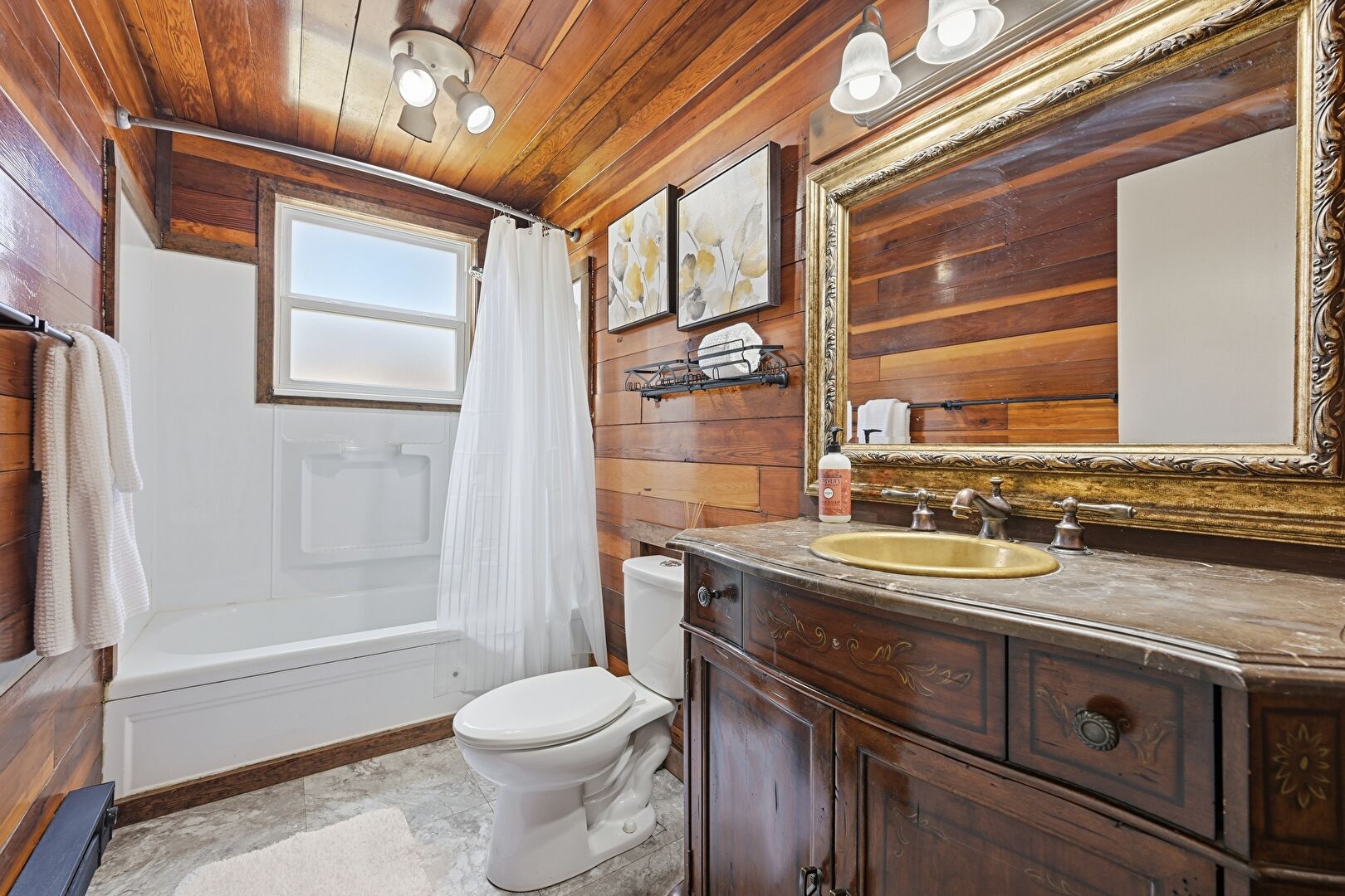 Combined Bath Shower, Full Bathroom, Natural Light, Tile Floor, Vanity, Wood Ceiling, Wood Wall, Baseboards Wall, Full Bathroom