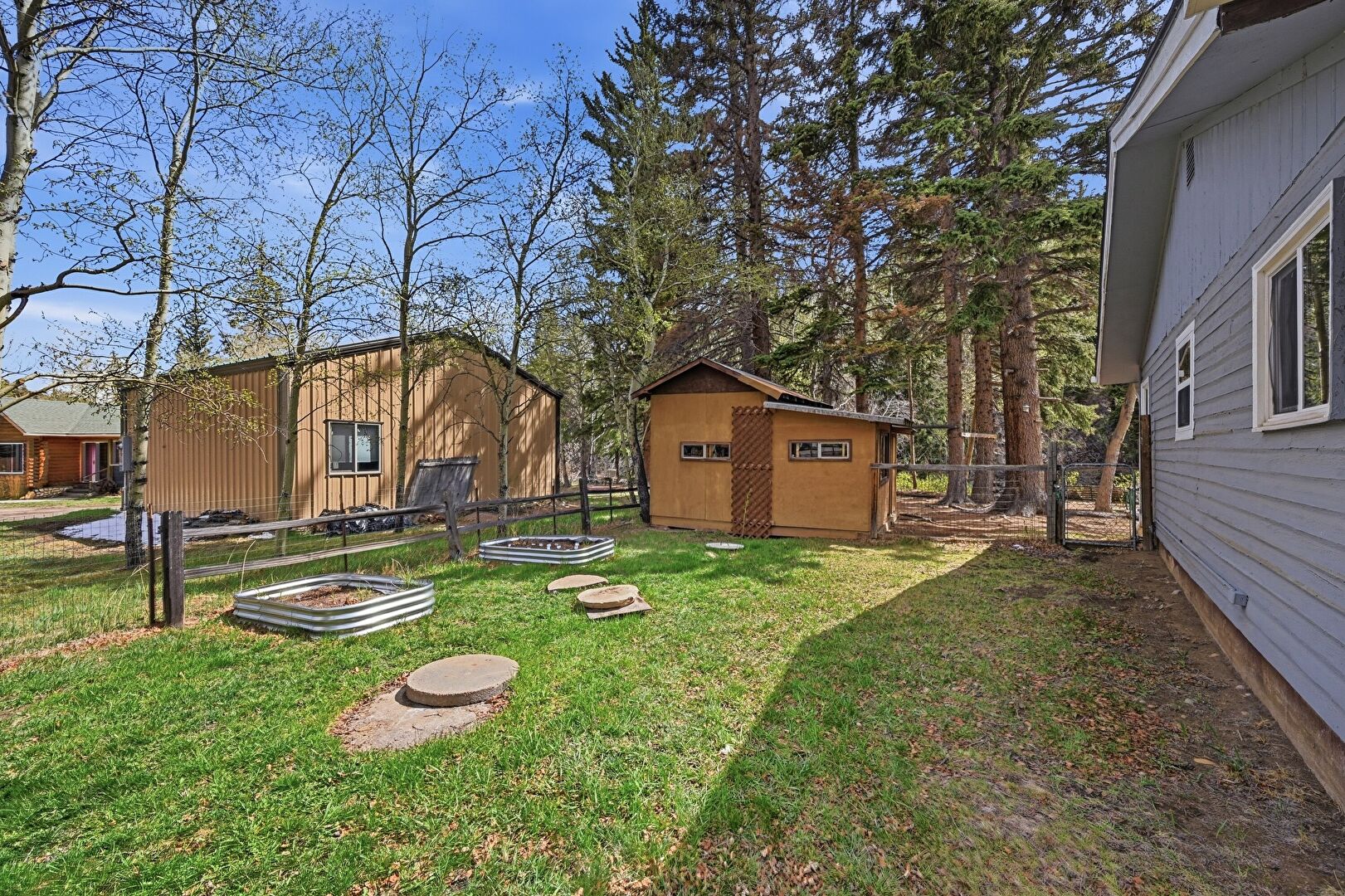 Fence, Fire Pit, Lawn, Outdoor Structure, Shed, Woods View