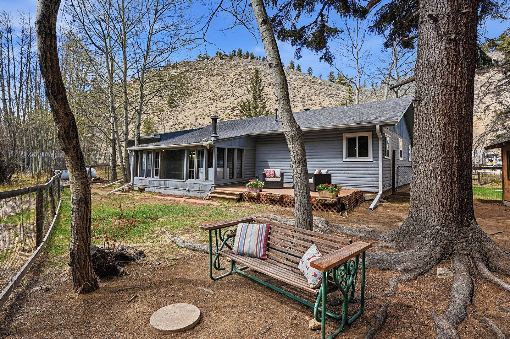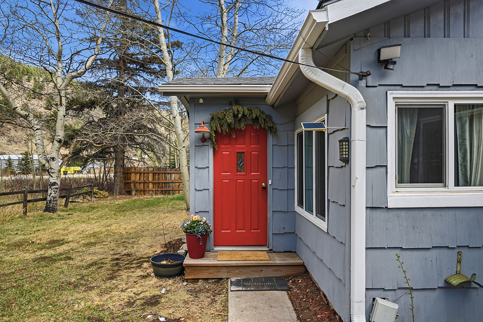 Downspout, Fence, Gutters, Lawn, Stoop, Vertical Siding, Shingle Roof