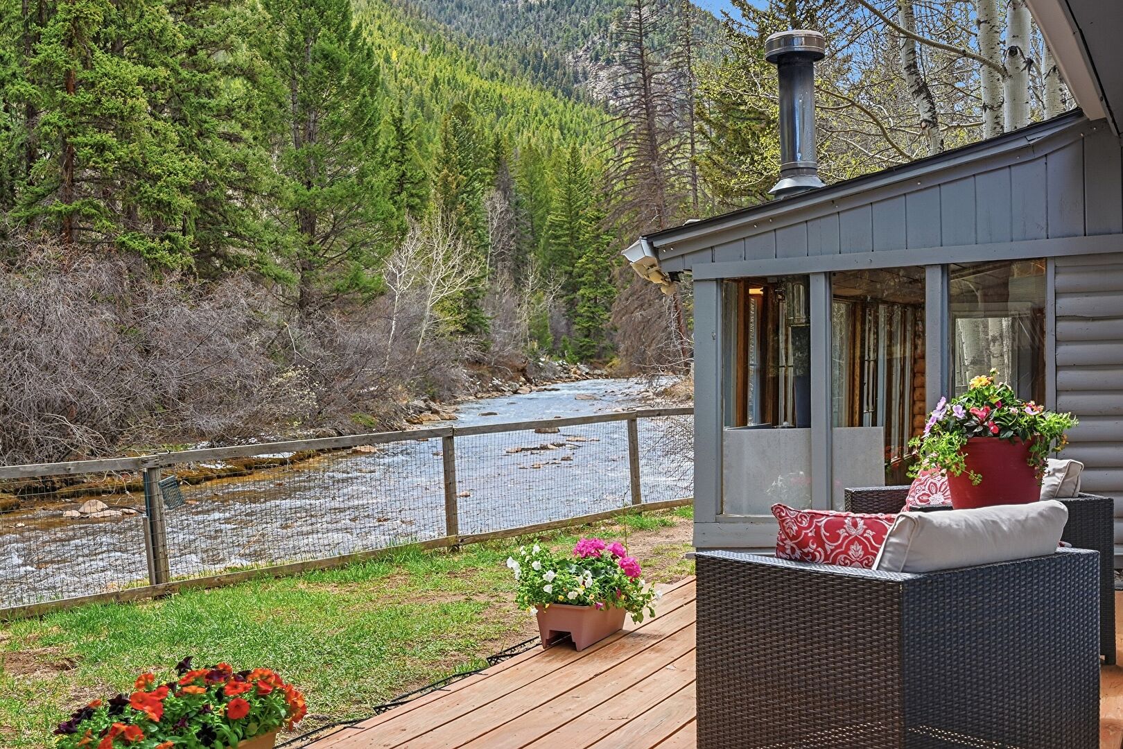 Deck, Downspout, Fence, Gutters, Horizontal Siding, Patio, Shingle Roof, Streamfront, Sunroom, Waterfront, Concrete Foundation, Water View