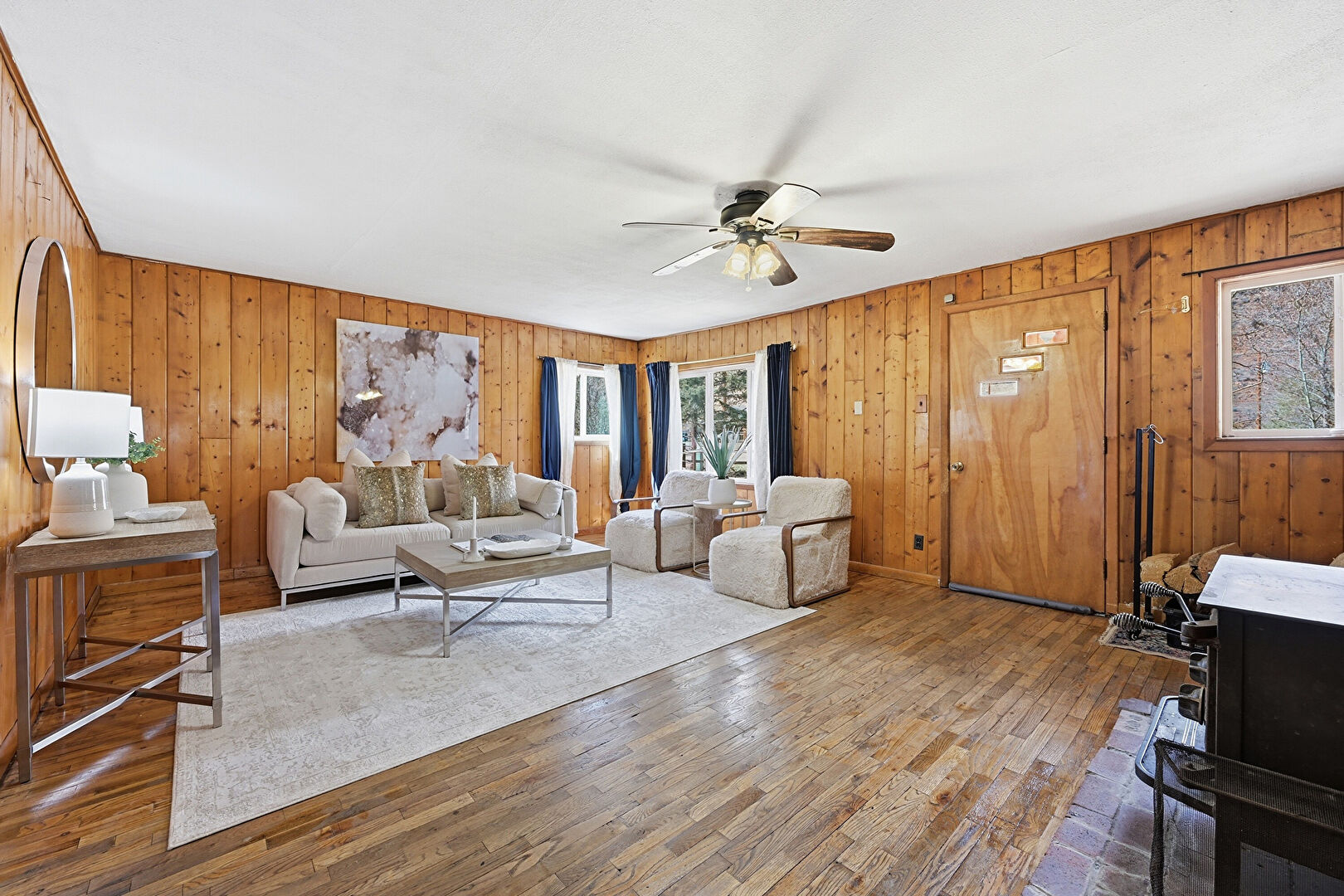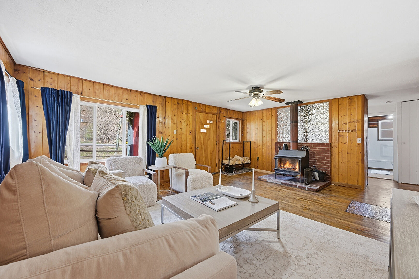 Baseboard Radiator, Baseboards Wall, Ceiling Fan, Natural Light, Wood Finish Floor, Wood Stove, Wood Wall, Ceiling Fan, Wood Finish Floor, Wood Stove, Wood Wall