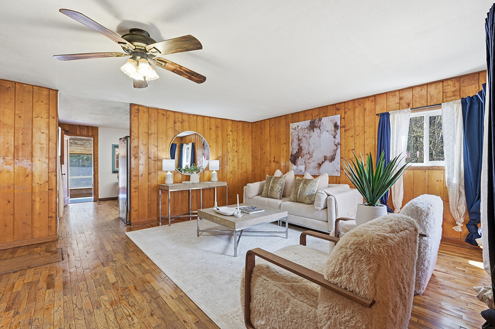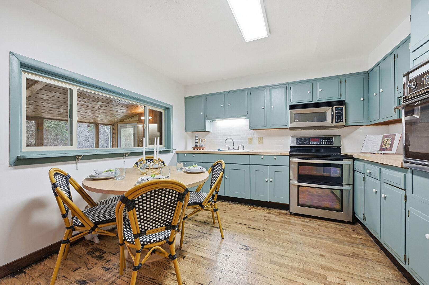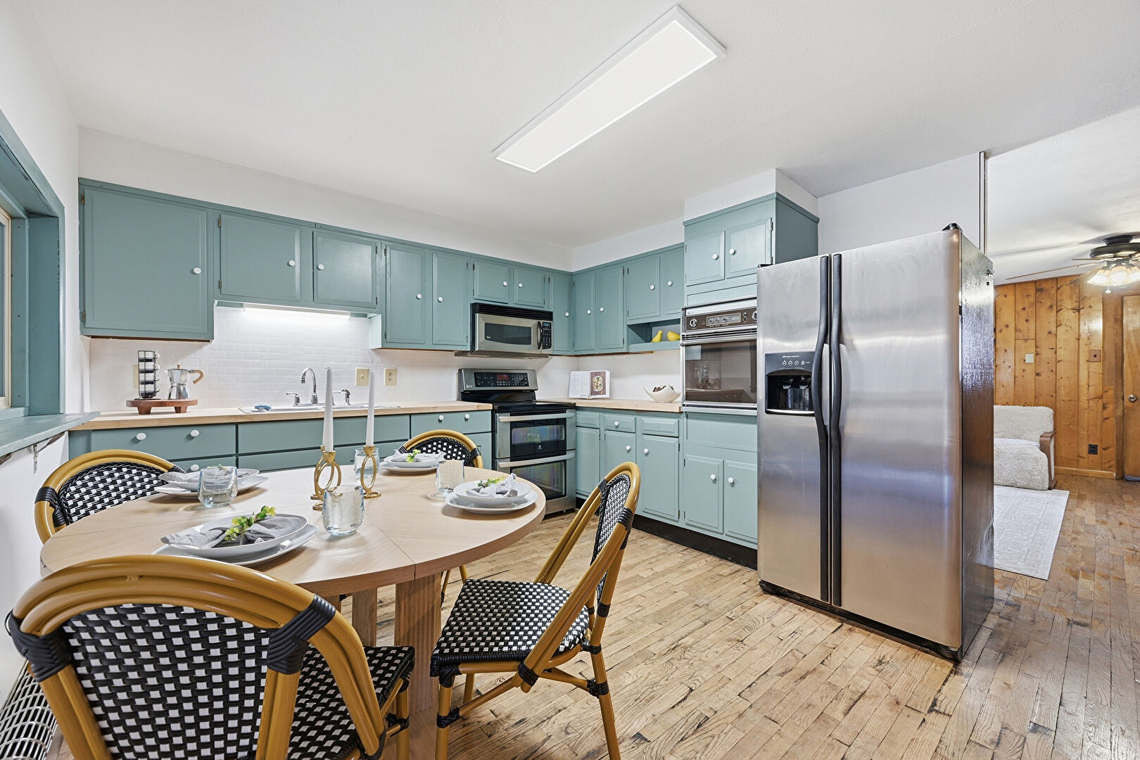 Blue Cabinets, Drywall, L Shaped Kitchen, Natural Light, Visible Hinge Cabinets, Wood Finish Floor, Wood Wall, Baseboards Wall, Ceiling Fan