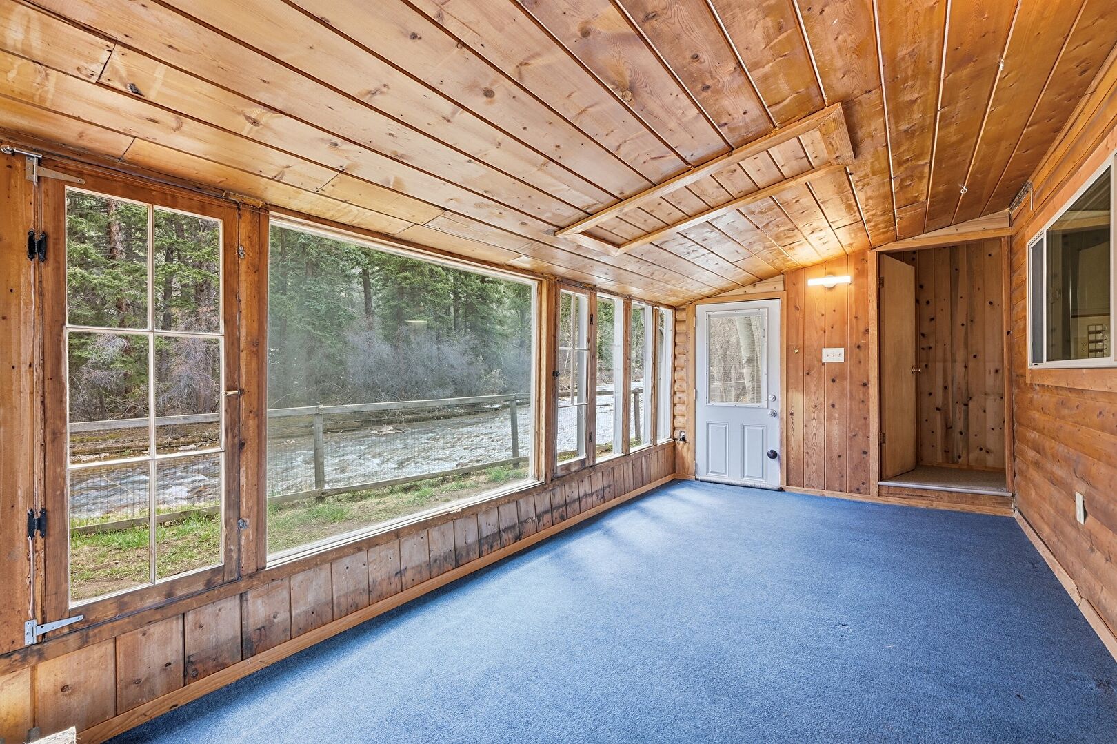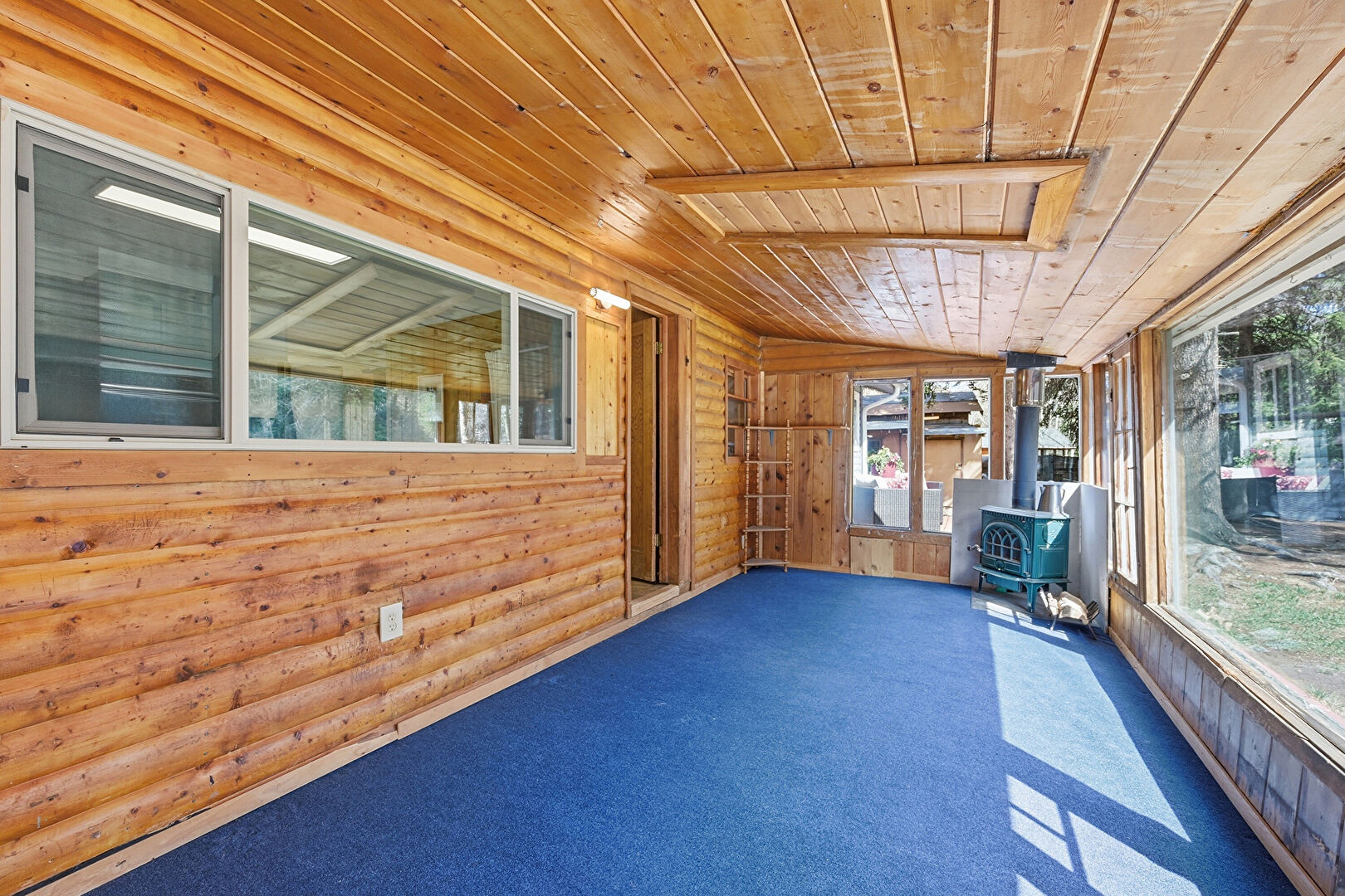 Baseboards Wall, Carpet, Vaulted Ceiling, Wood Ceiling, Wood Stove, Wood Wall, Natural Light