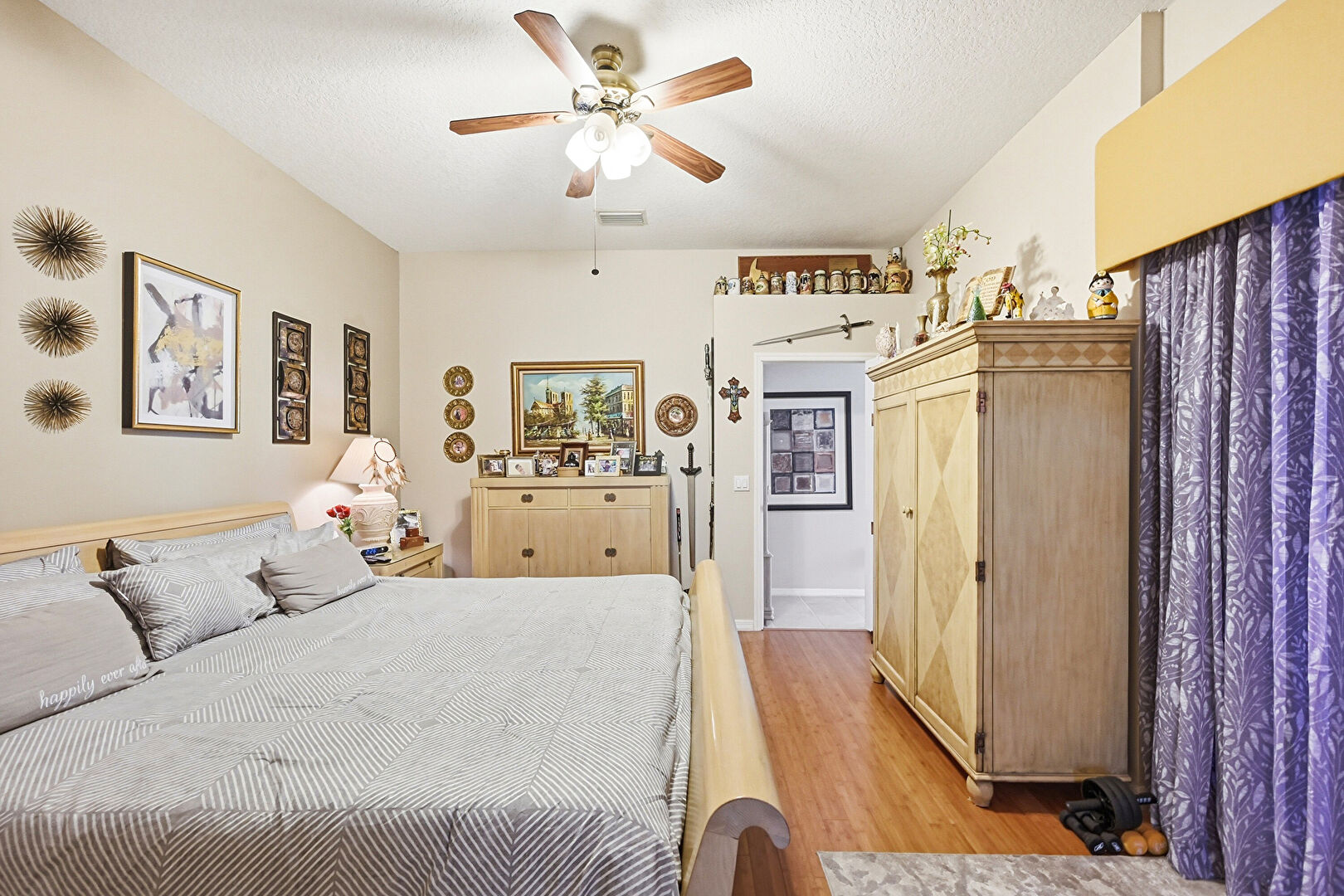 Baseboards Wall, Ceiling Fan, Drywall, Ensuite Bathroom, Natural Light, Textured Ceiling, Vent, Wood Finish Floor, Ceiling Fan, Textured Ceiling, Vent