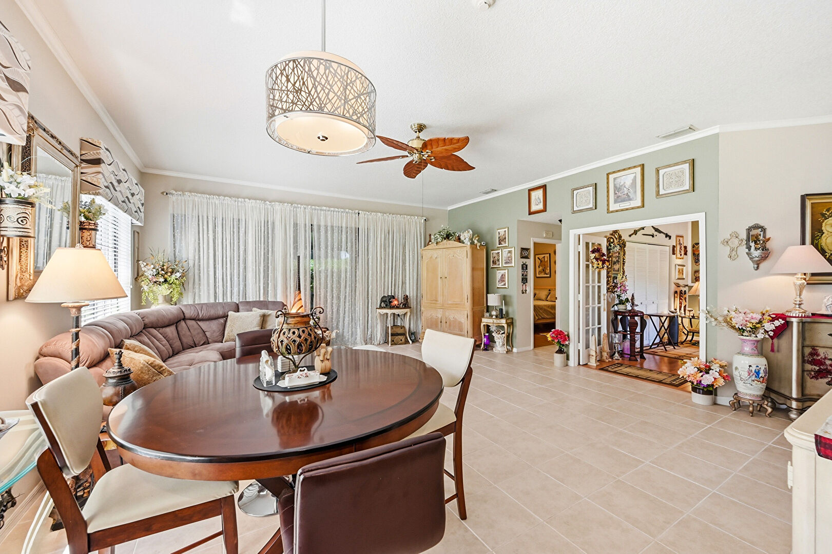 Ceiling Fan, Crown Molding, Drywall, Natural Light, Textured Ceiling, Tile Floor, Vent, Wood Finish Floor, Drywall, Textured Ceiling, Vent