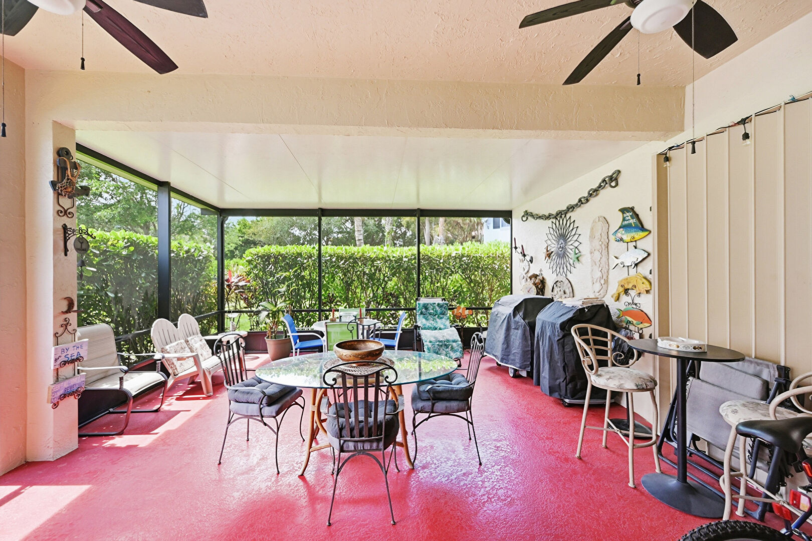 Ceiling Fan, Grill, Natural Light, Outdoor Dining Area, Sunroom, Beamed Ceiling, Concrete Floor, Natural Light