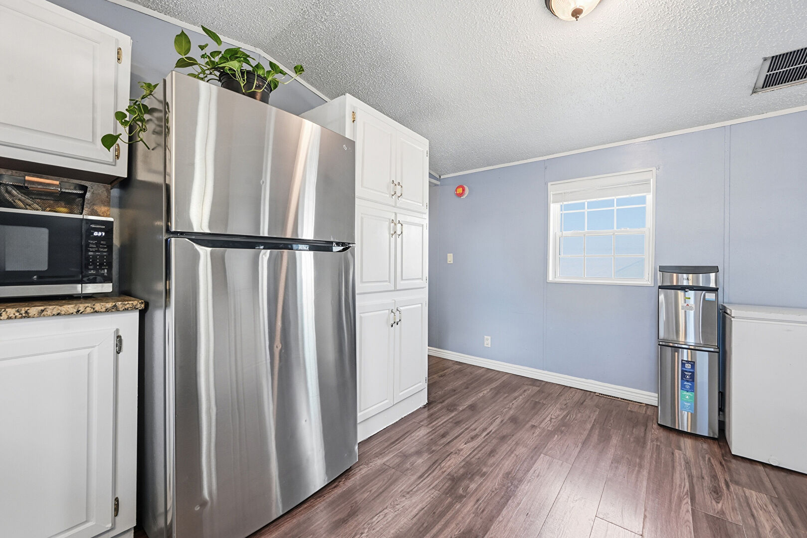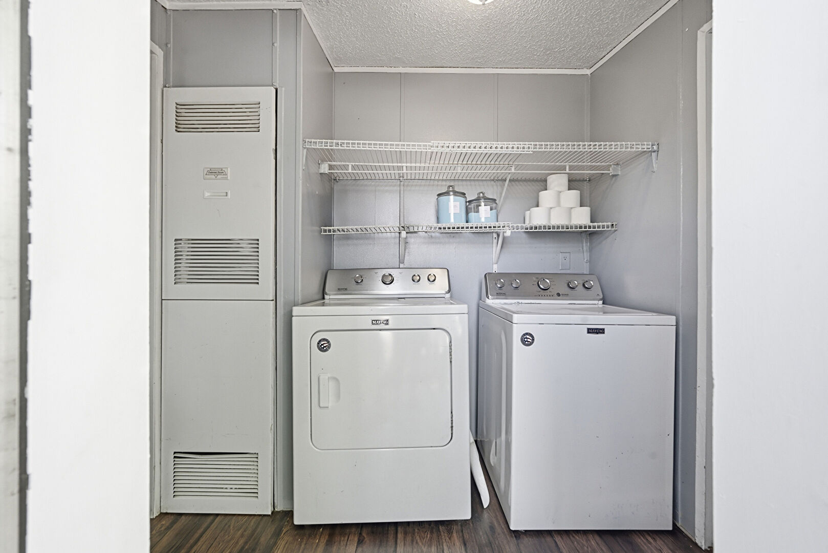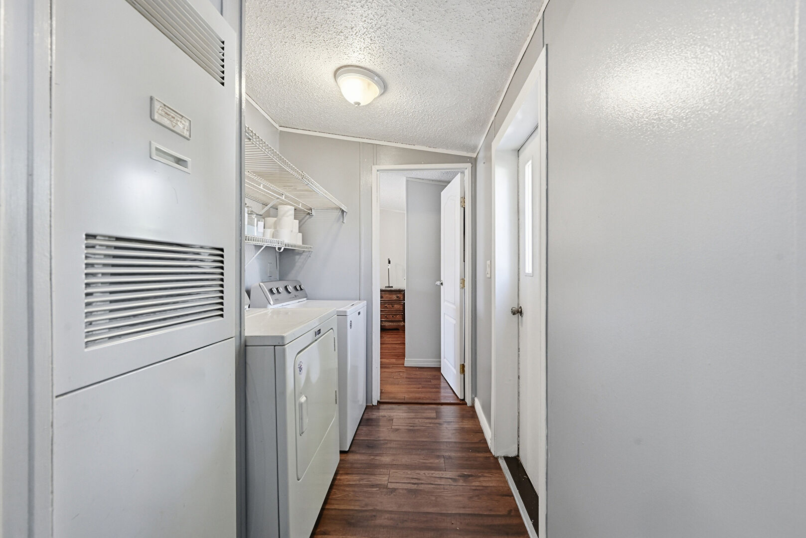 Laundry, Textured Ceiling, Wall Furnace, Wood Finish Floor, Drywall