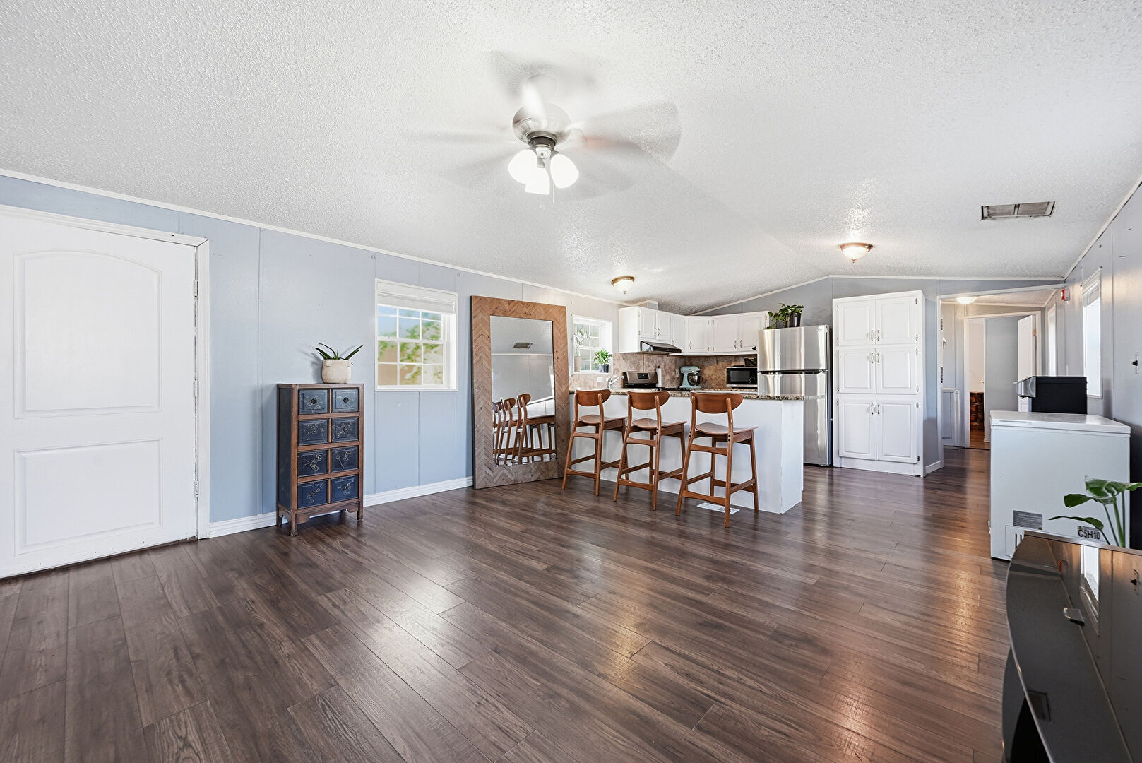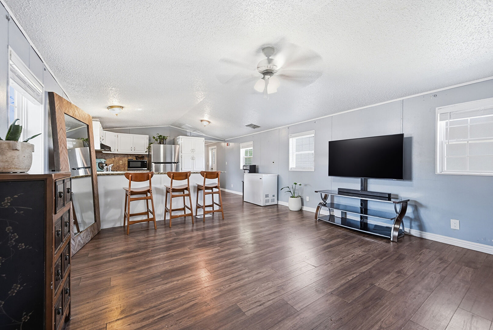 Baseboards Wall, Ceiling Fan, Crown Molding, Drywall, Natural Light, Textured Ceiling, U Shaped Kitchen, Vaulted Ceiling, Vent, Wood Finish Floor, Built In Shelves, Ceiling Fan, Textured Ceiling