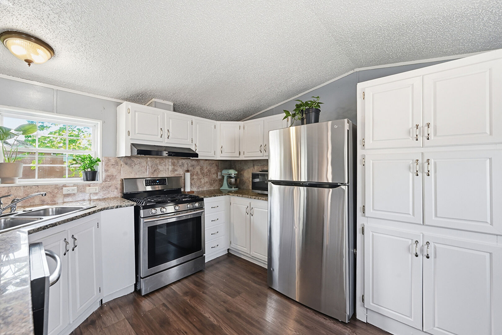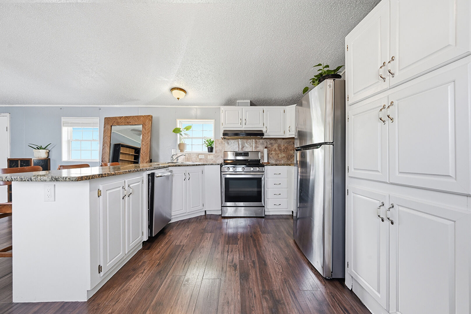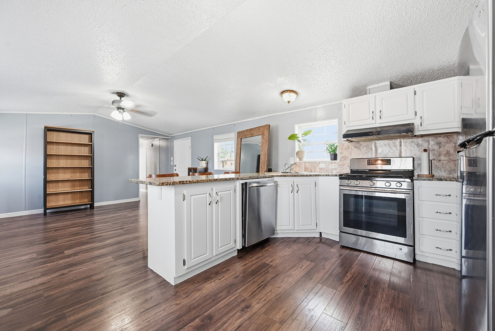 Baseboards Wall, Ceiling Fan, Crown Molding, Drywall, Kitchen Peninsula, Natural Light, Raised Cabinets, Stone Countertops, Textured Ceiling, U Shaped Kitchen, Vaulted Ceiling, Vent, Visible Hinge Cabinets, Wood Finish Floor, Kitchen Peninsula, Raised Cabinets, Textured Ceiling, Visible Hinge Cabinets