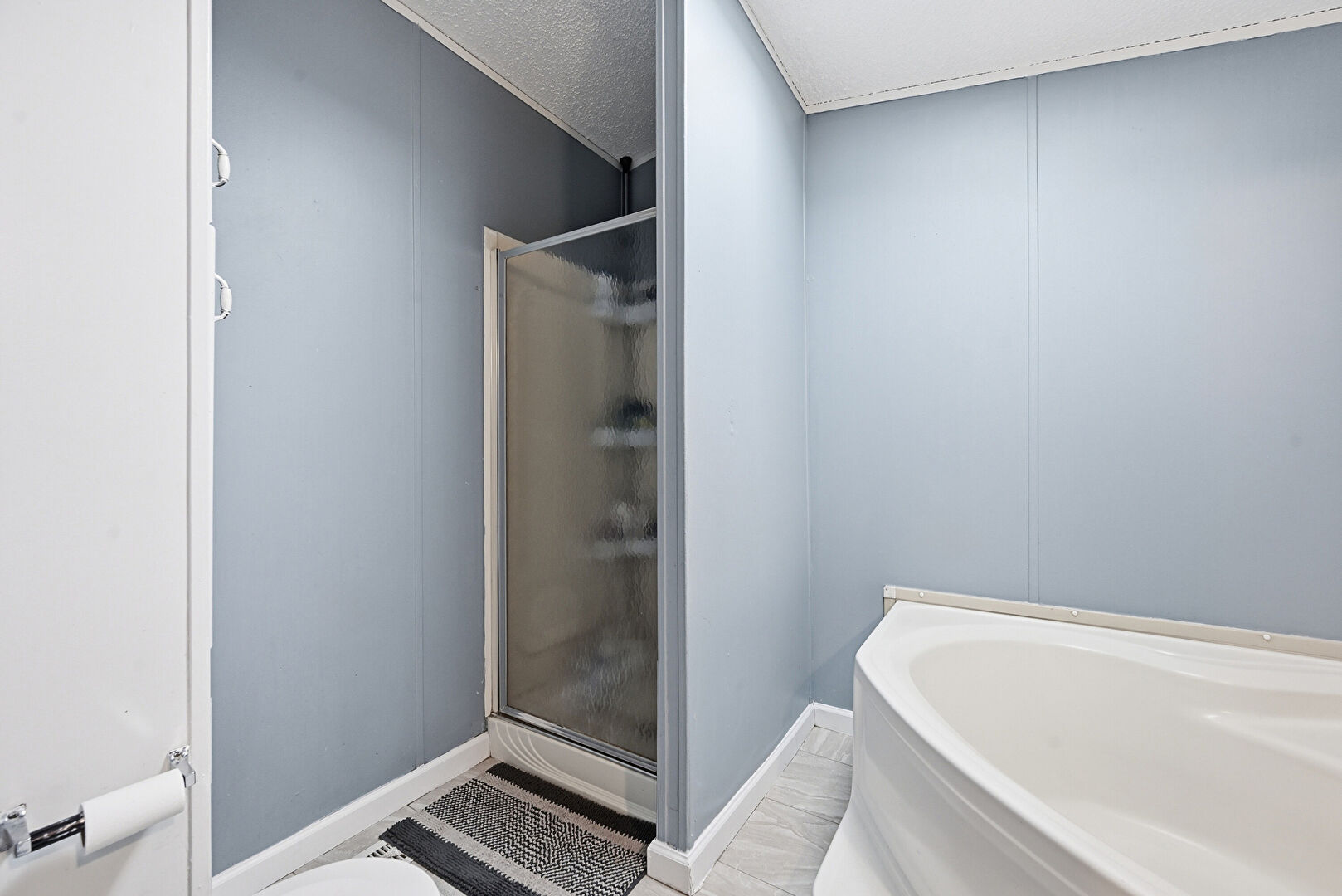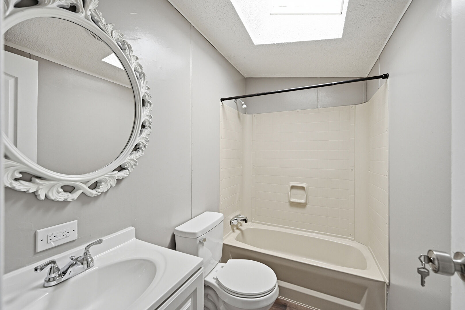 Combined Bath Shower, Drywall, Full Bathroom, Skylight, Textured Ceiling, Vaulted Ceiling, Vanity