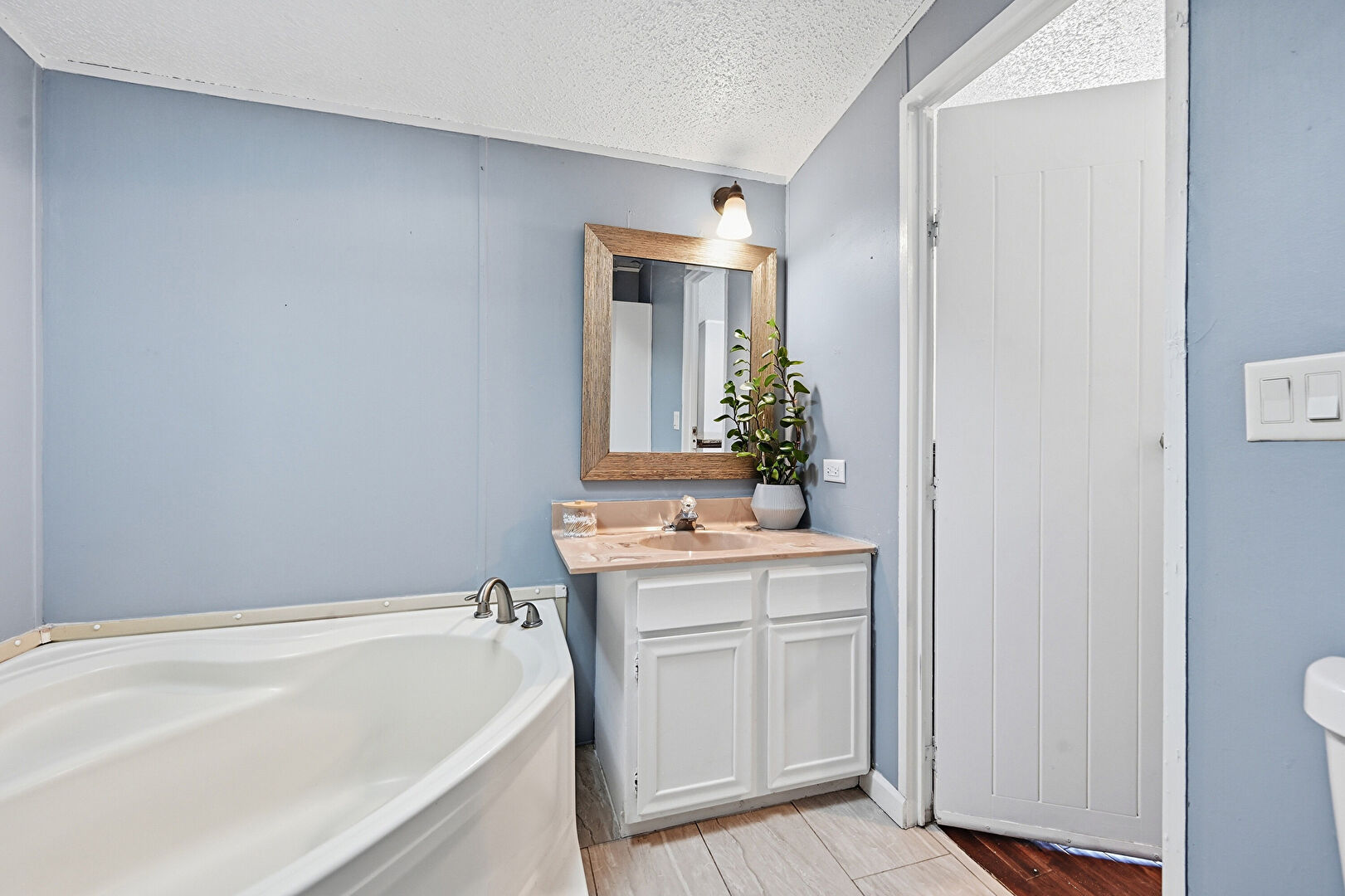 Baseboards Wall, Drywall, Full Bathroom, Paneling Wall, Textured Ceiling, Vanity, Wood Finish Floor, Baseboards Wall, Marble Finish Floor