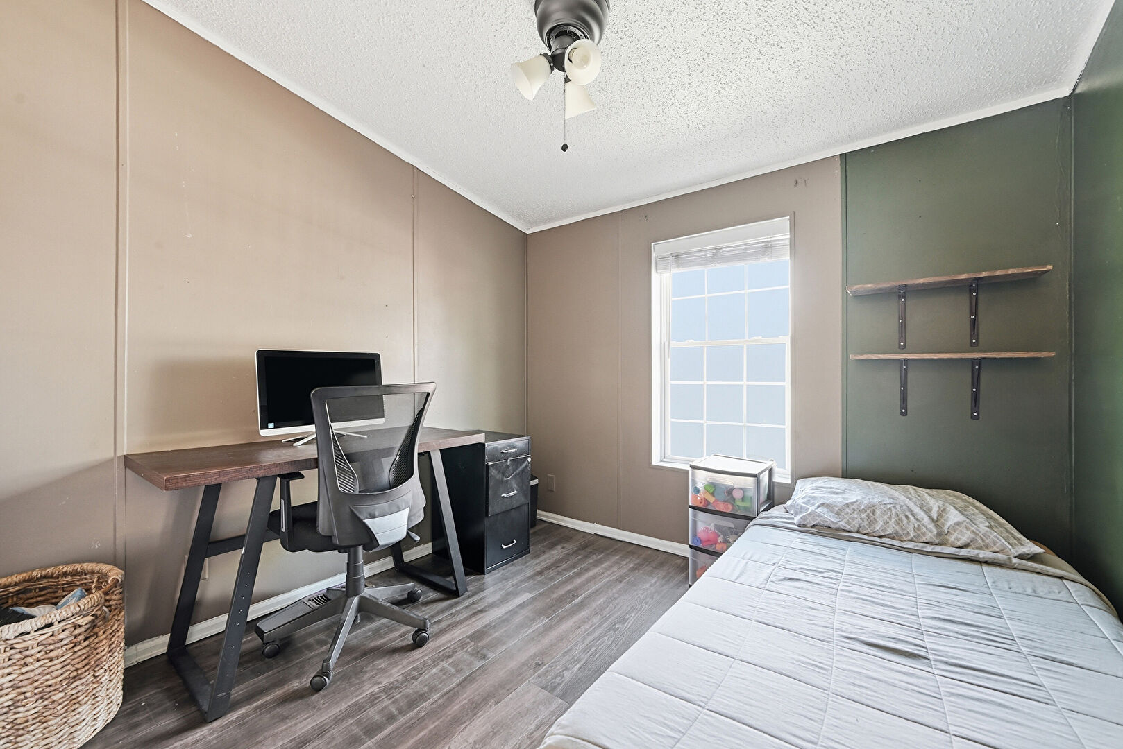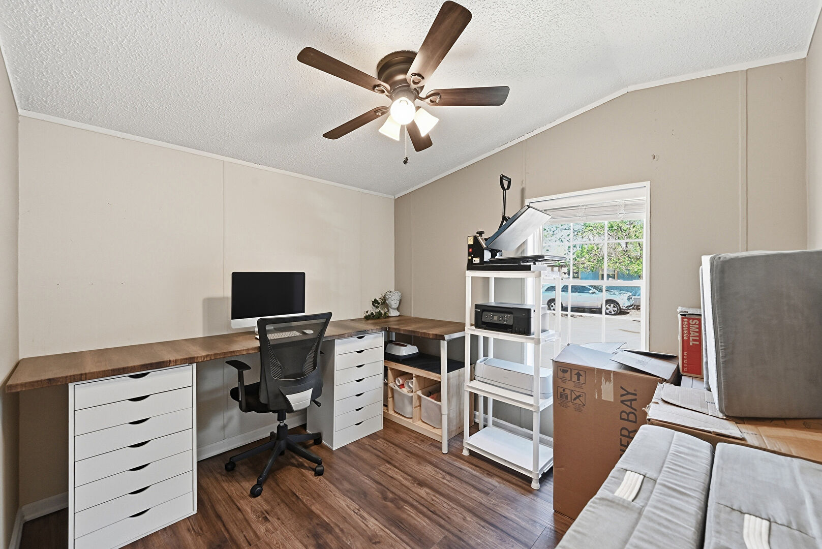 Ceiling Fan, Crown Molding, Drywall, Natural Light, Office Area, Smoke Carbon Monoxide Detector, Textured Ceiling, Vaulted Ceiling, Wood Finish Floor, Baseboards Wall, Wood Finish Floor
