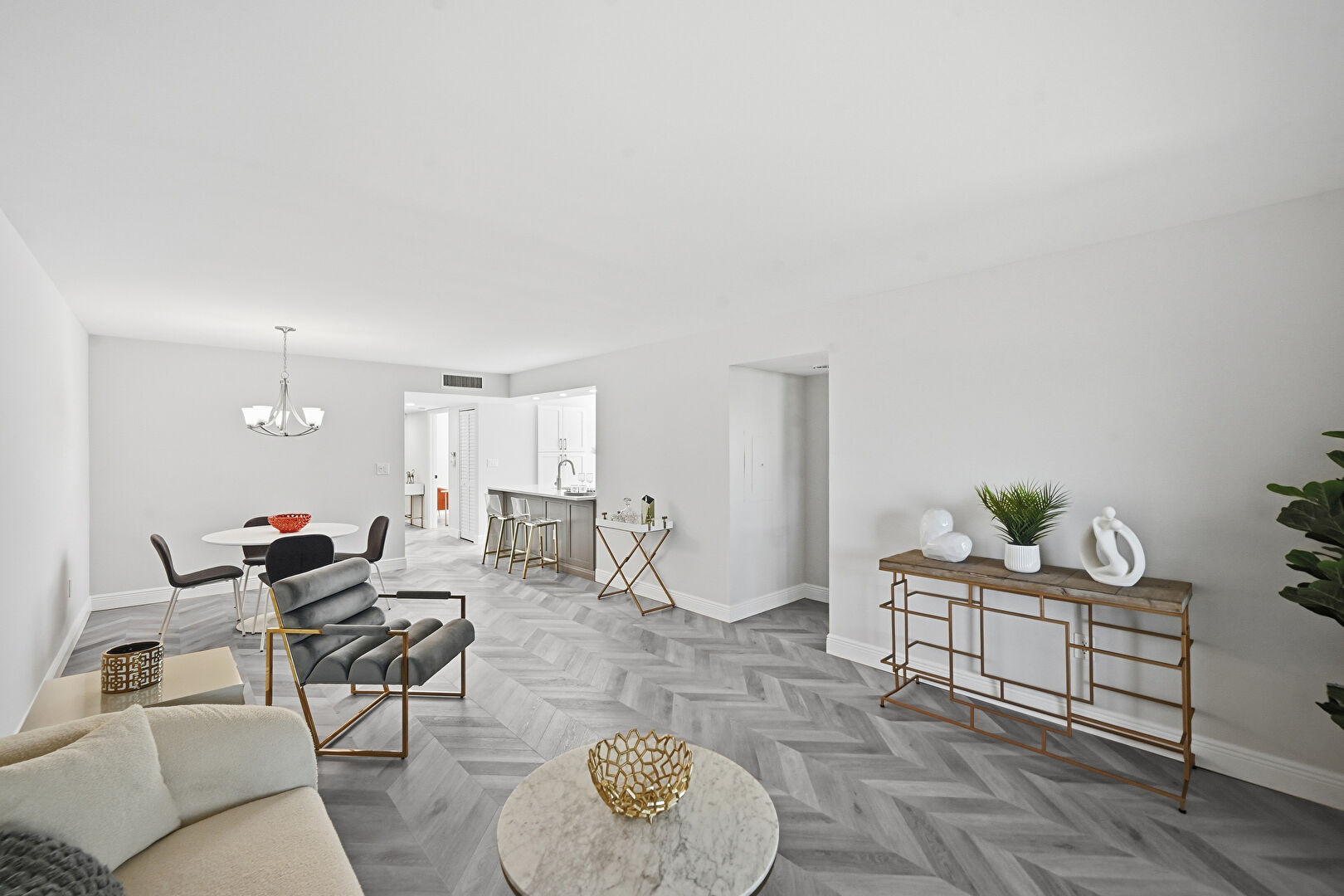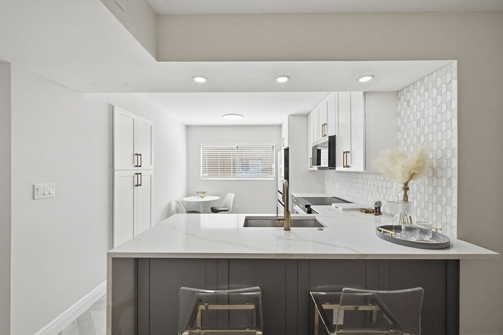 Baseboards Wall, Drywall, Gray Cabinets, Kitchen Bar, Kitchen Peninsula, Natural Light, Notable Chandelier, Pendant Lighting, Recessed Lighting, Shaker Cabinets, Stone Countertops, U Shaped Kitchen, Vent, Wood Finish Floor, Drywall, Recessed Lighting, Wood Finish Floor