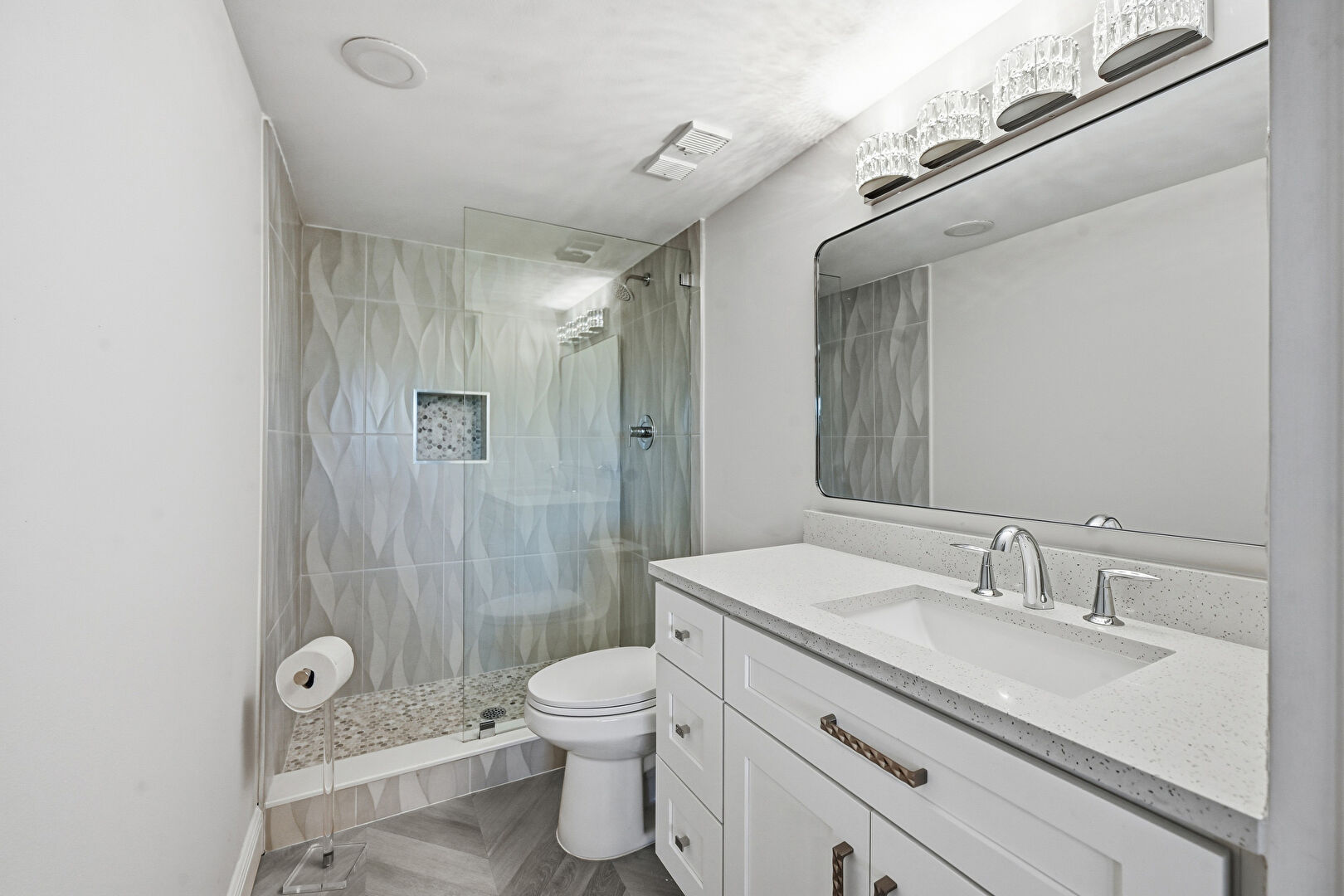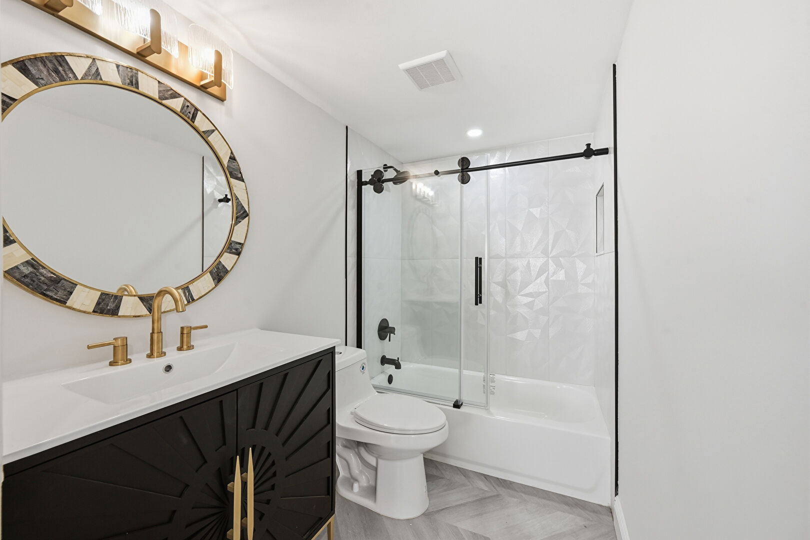 Combined Bath Shower, Drywall, Full Bathroom, Recessed Lighting, Vanity, Wood Finish Floor, Full Bathroom, Vent