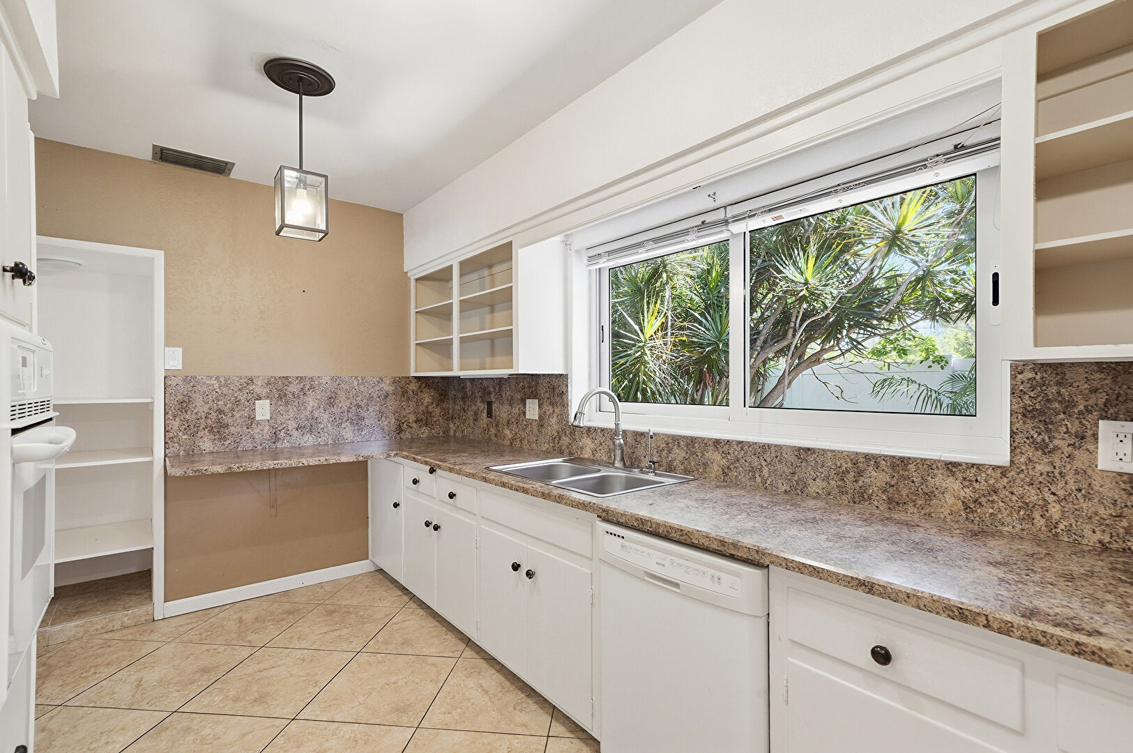 Baseboards Wall, Ceiling Fan, Drywall, Galley Kitchen, Natural Light, Tile Floor, Pendant Lighting, Tile Floor