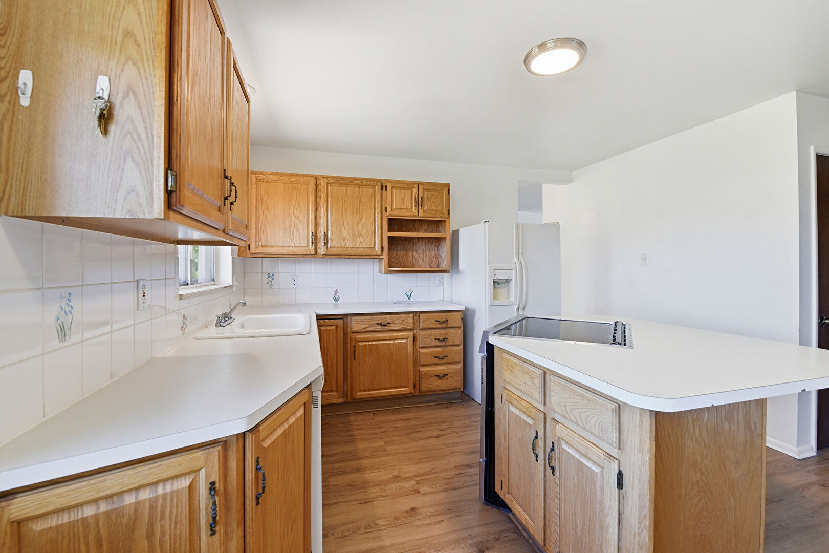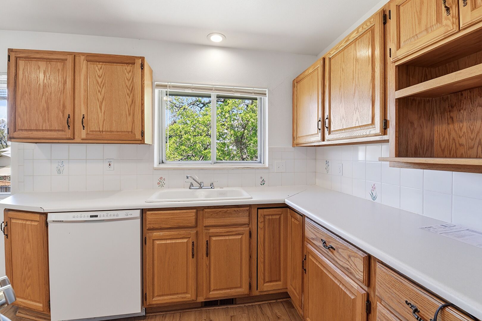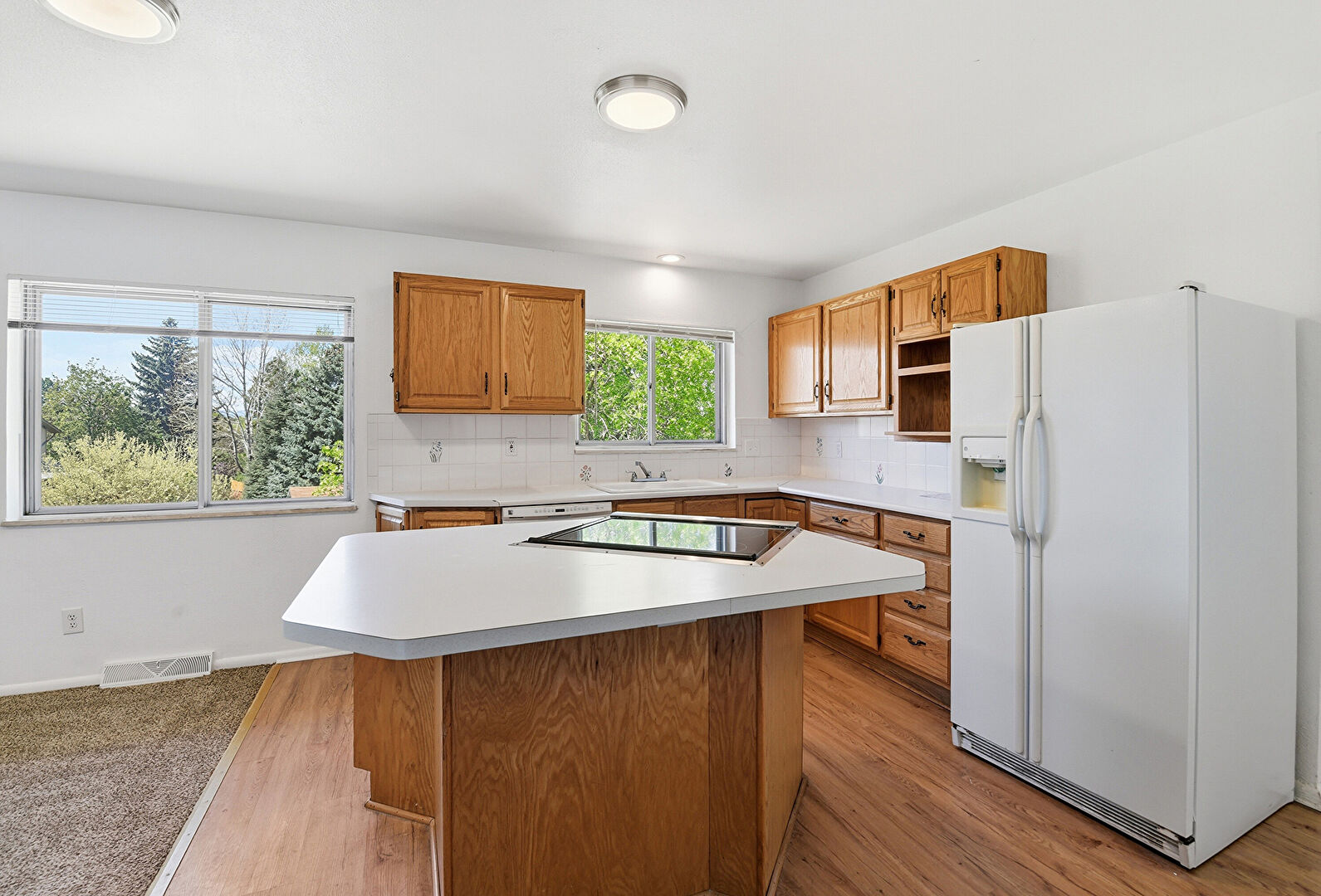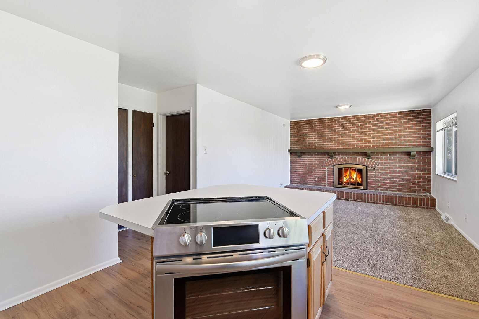 Baseboards Wall, Brick Wall, Carpet, Drywall, Fireplace, Kitchen Island, L Shaped Kitchen, Medium Brown Cabinets, Natural Light, Open Shelves, Opens To Living Area, Raised Cabinets, Recessed Lighting, Vent, Visible Hinge Cabinets, Wood Finish Floor, Kitchen Island, Medium Brown Cabinets, Wood Finish Floor