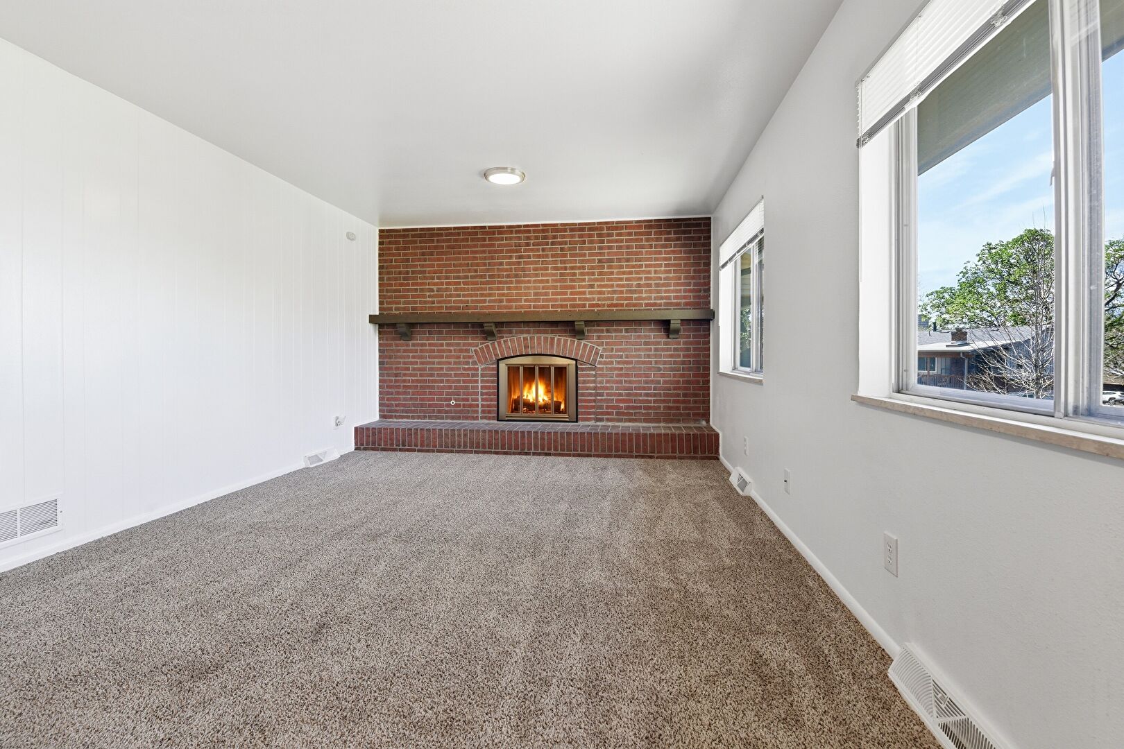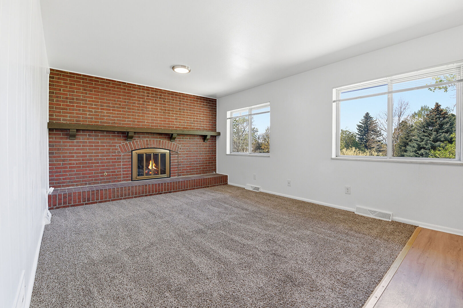 Baseboards Wall, Brick Wall, Carpet, Drywall, Fireplace, Natural Light, Vent, Wood Finish Floor, Accent Wall, Natural Light