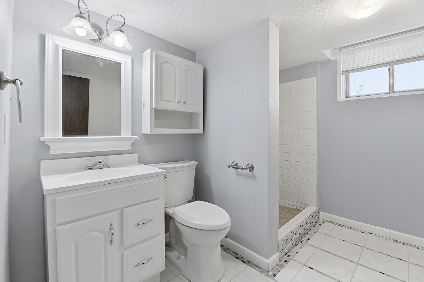 Aggregate Floor, Baseboards Wall, Basement, Combined Bath Shower, Drywall, Natural Light, Notable Chandelier, Textured Ceiling, Tile Floor, Vanity, Full Bathroom