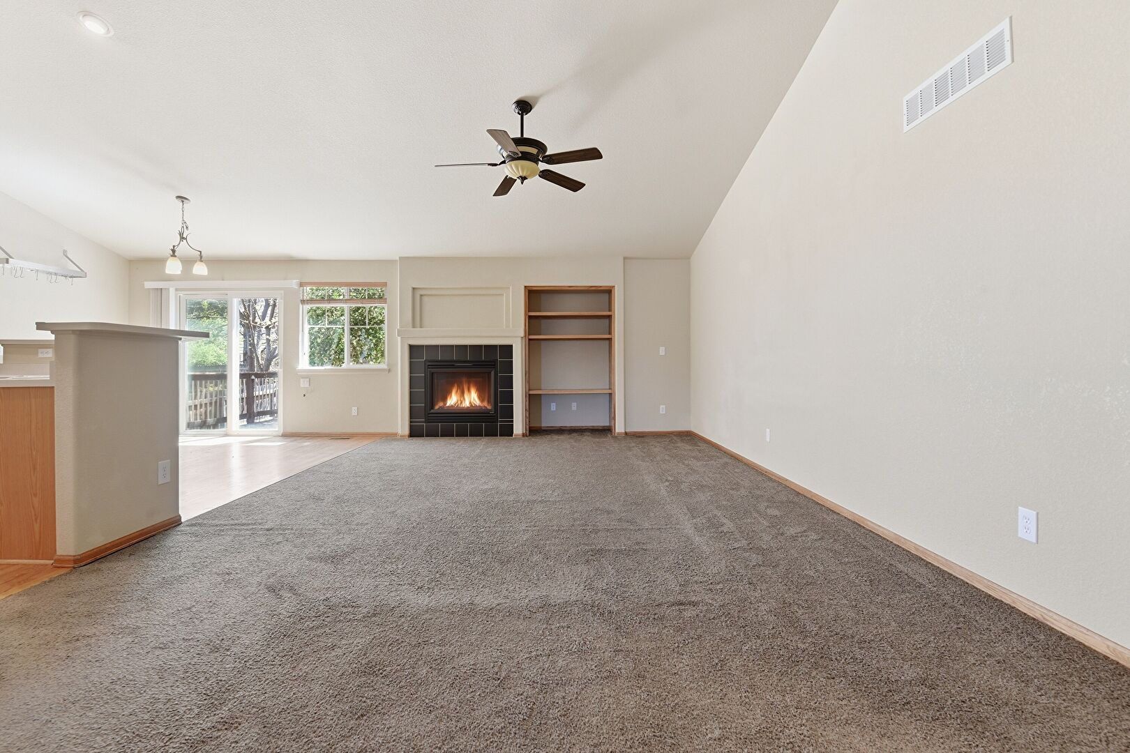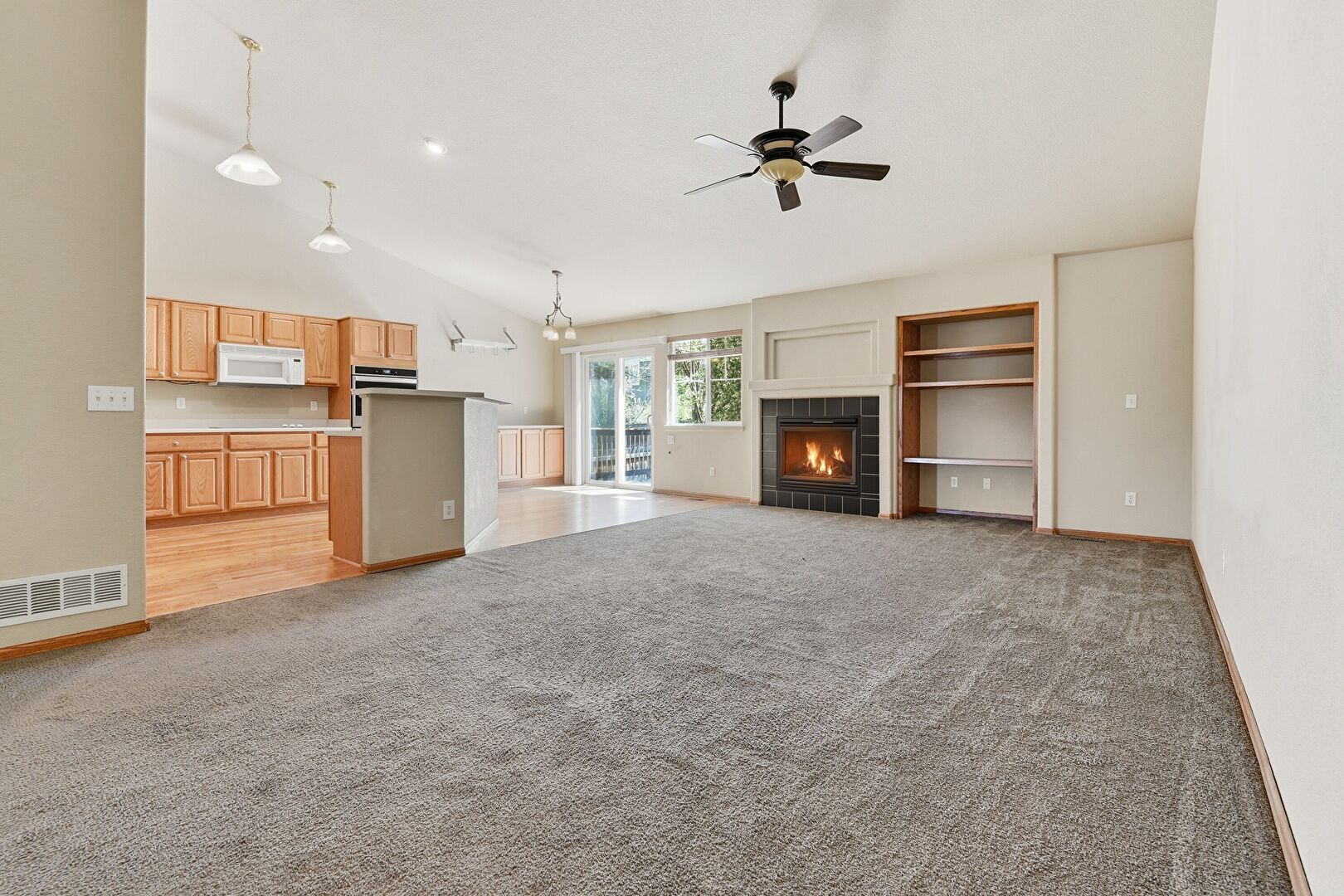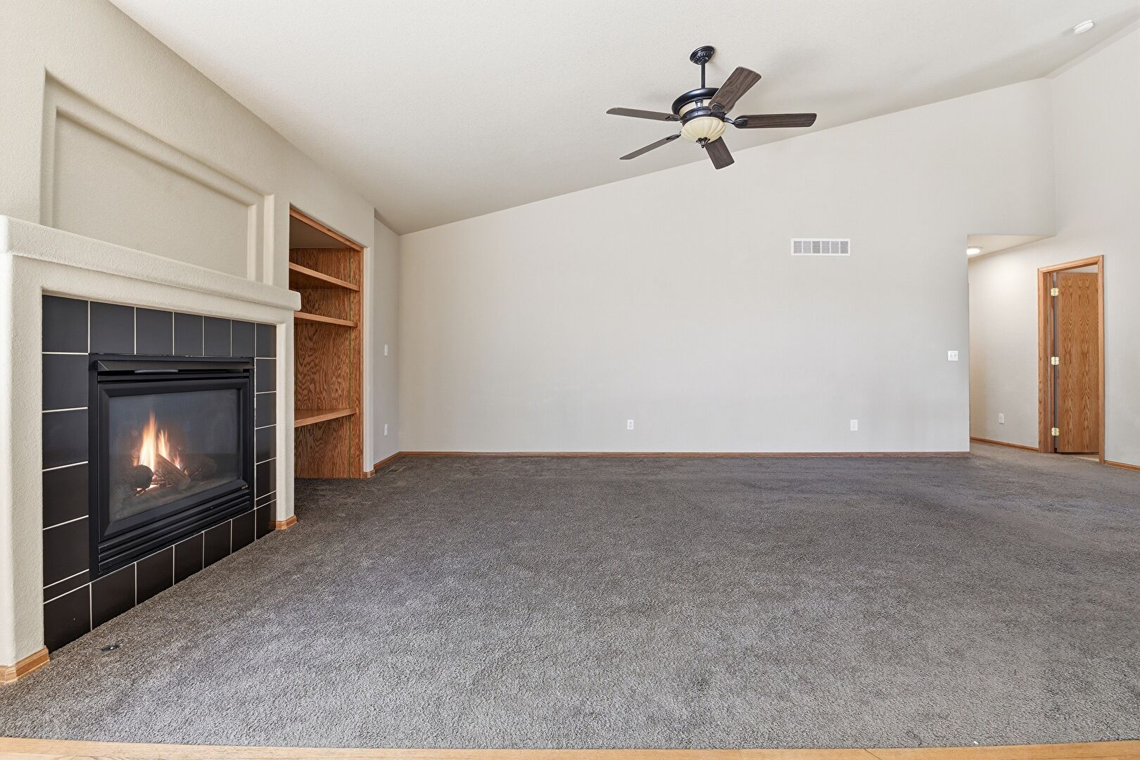 Baseboards Wall, Built In Shelves, Carpet, Ceiling Fan, Drywall, Fireplace, High Ceiling, Natural Light, Vaulted Ceiling, Vent, Baseboards Wall, Built In Shelves, Ceiling Fan
