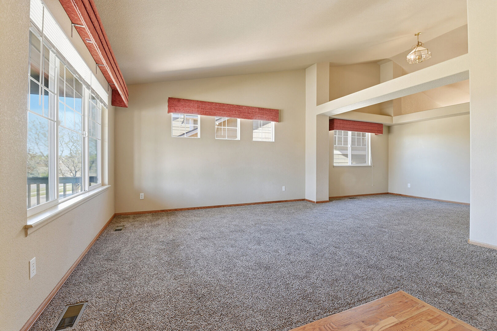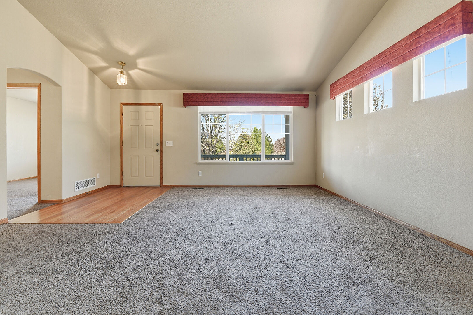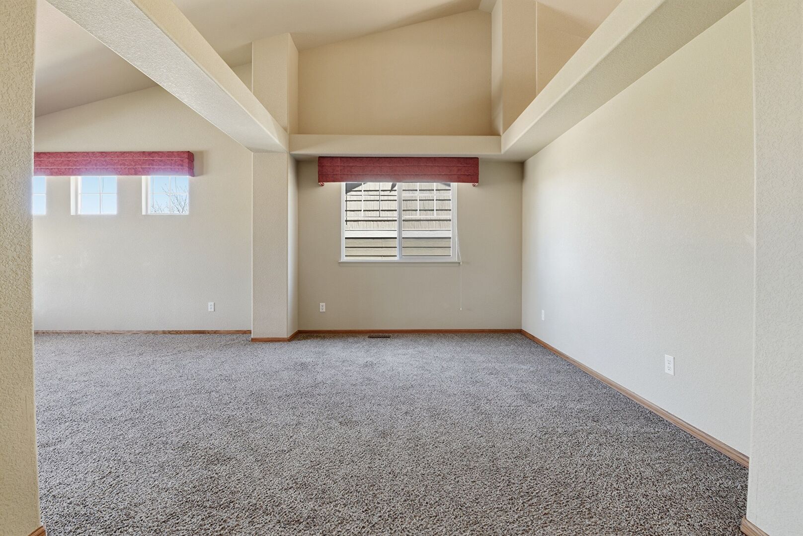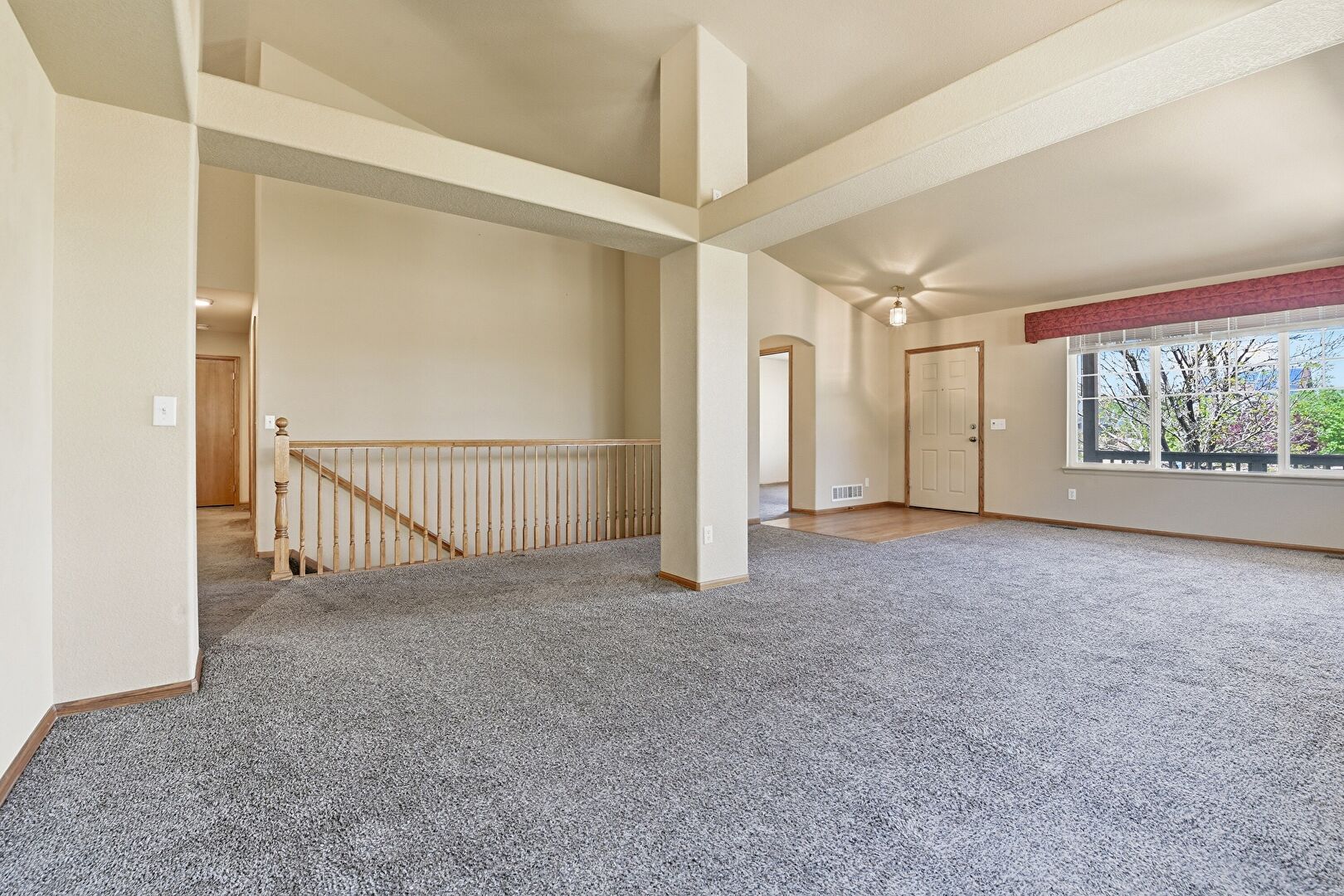 Arched Walkways, Baseboards Wall, Carpet, Drywall, High Ceiling, Natural Light, Vaulted Ceiling, Vent, Vaulted Ceiling, Vent