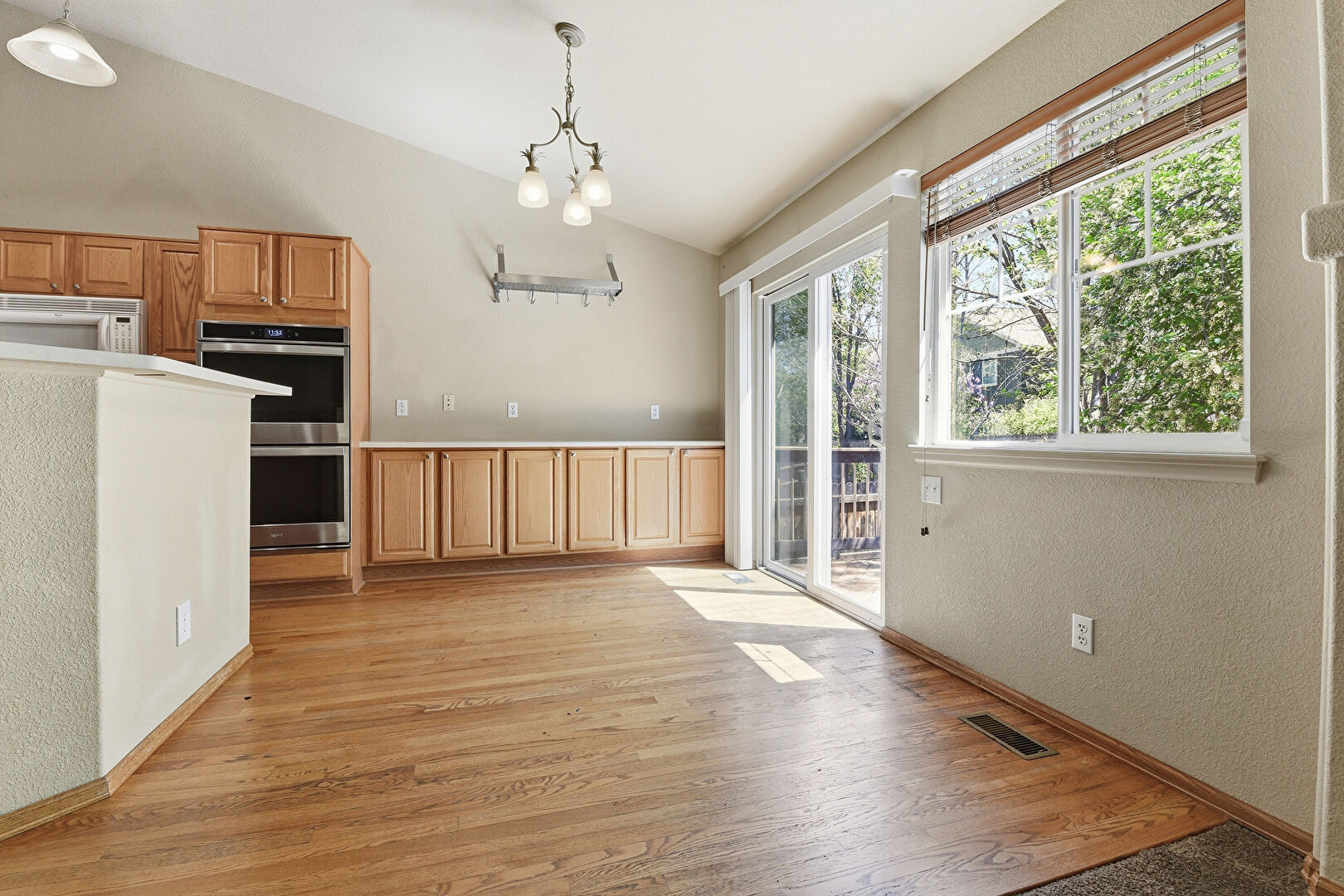 Baseboards Wall, Double Oven, Natural Light, Notable Chandelier, Textured Wall, Vaulted Ceiling, Vent, Wood Finish Floor, High Ceiling