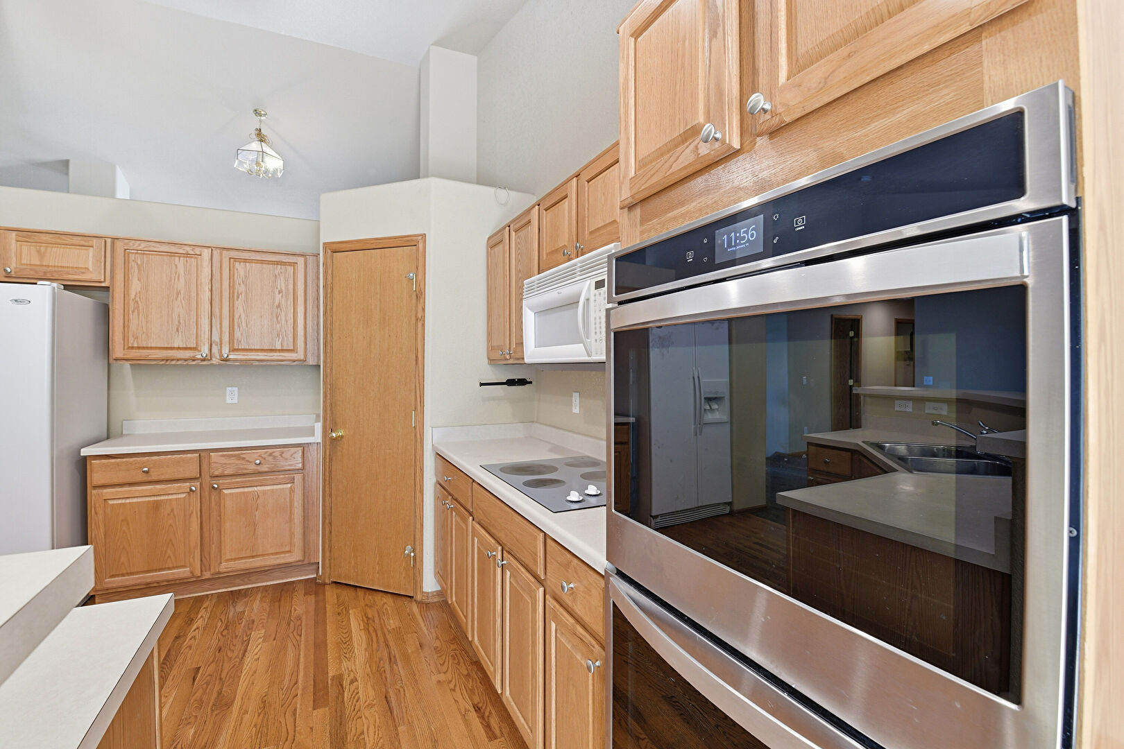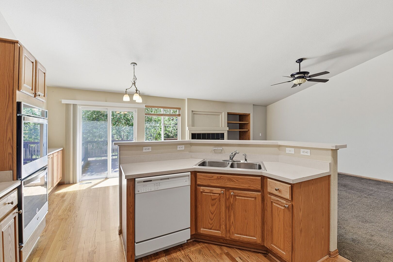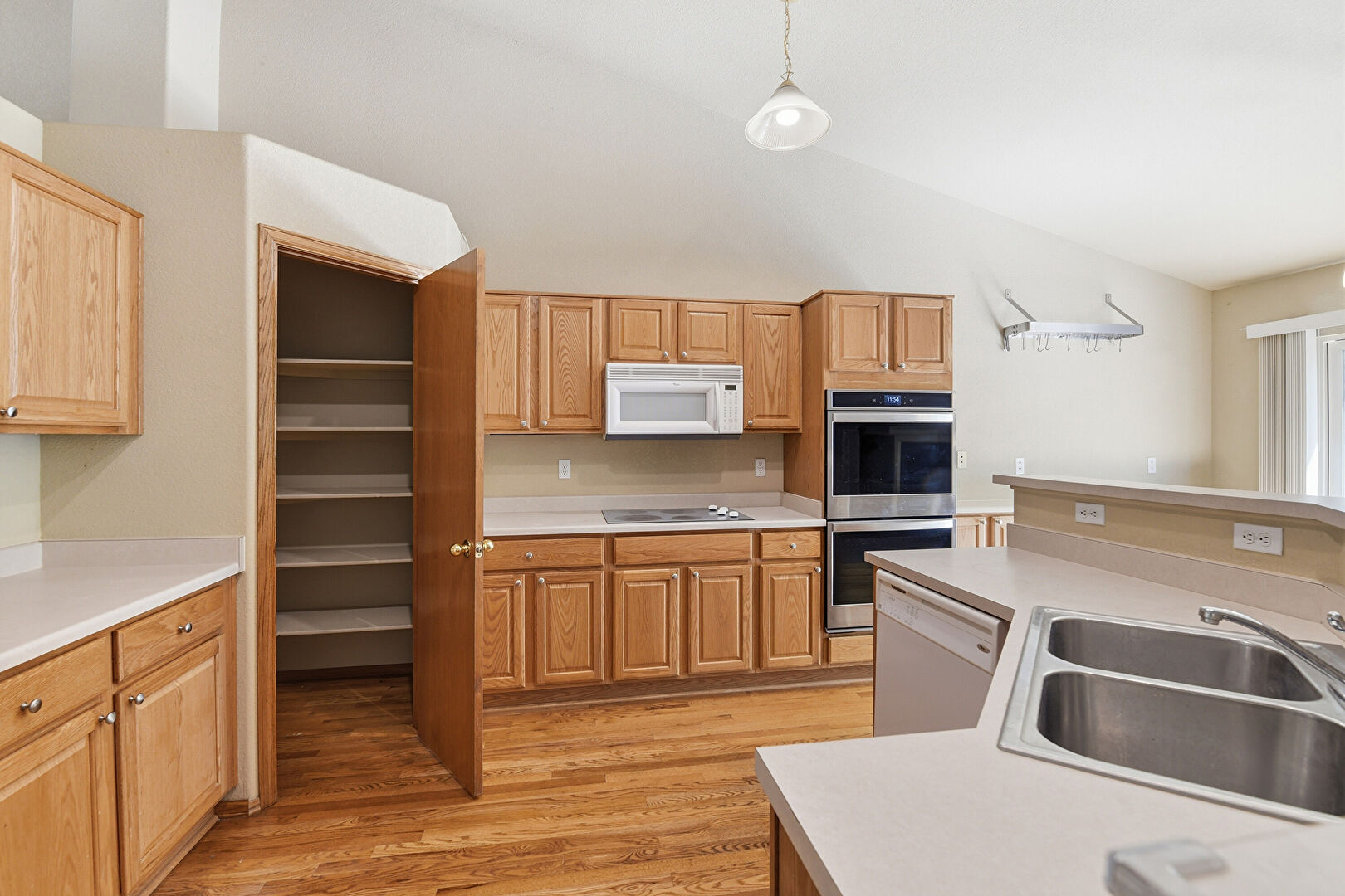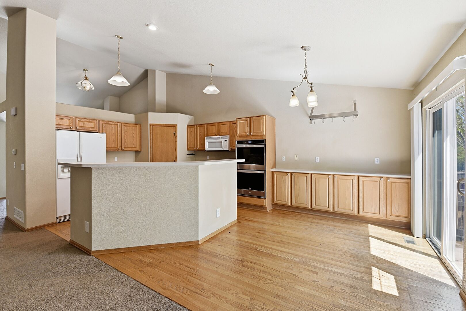 Carpet, Ceiling Fan, Double Oven, Drywall, High Ceiling, Kitchen Island, L Shaped Kitchen, Medium Brown Cabinets, Natural Light, Notable Chandelier, Opens To Living Area, Pendant Lighting, Raised Cabinets, Vaulted Ceiling, Vent, Wood Finish Floor, Double Oven, High Ceiling, Raised Cabinets, Vaulted Ceiling