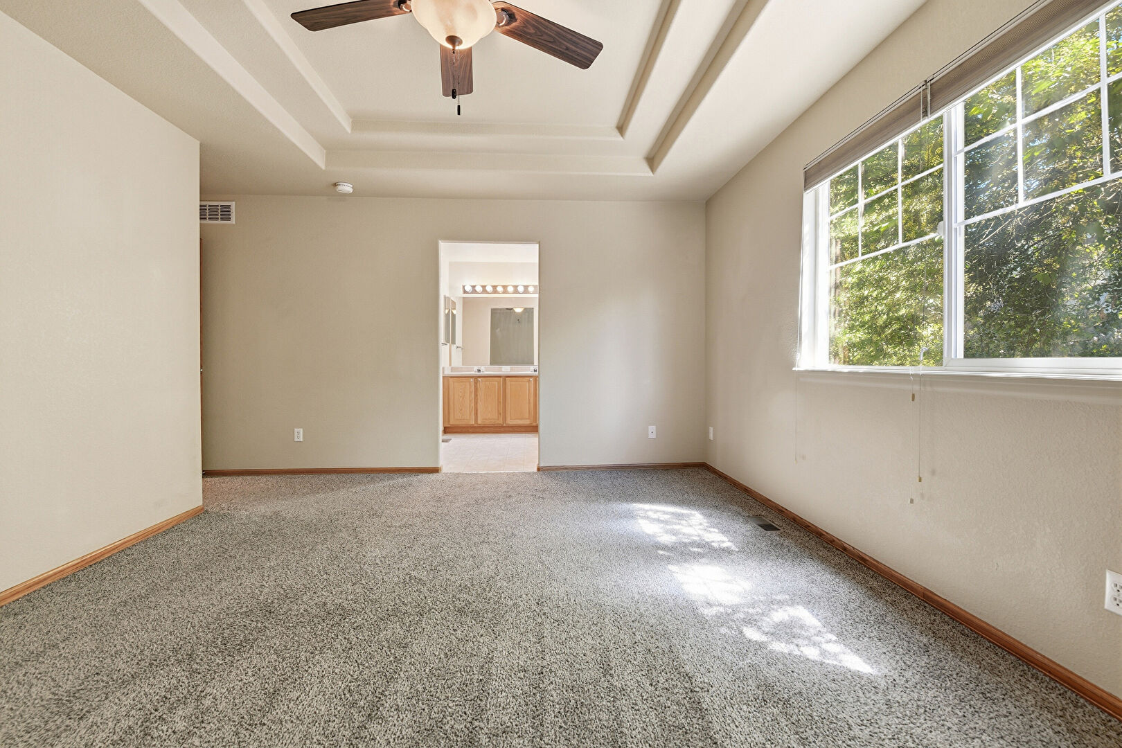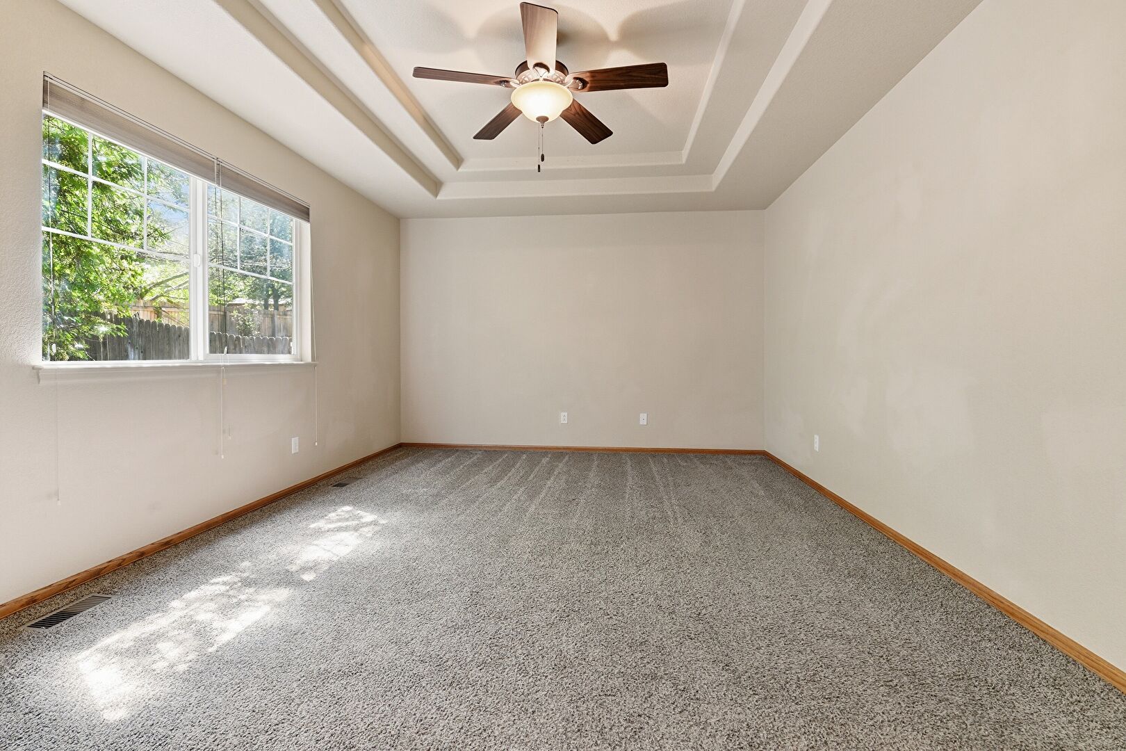 Baseboards Wall, Carpet, Ceiling Fan, Drywall, Natural Light, Tray Ceiling, Vent, Natural Light, Vent