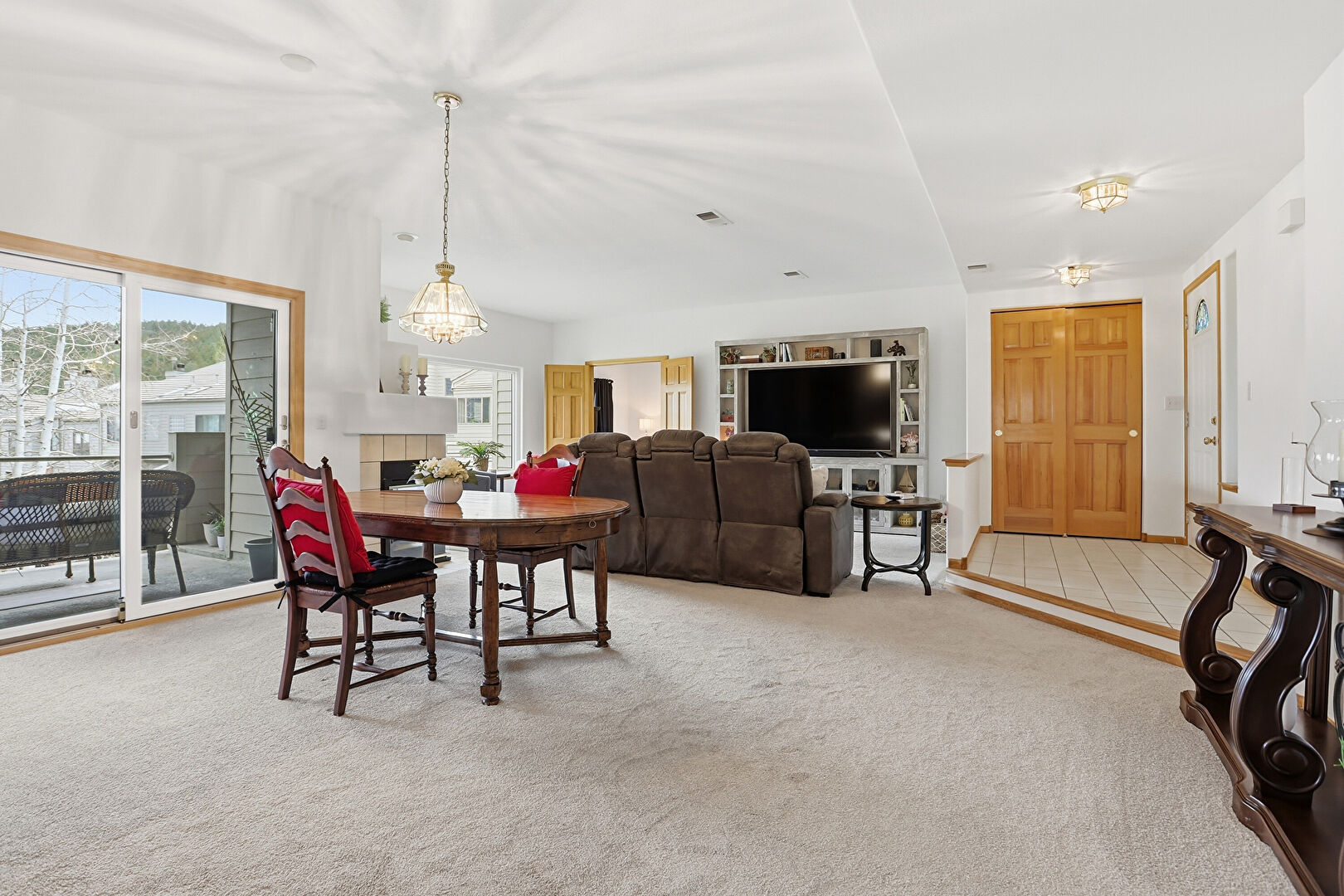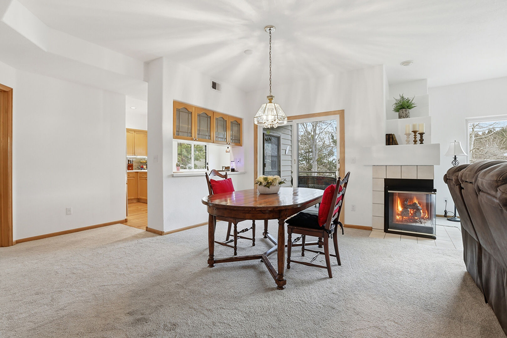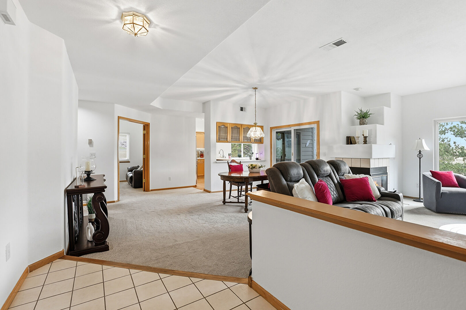 Baseboards Wall, Carpet, Drywall, Fireplace, Natural Light, Notable Chandelier, Tile Floor, Vent, Baseboards Wall, Carpet, Drywall, Tile Floor
