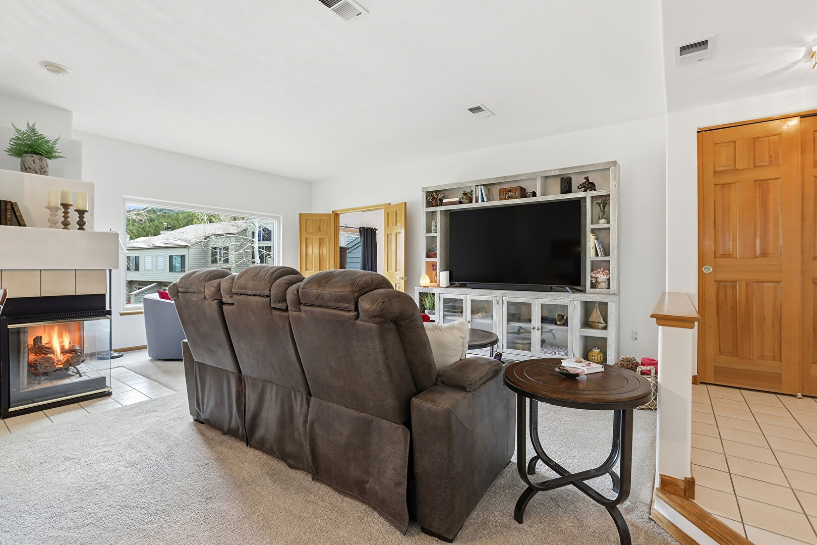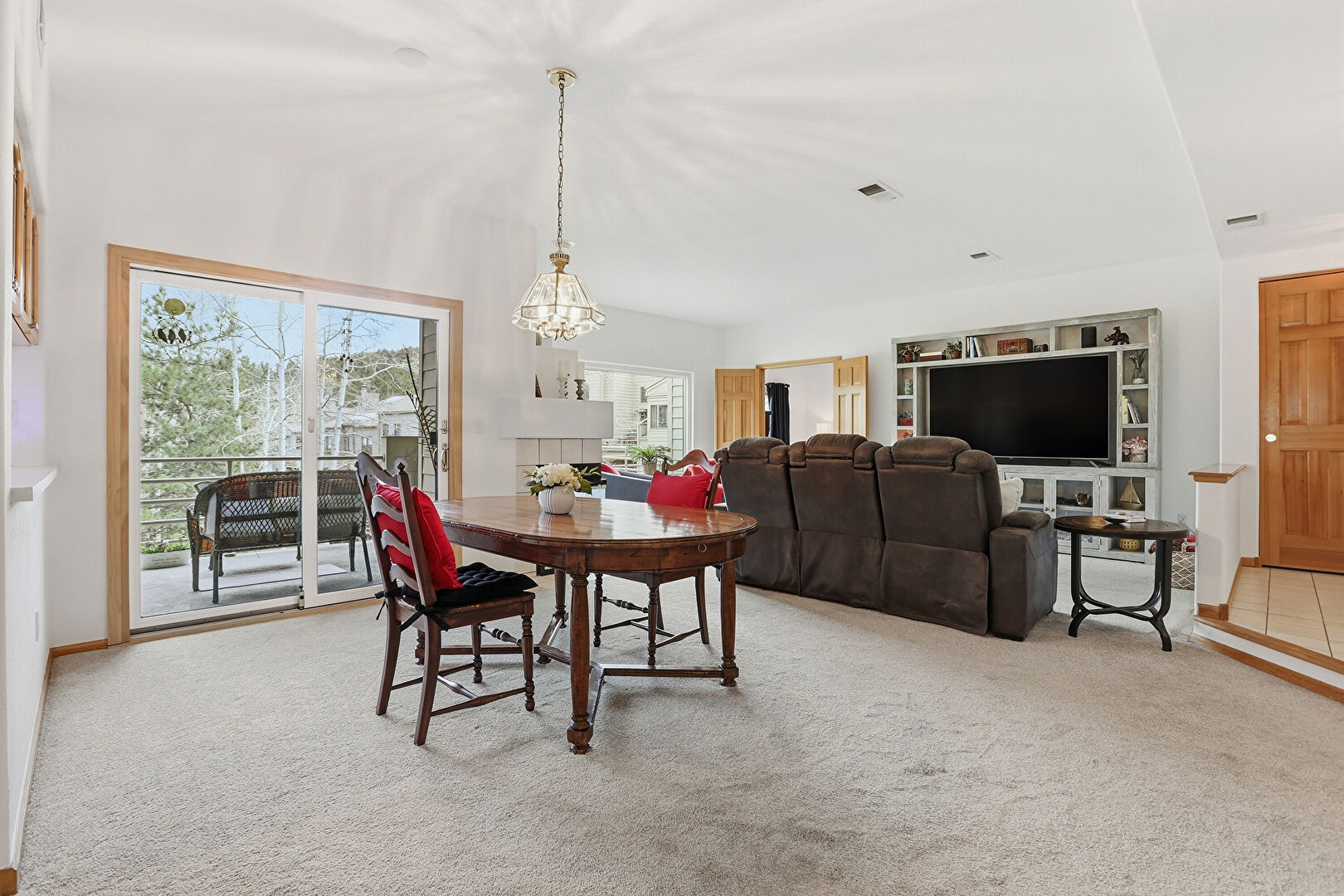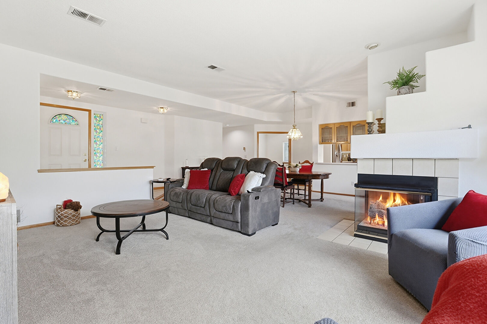 Baseboards Wall, Carpet, Drywall, Fireplace, Natural Light, Notable Chandelier, Tile Floor, Vent, Baseboards Wall, Carpet, Drywall, Tile Floor