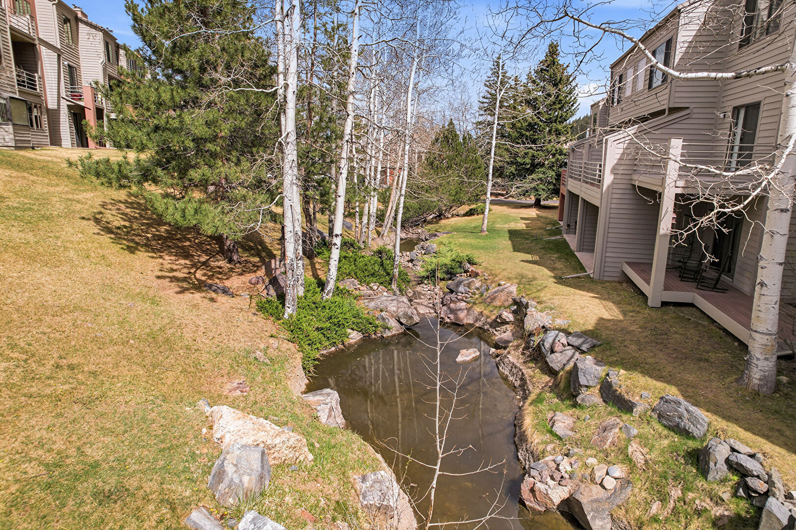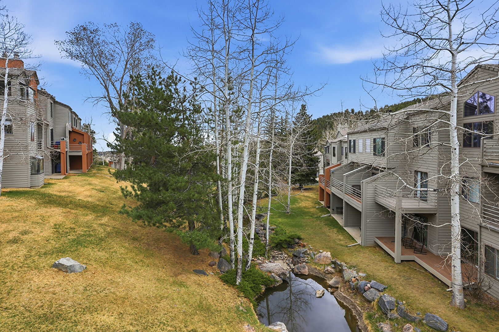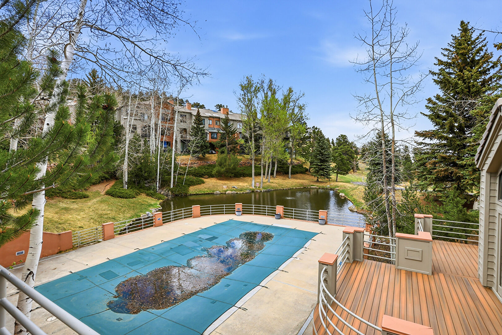 Apartment Complex View, Chimney, Deck, Horizontal Siding, Water View, Lawn