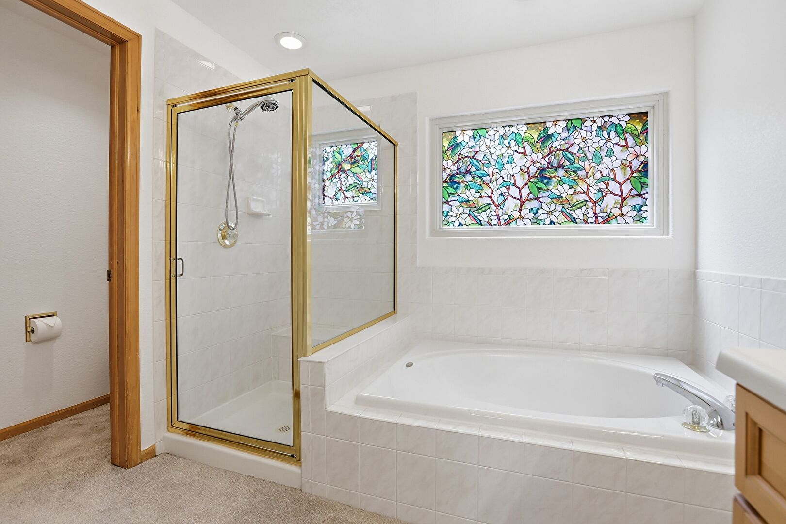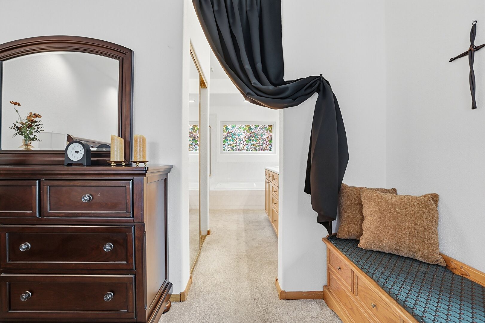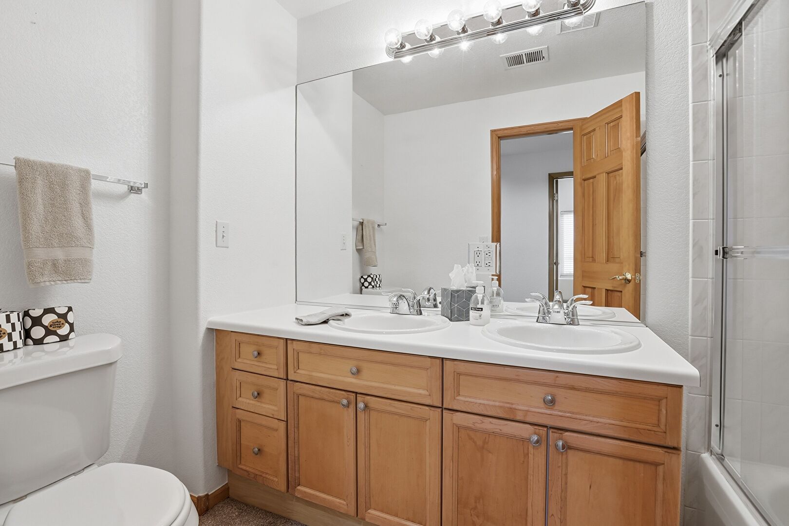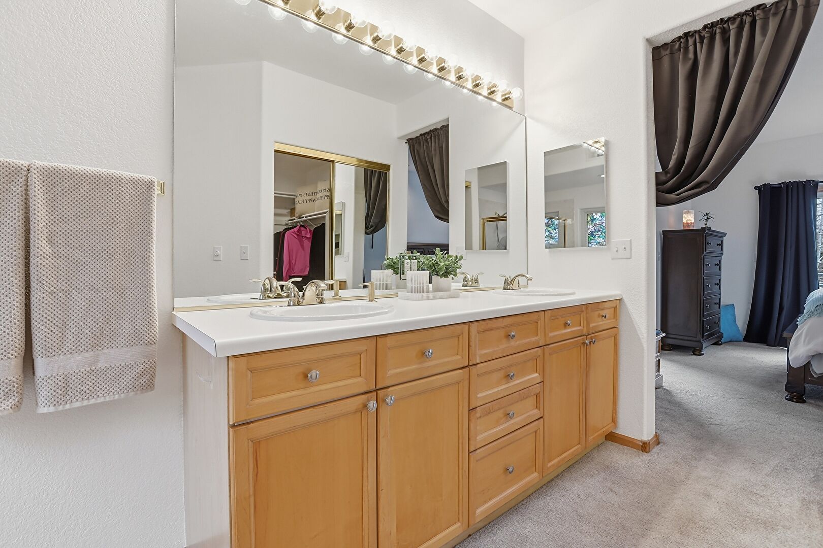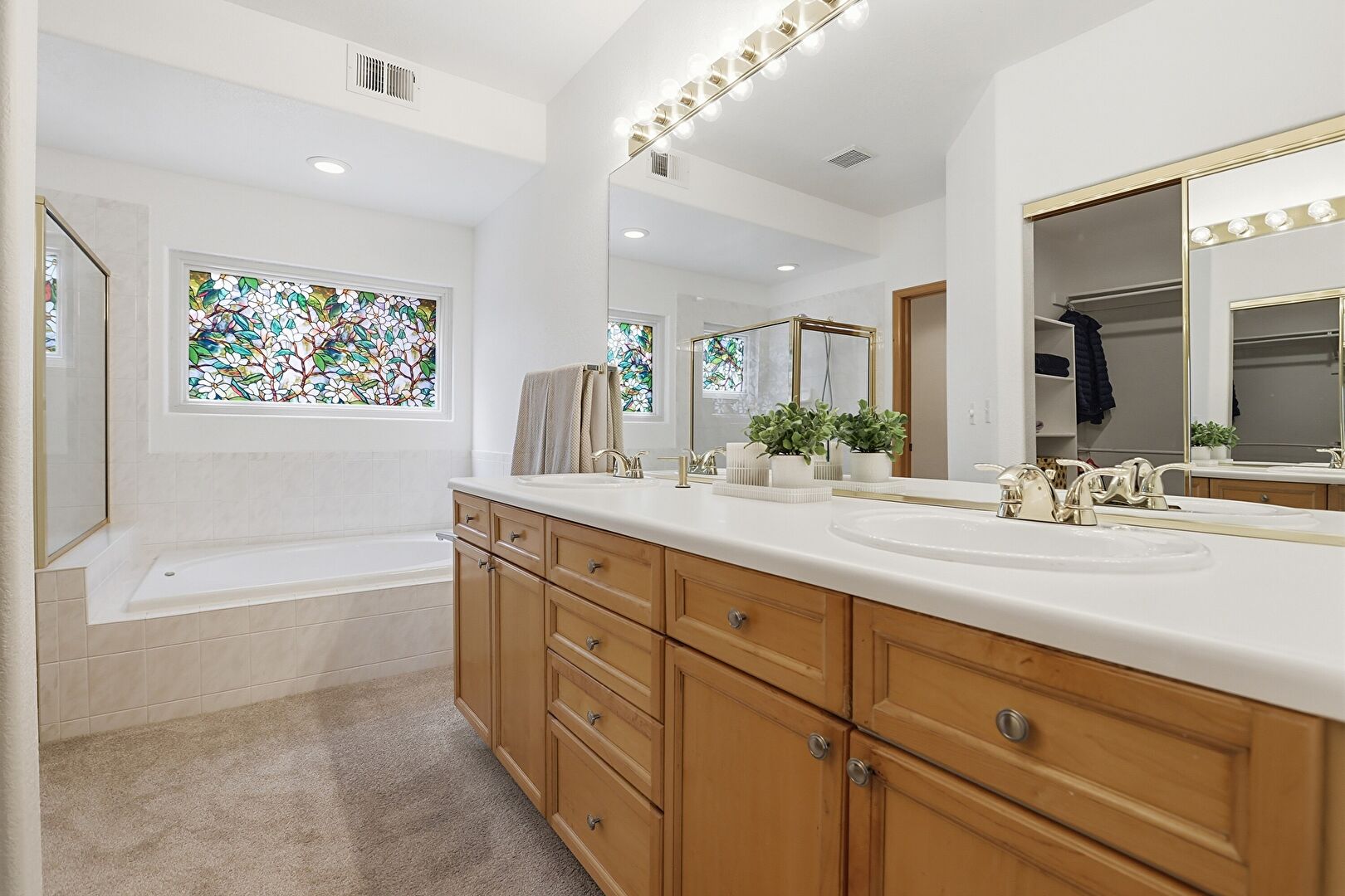Baseboards Wall, Carpet, Combined Bath Shower, Double Vanity, Drywall, Ensuite Bathroom, Full Bathroom, Natural Light, Textured Wall, Vanity, Vent, Walk In Closet, Combined Bath Shower, Recessed Lighting, Textured Wall, Vanity