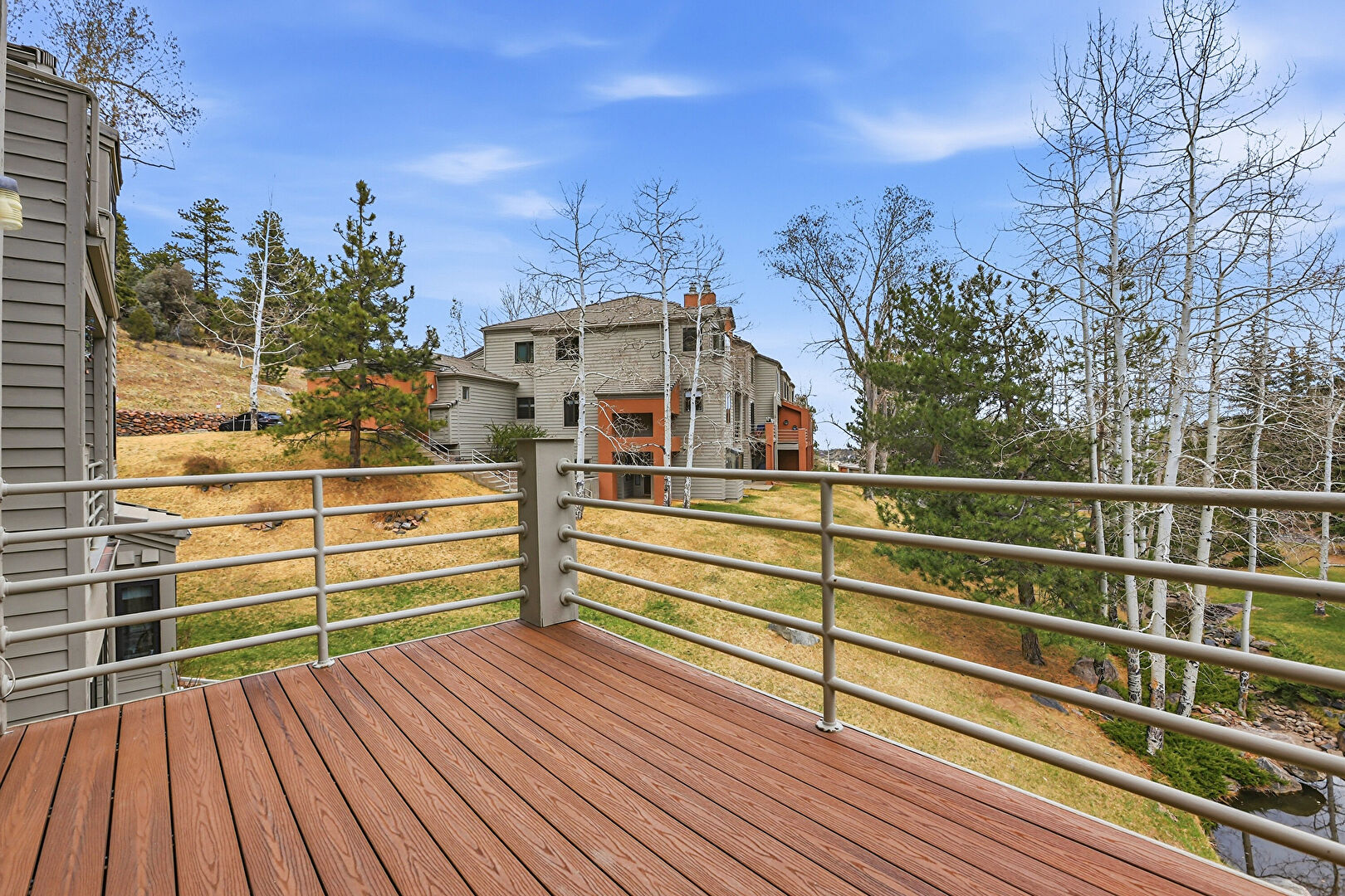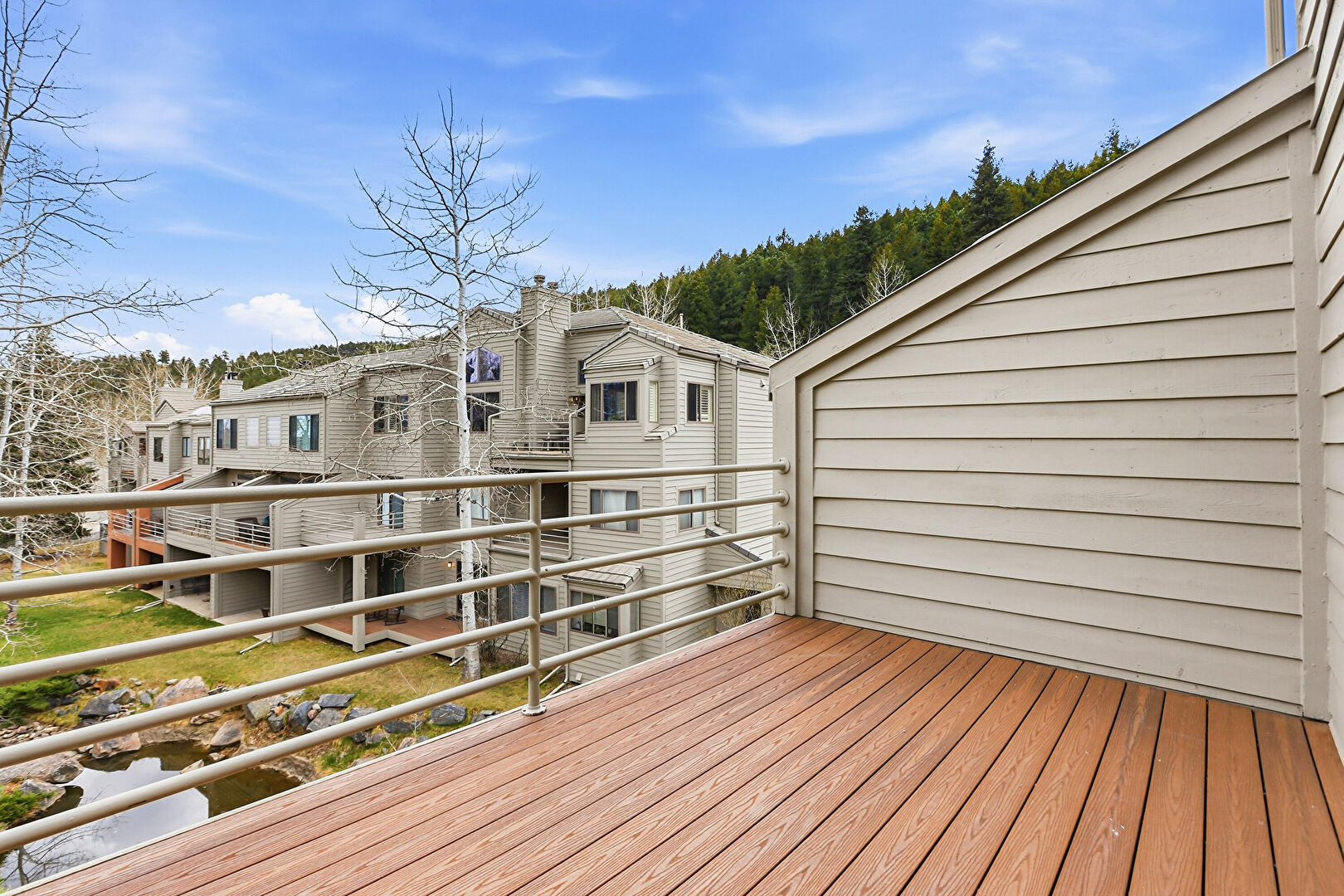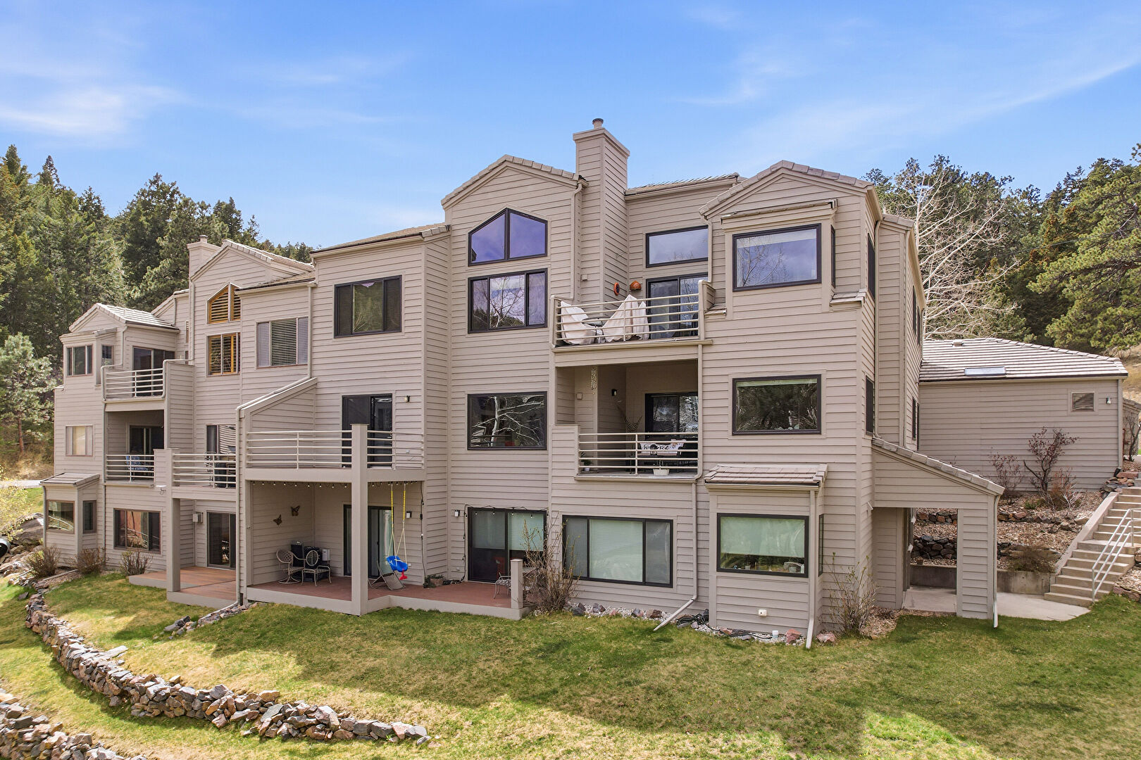 Apartment Complex View, Balcony, Chimney, Deck, Horizontal Siding, Lawn, Patio, Stairs, Woods View, Balcony, Downspout
