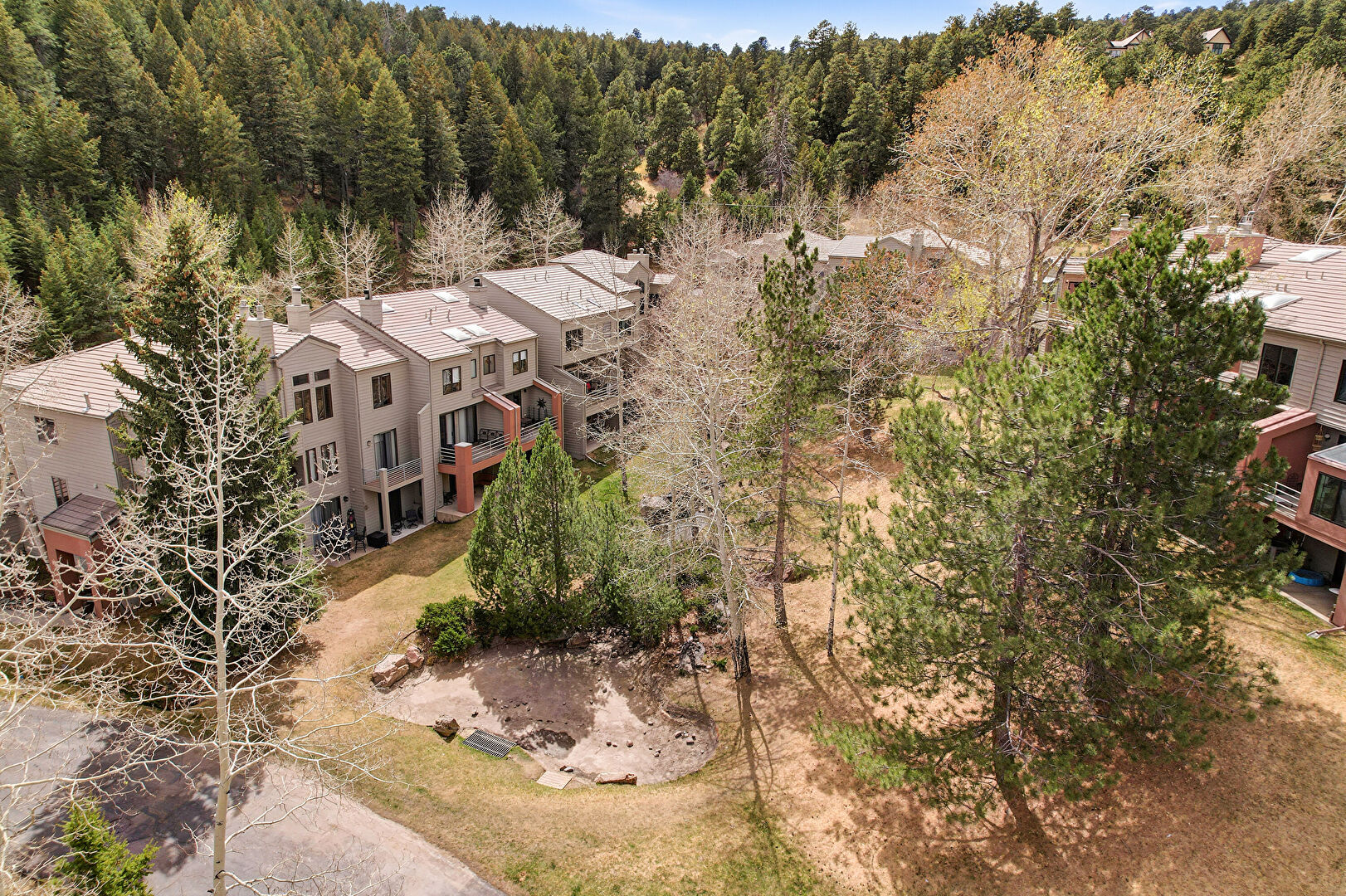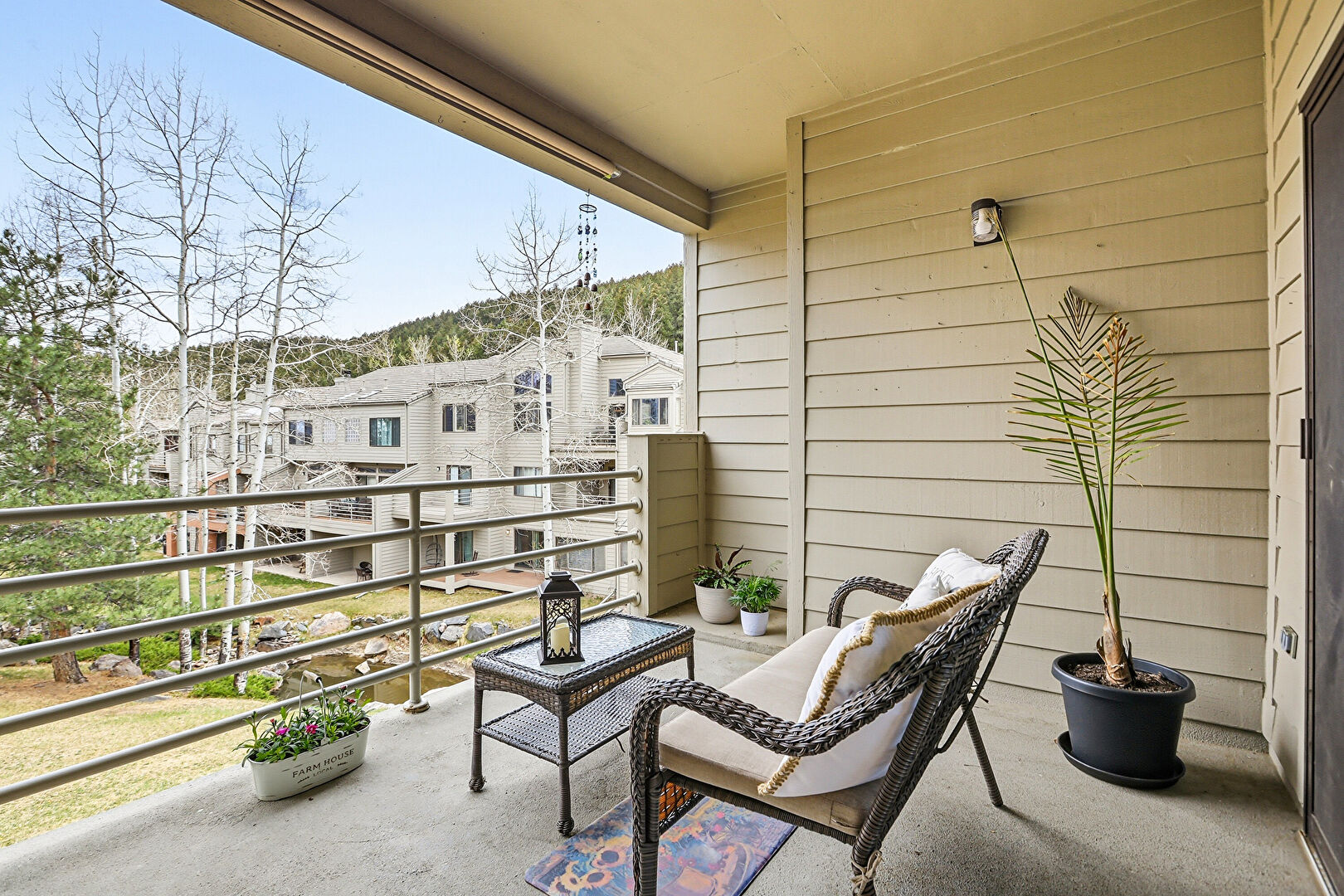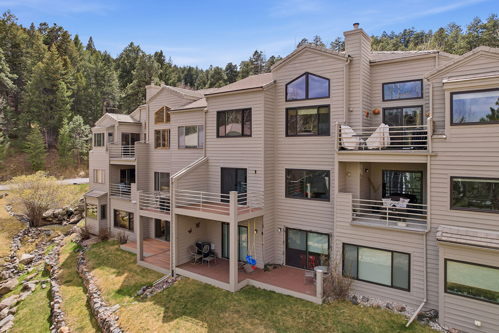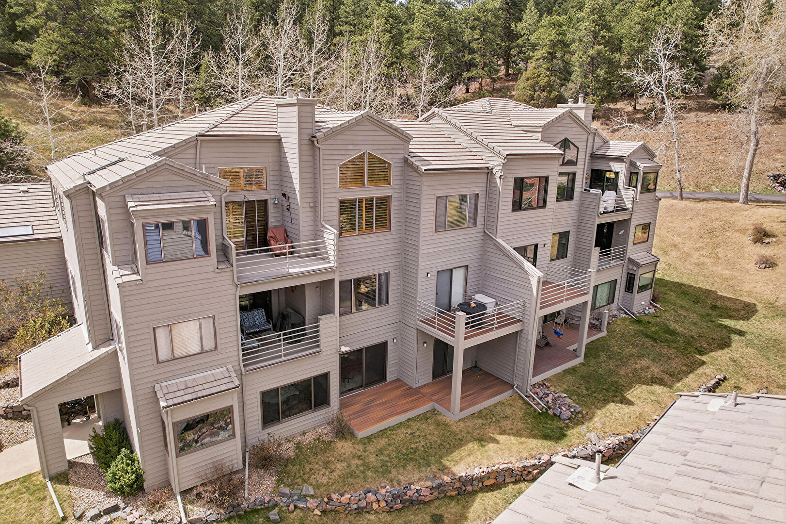 Apartment Complex View, Balcony, Chimney, Deck, Horizontal Siding, Lawn, Patio, Stairs, Woods View, Balcony, Downspout