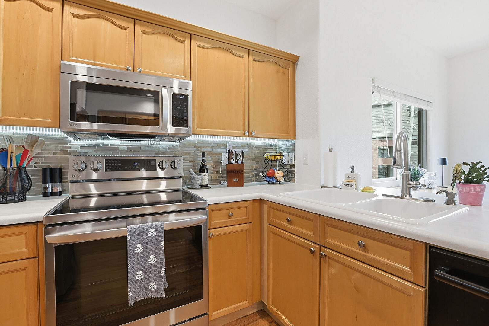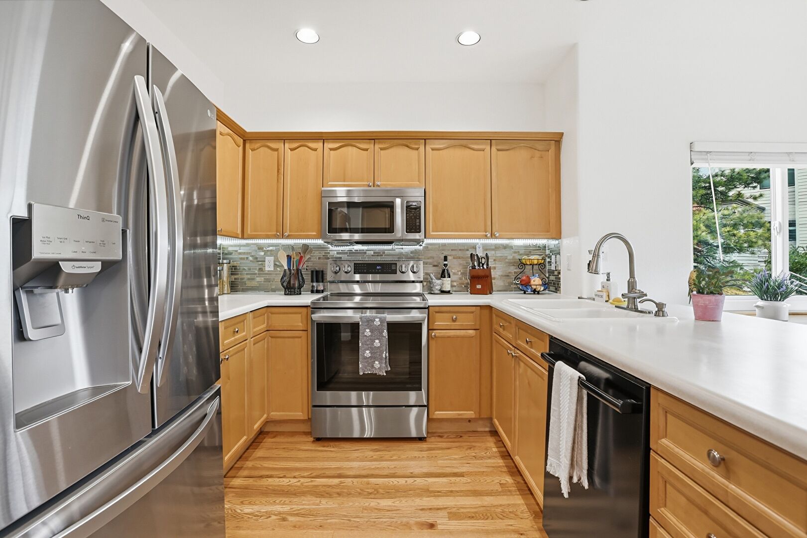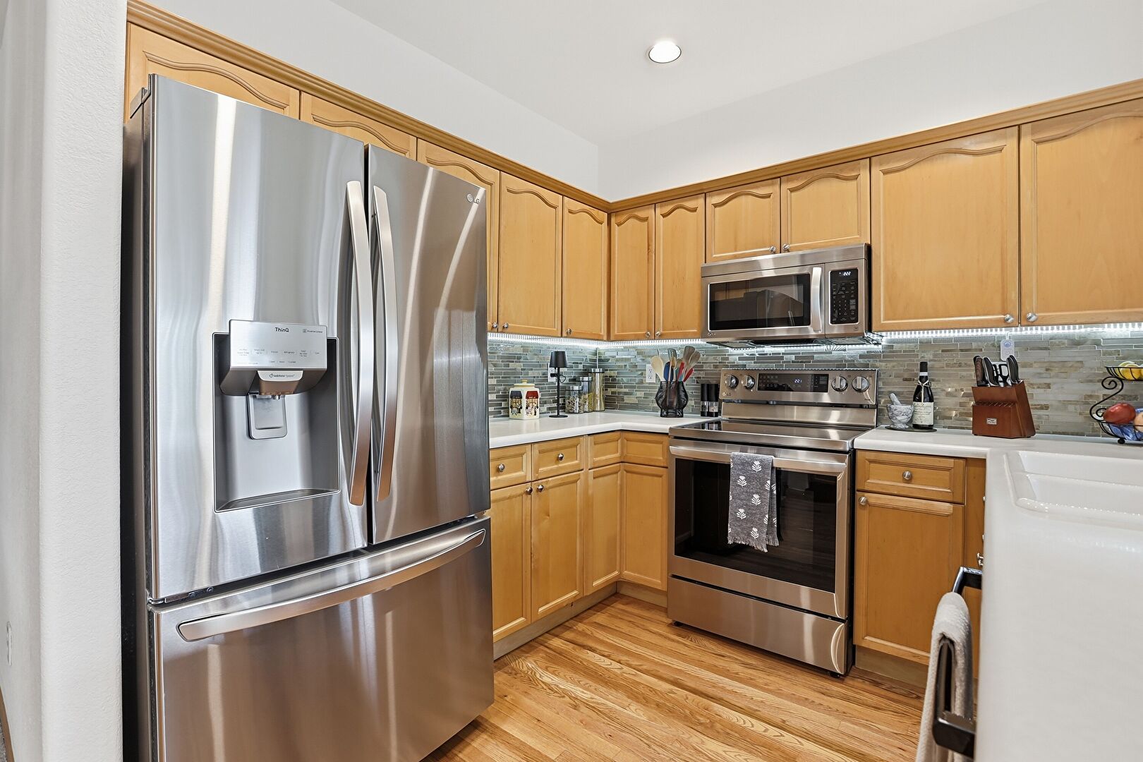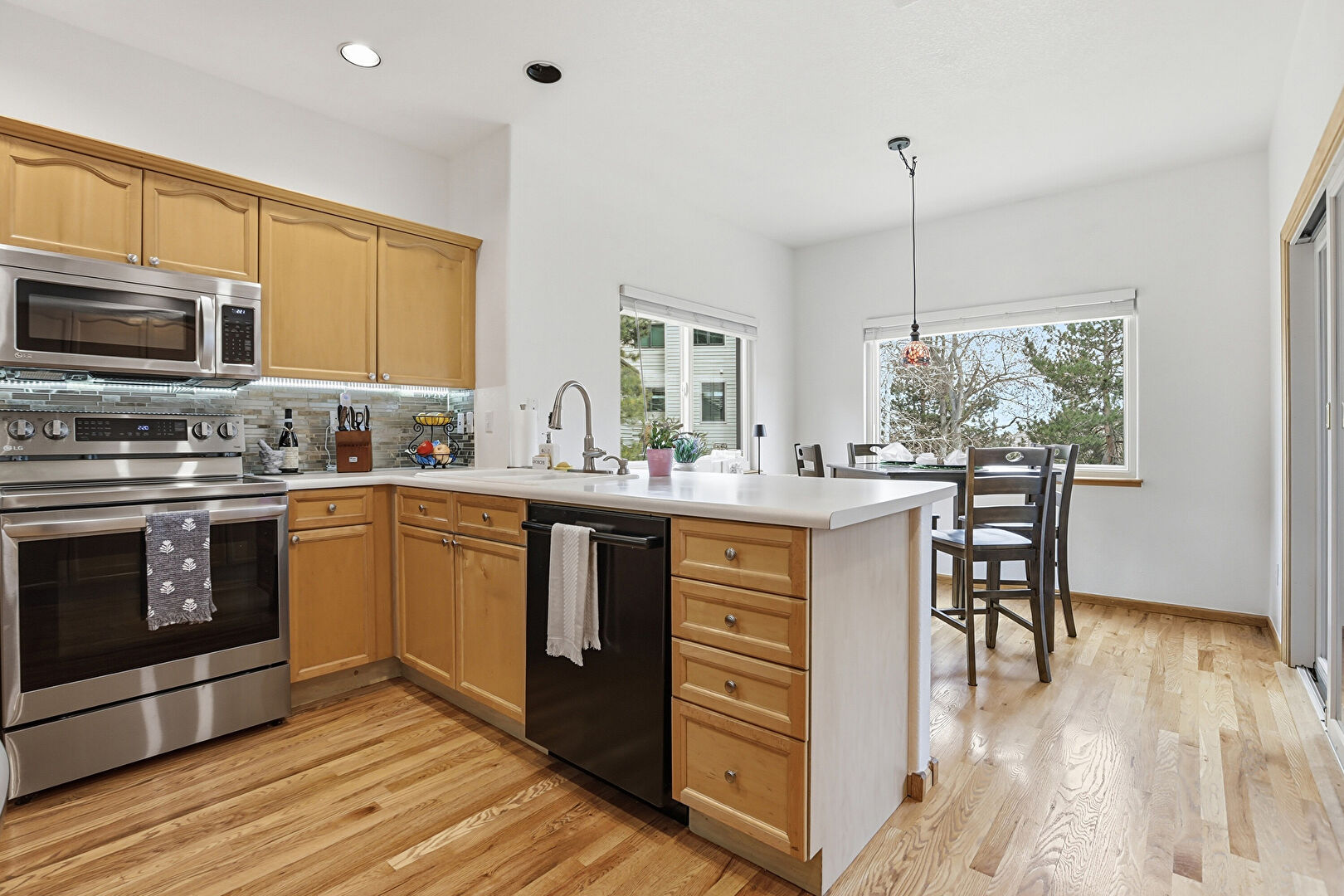 Arched Cabinets, Baseboards Wall, Crown Molding Cabinets, Drywall, Kitchen Peninsula, Medium Brown Cabinets, Natural Light, Pendant Lighting, Recessed Lighting, Shaker Cabinets, Wood Finish Floor, Crown Molding Cabinets, Shaker Cabinets, Wood Finish Floor
