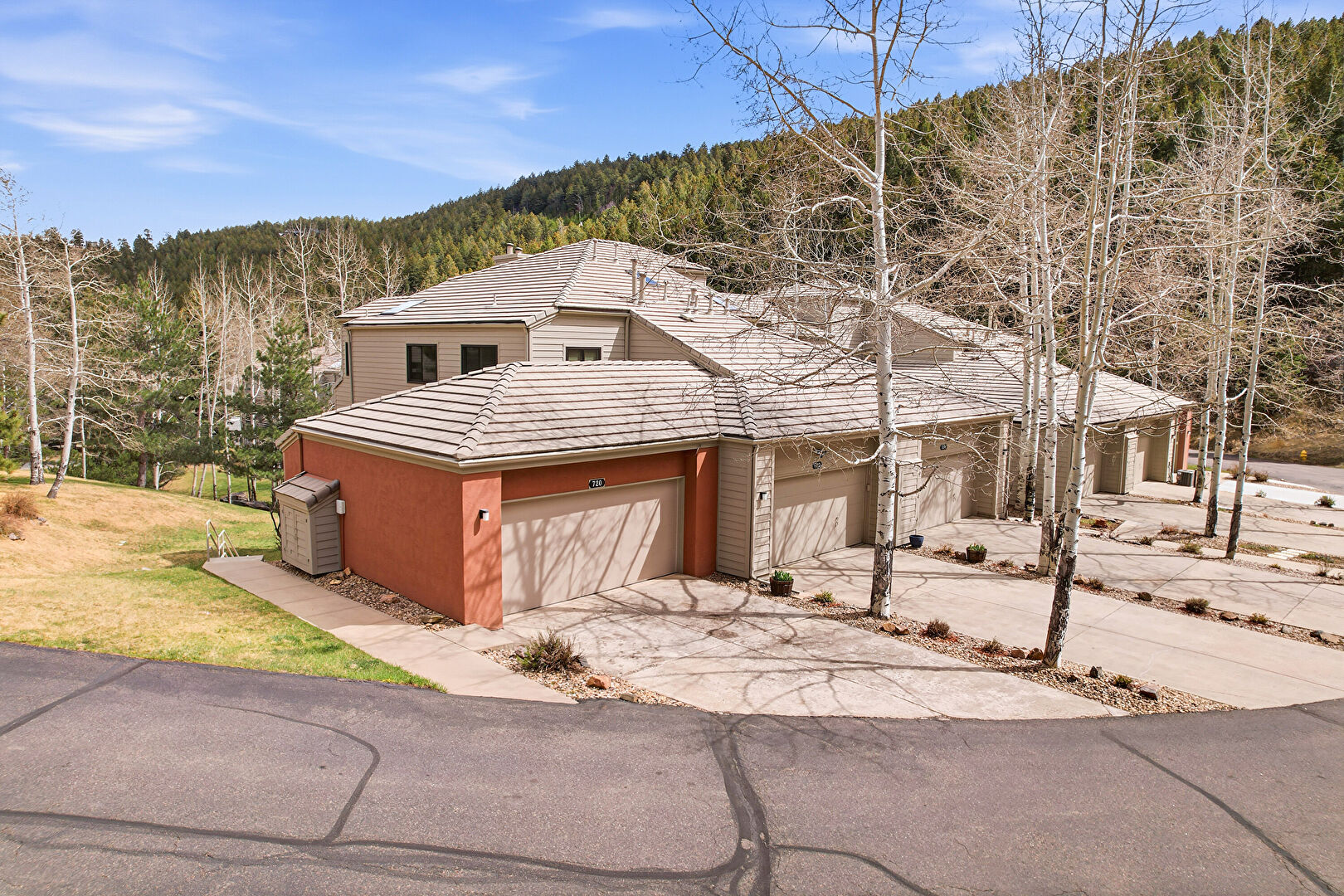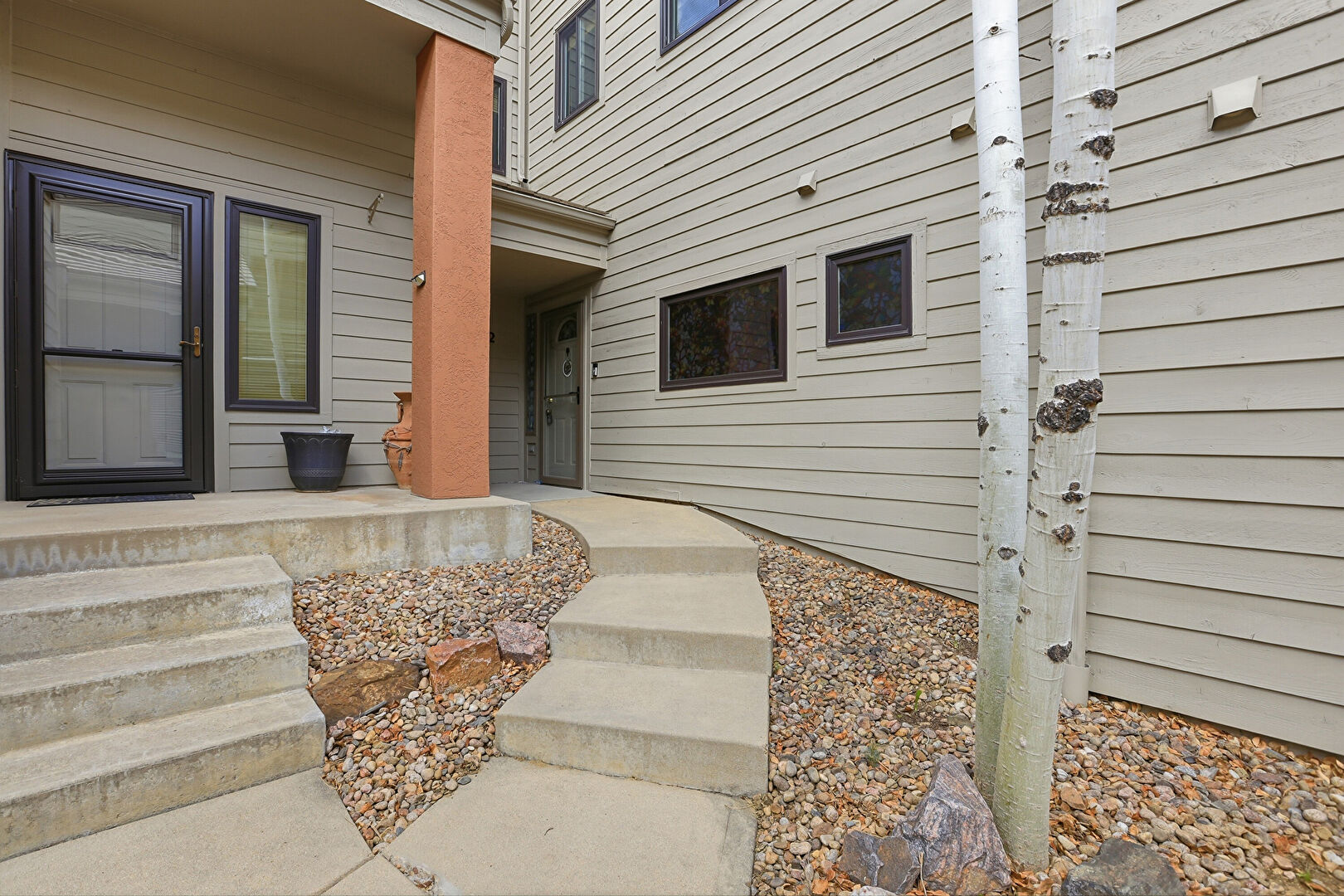 Concrete Foundation, Driveway, Forest View, Gutters, Horizontal Siding, Lawn, Stoop, Stucco Siding, Tile Roof, Downspout, Driveway, Garage, Gutters, Horizontal Siding, Tile Roof