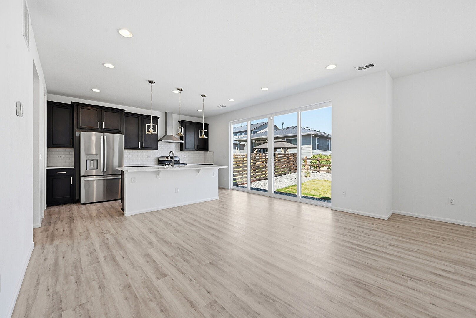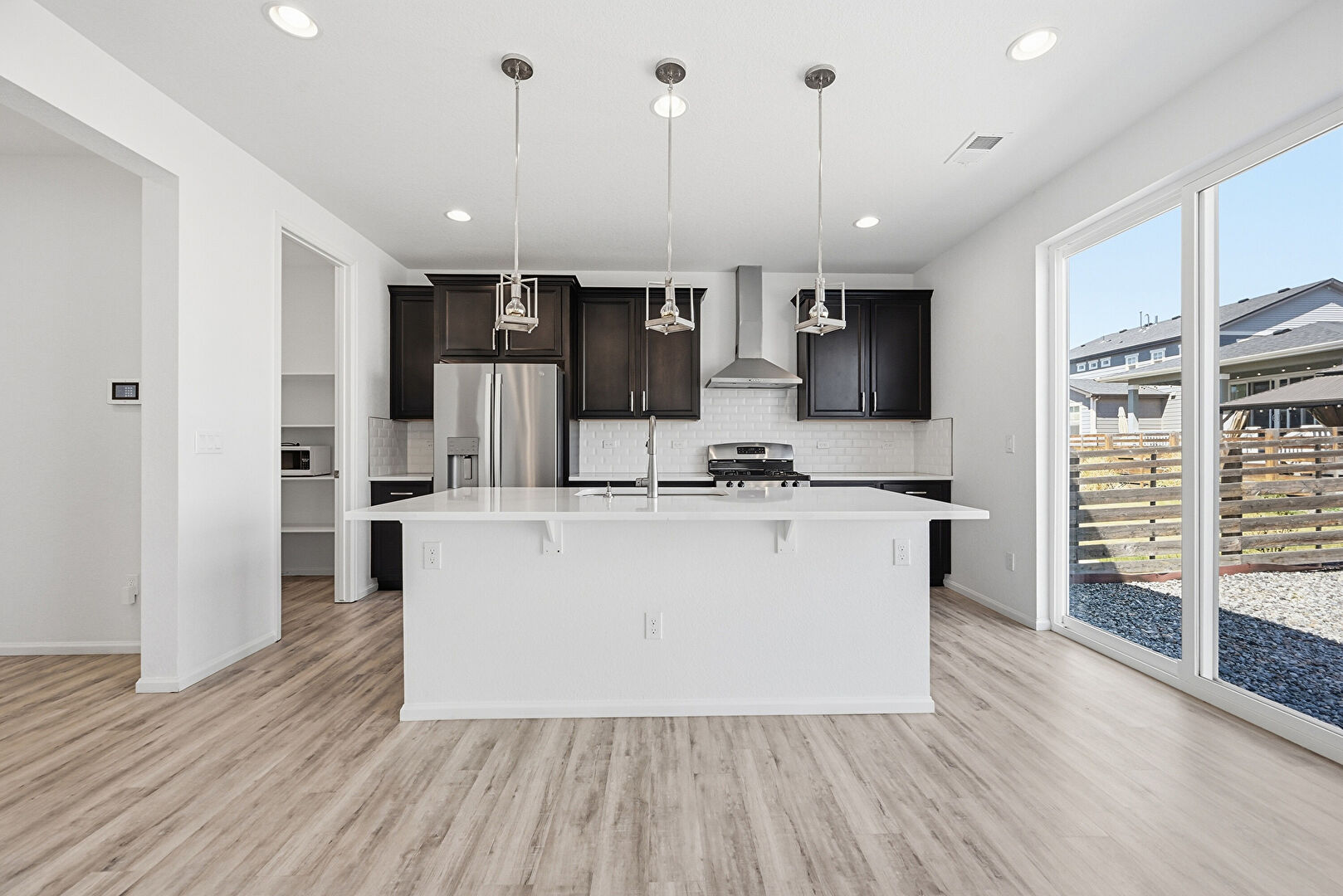 Baseboards Wall, Crown Molding Cabinets, Dark Brown Cabinets, Drywall, Kitchen Bar, Kitchen Island, Natural Light, One Wall Kitchen, Opens To Living Area, Pendant Lighting, Recessed Lighting, Shaker Cabinets, Stone Countertops, Vent, Wood Finish Floor, Black Cabinets, Shaker Cabinets, Stone Countertops, Vent