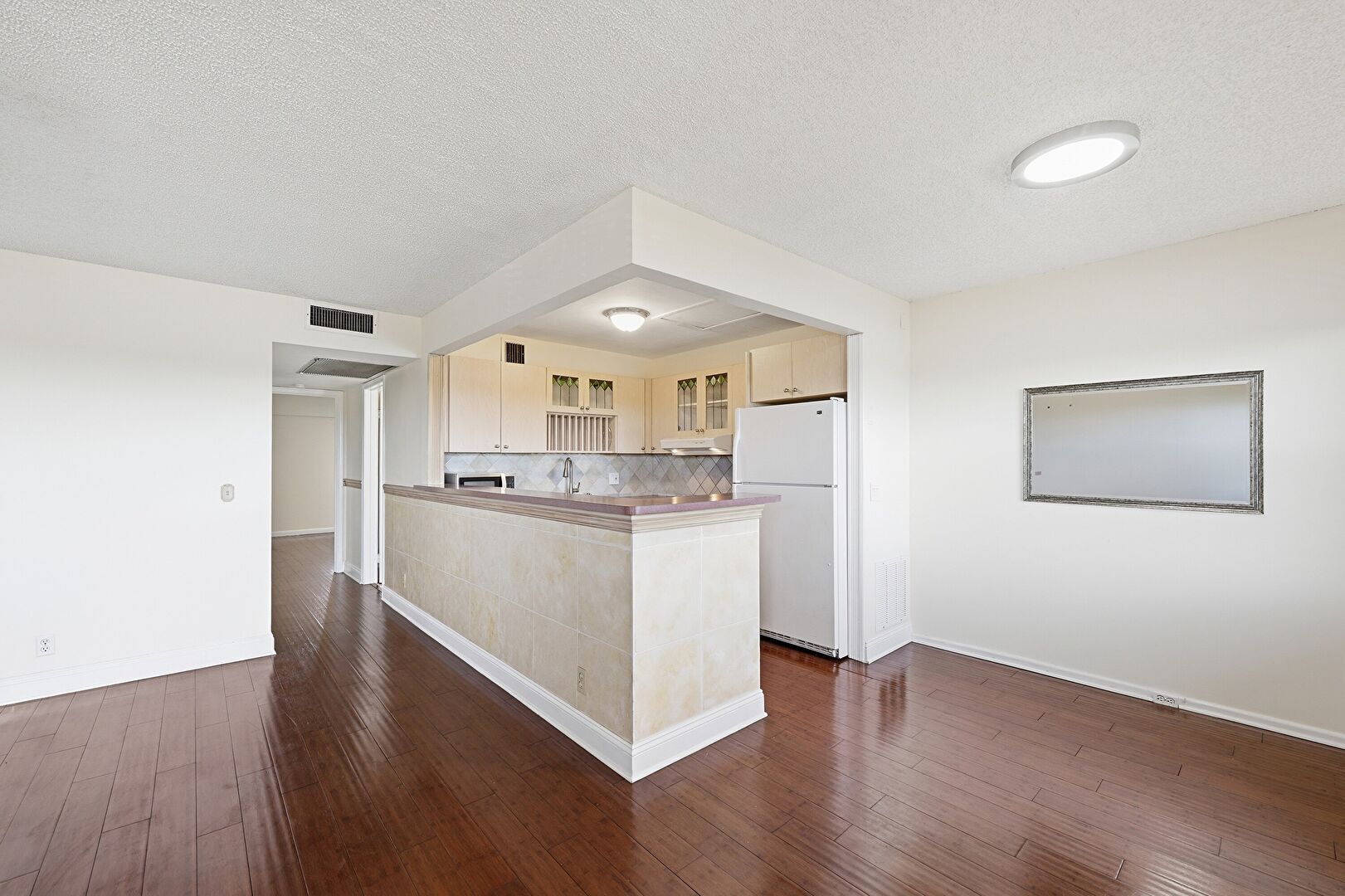 Drywall, Glass Insert Cabinets, Kitchen Bar, Kitchen Peninsula, Open Shelves, Opens To Living Area, Textured Ceiling, U Shaped Kitchen, Vent, Wood Finish Floor, Baseboards Wall, Glass Insert Cabinets