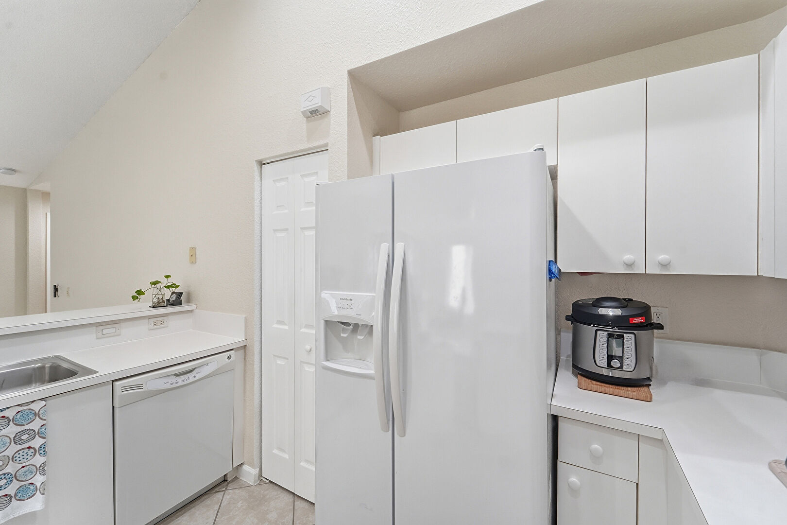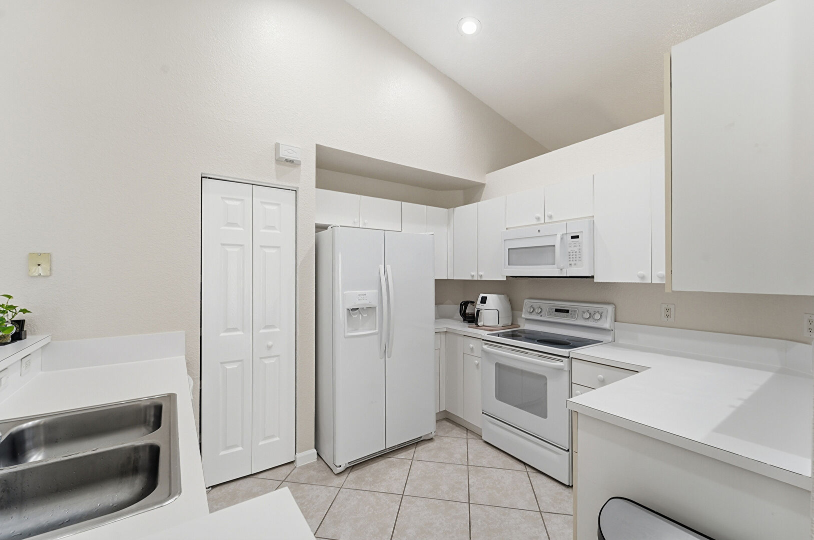 Baseboards Wall, Ceiling Fan, Drywall, Galley Kitchen, High Ceiling, Natural Light, Recessed Lighting, Textured Ceiling, Tile Floor, Vaulted Ceiling, Tile Floor, Vent