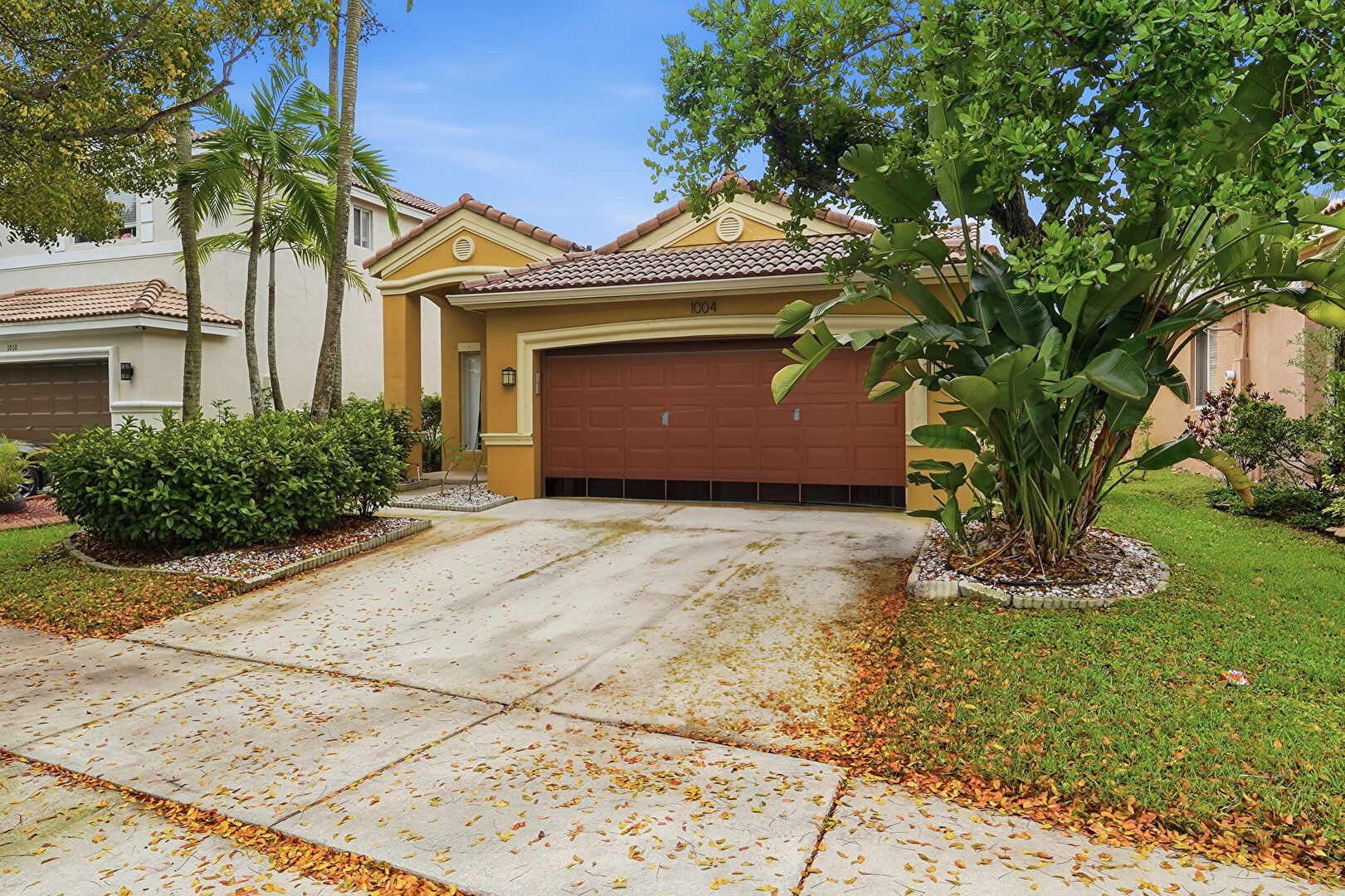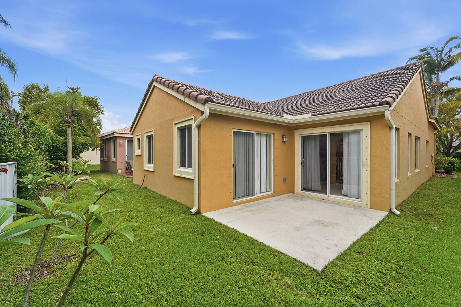 Downspout, Gutters, Patio, Stucco Siding, Tile Roof, Lawn