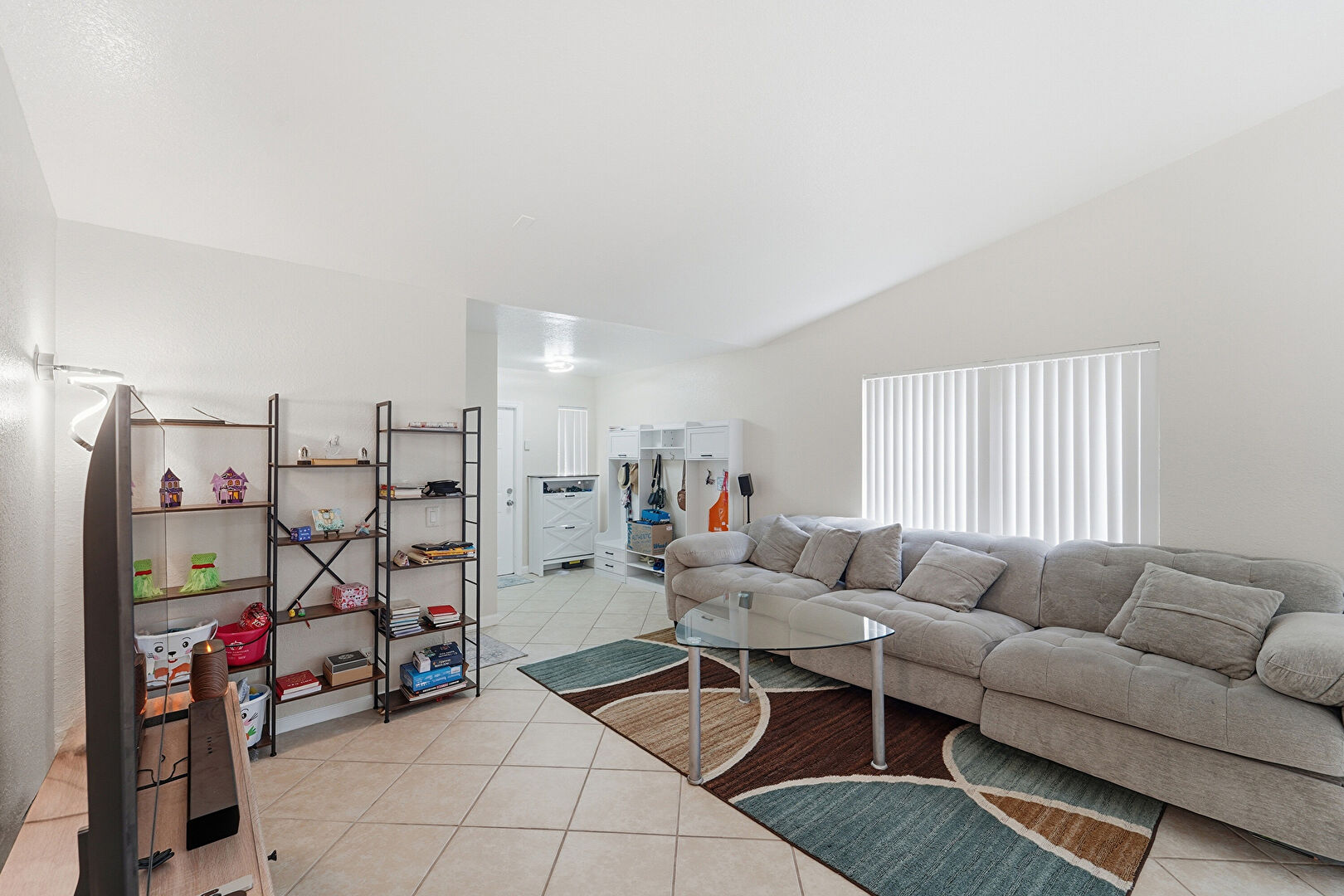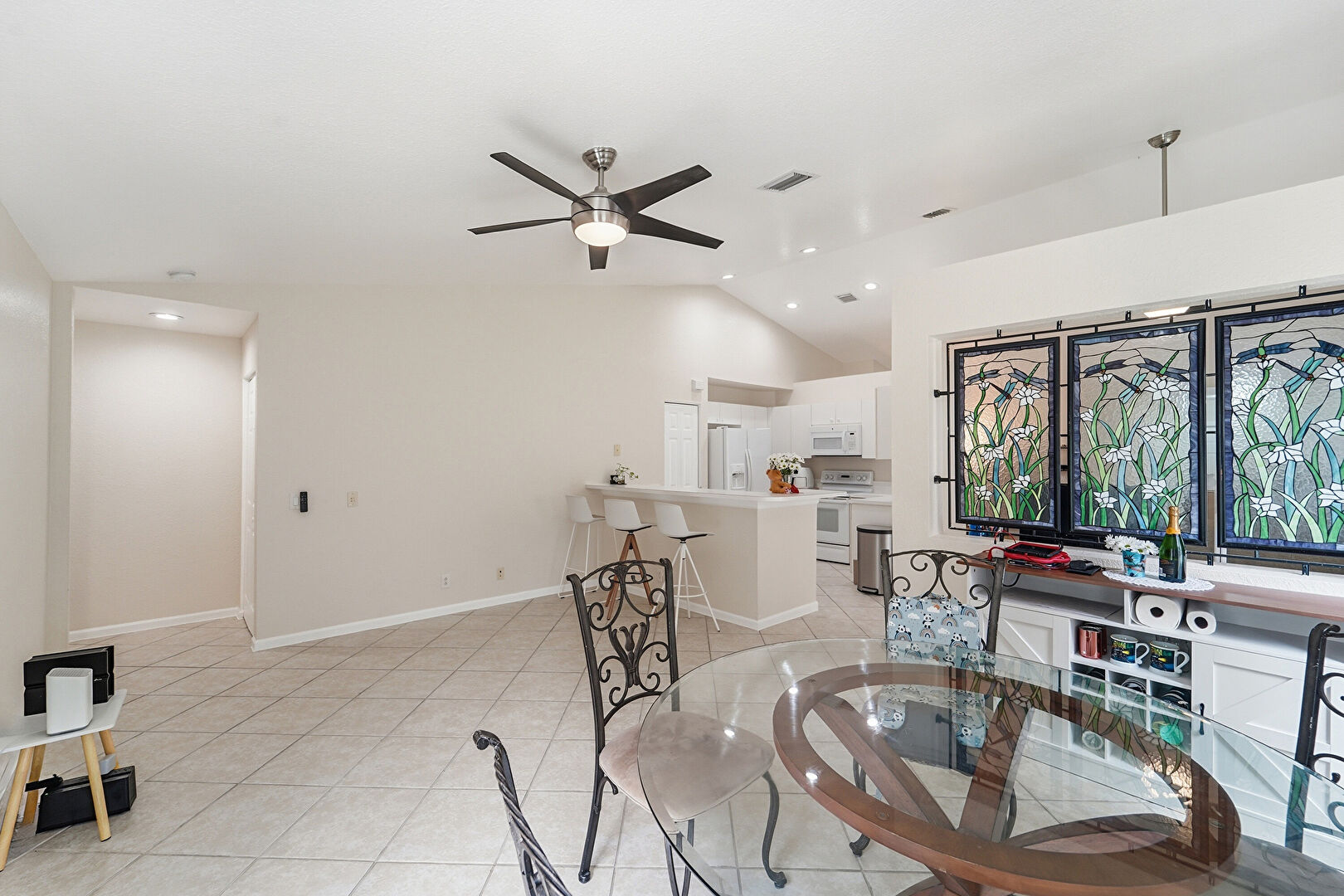 Baseboards Wall, Ceiling Fan, Drywall, Natural Light, Tile Floor, Vaulted Ceiling, Vent, Drywall, Natural Light