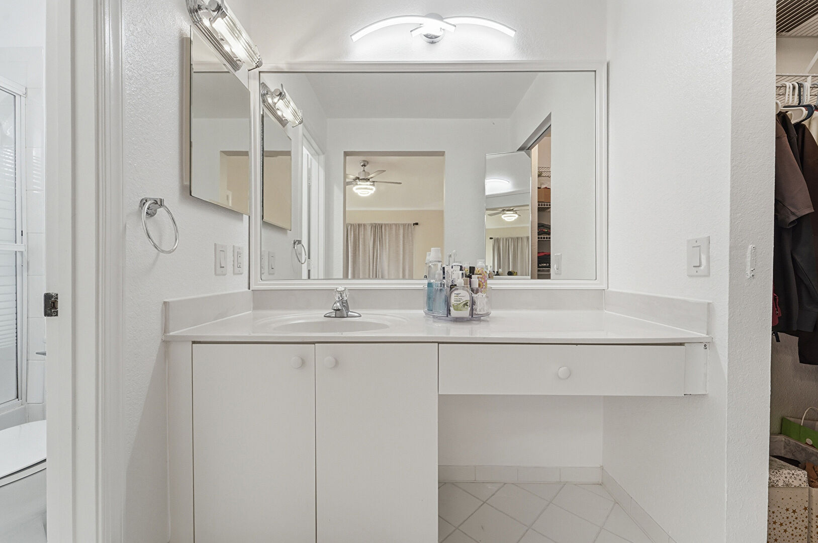 Baseboards Wall, Ceiling Fan, Combined Bath Shower, Drywall, Full Bathroom, Vanity, Walk In Closet, Natural Light, Tile Floor