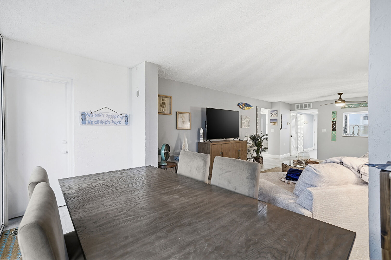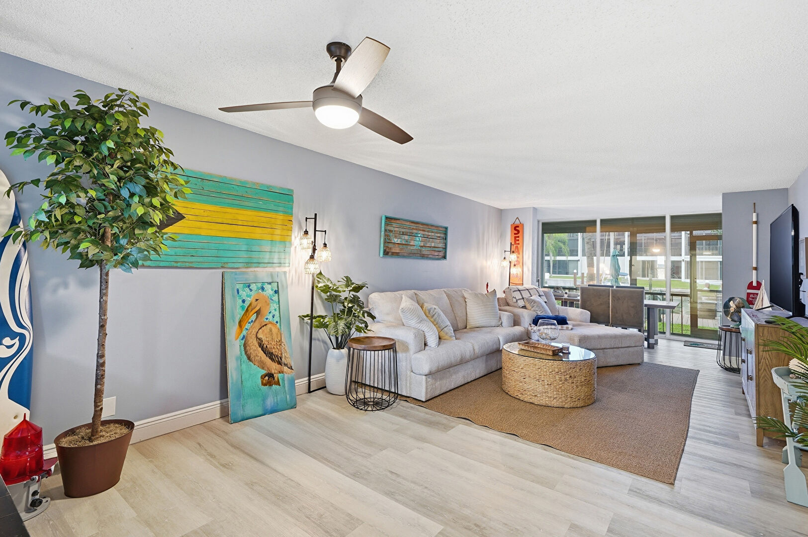 Baseboards Wall, Ceiling Fan, Drywall, Natural Light, Textured Ceiling, Textured Wall, Vent, Wood Finish Floor, Drywall, Floor Ceiling Windows, Wood Finish Floor