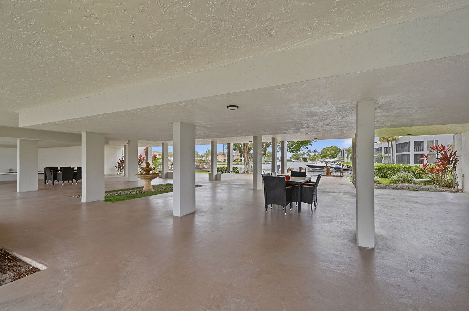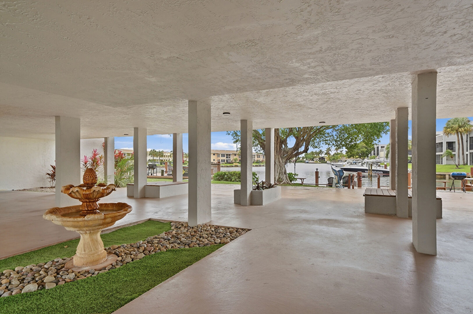 Dock, Grill, Lawn, Outdoor Dining Area, Patio, Residential View, Water View, Waterfront, Waterfront Bulkhead, Dock, Fountain, Outdoor Kitchen