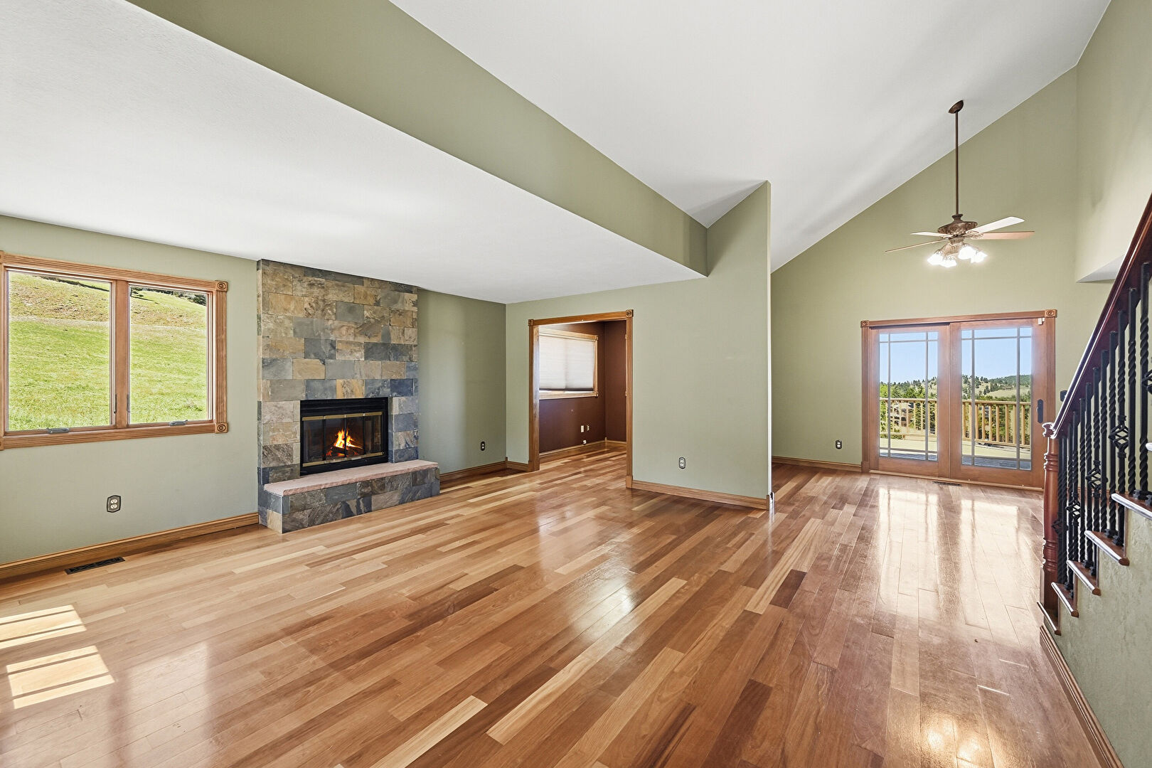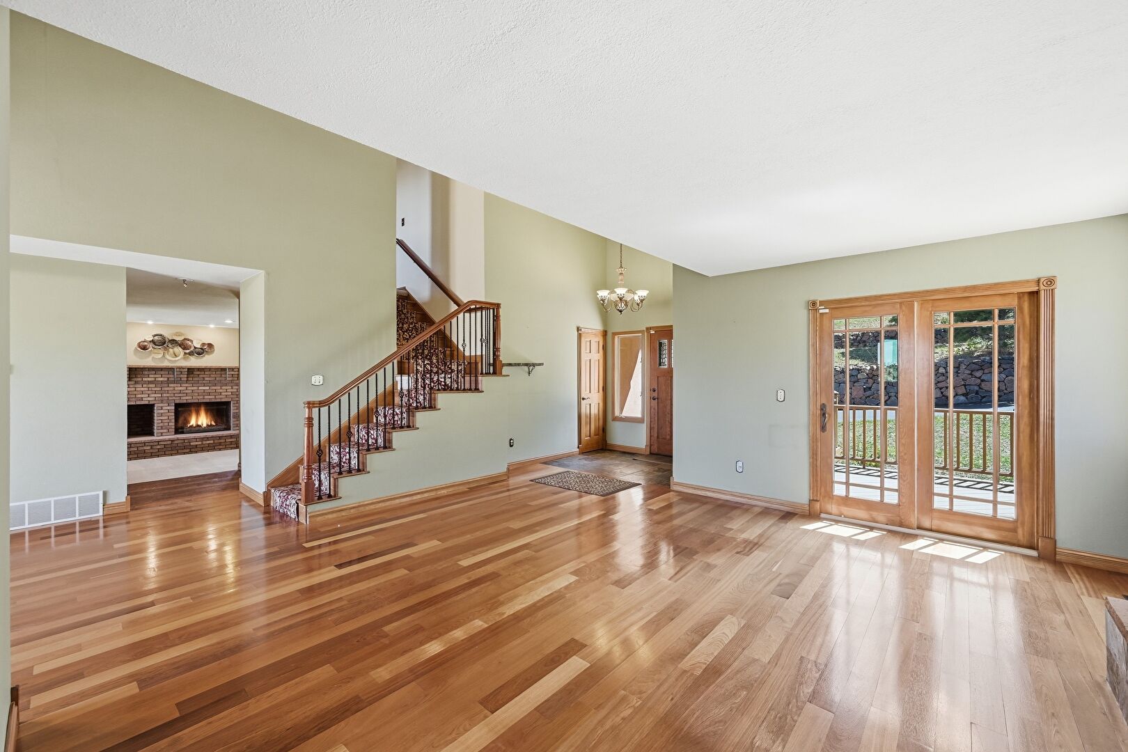 Baseboards Wall, Ceiling Fan, Drywall, Fireplace, High Ceiling, Natural Light, Notable Chandelier, Stairs, Vaulted Ceiling, Vent, Wood Finish Floor, Drywall, Vent
