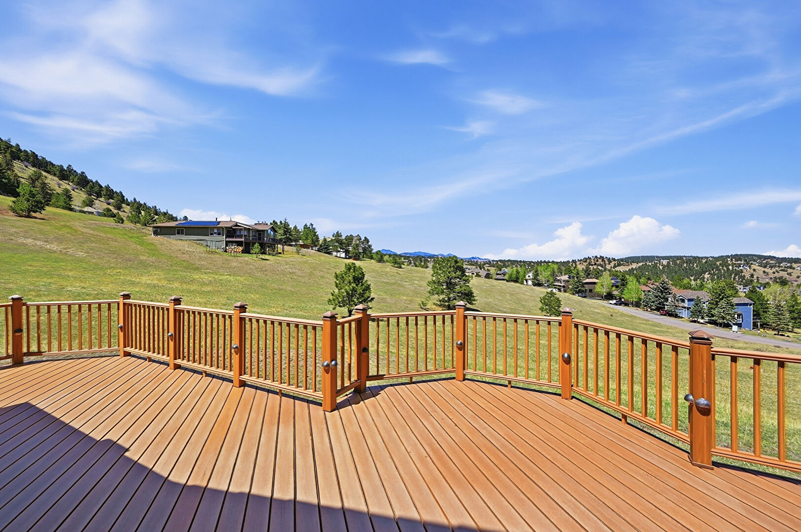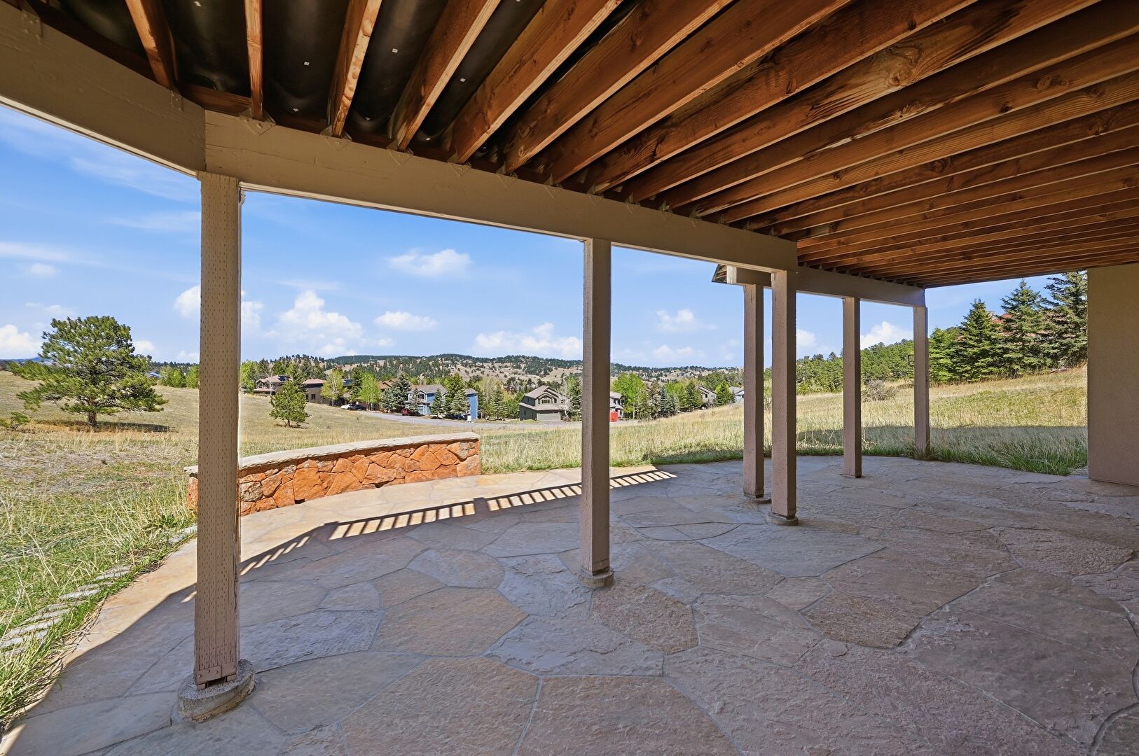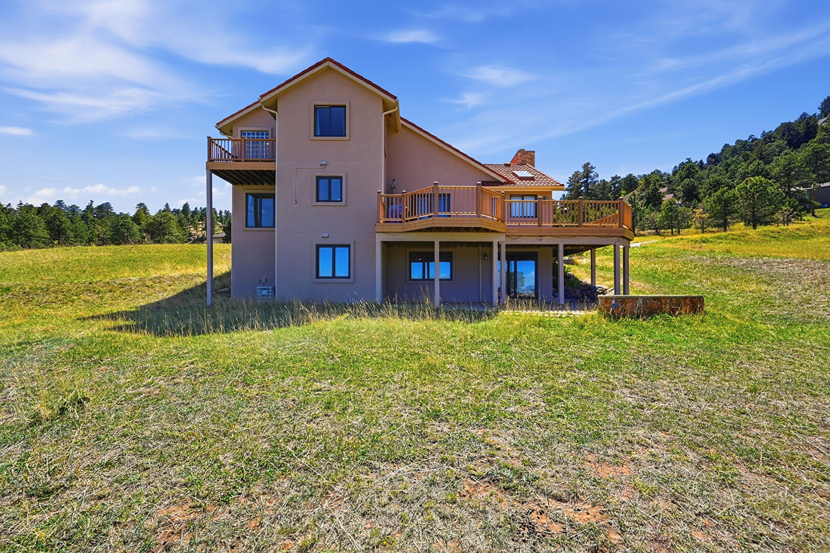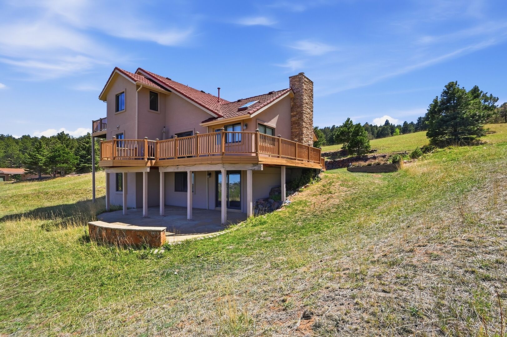 Basement Walk Out, Chimney, Deck, Downspout, Gutters, Lawn, Patio, Rural View, Stucco Siding, Tile Roof, Woods View, Lawn, Stucco Siding