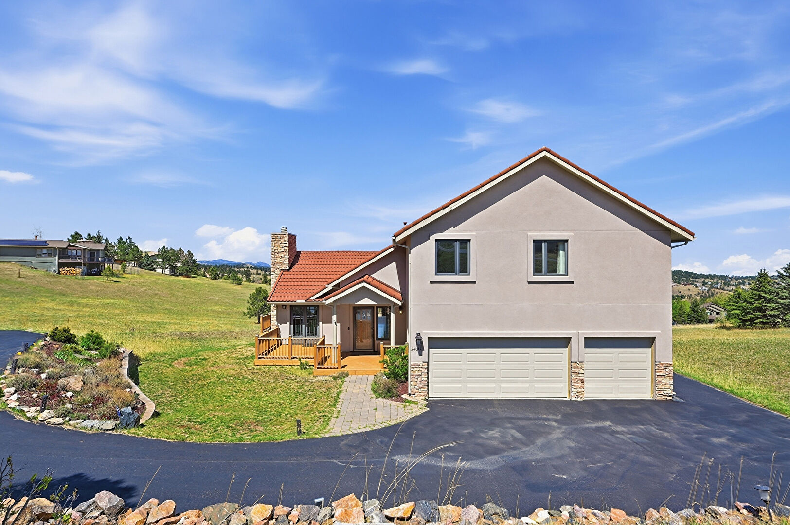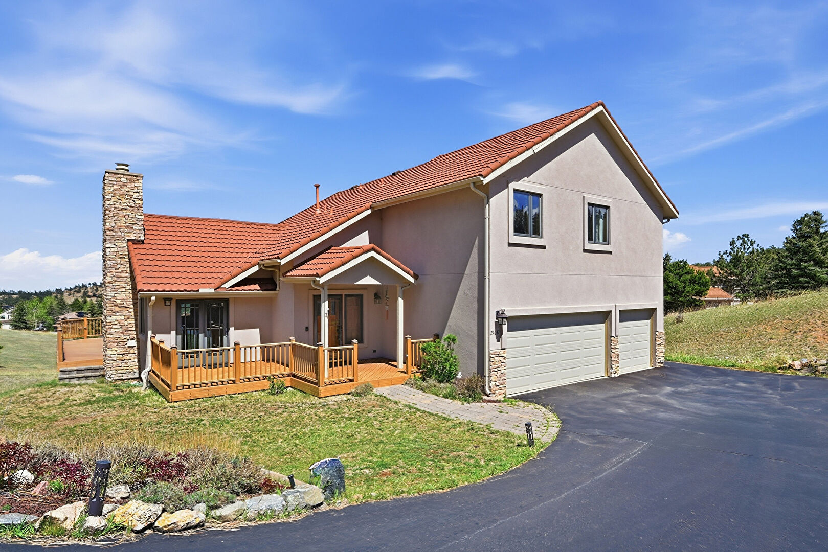 Built In Garage, Chimney, Deck, Downspout, Driveway, Gutters, Porch, Stone Siding, Stucco Siding, Tile Roof, Lawn