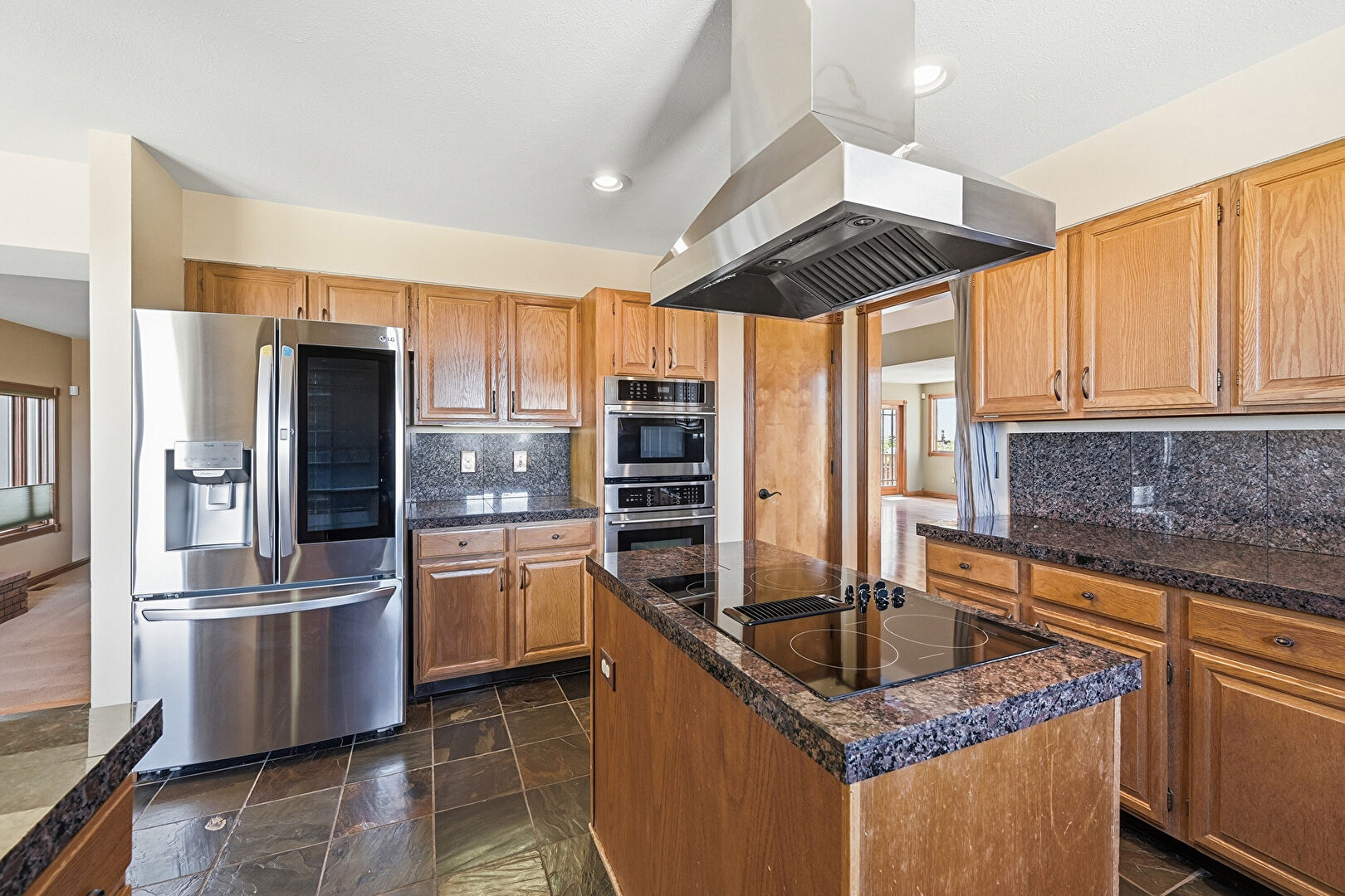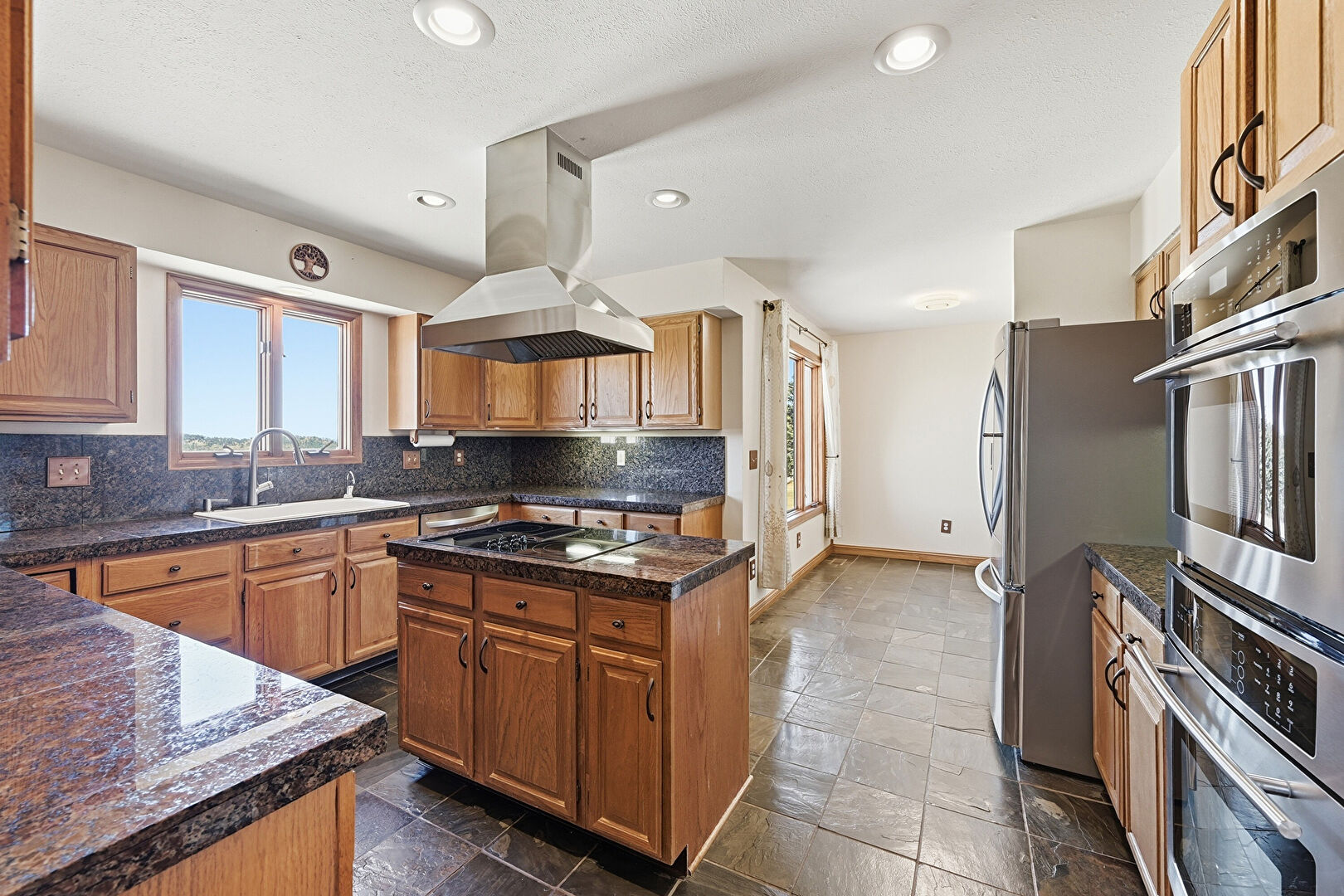 Baseboards Wall, Double Oven, Drywall, Kitchen Island, Medium Brown Cabinets, Natural Light, Raised Cabinets, Recessed Lighting, Stone Finish Floor, Stone Tile Countertops, Natural Light, Stone Finish Floor