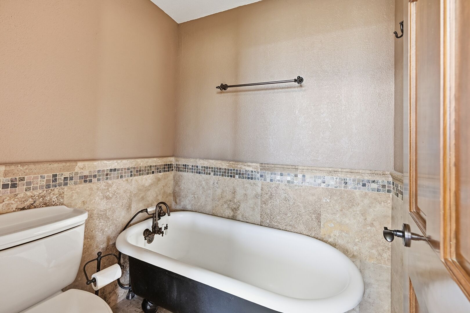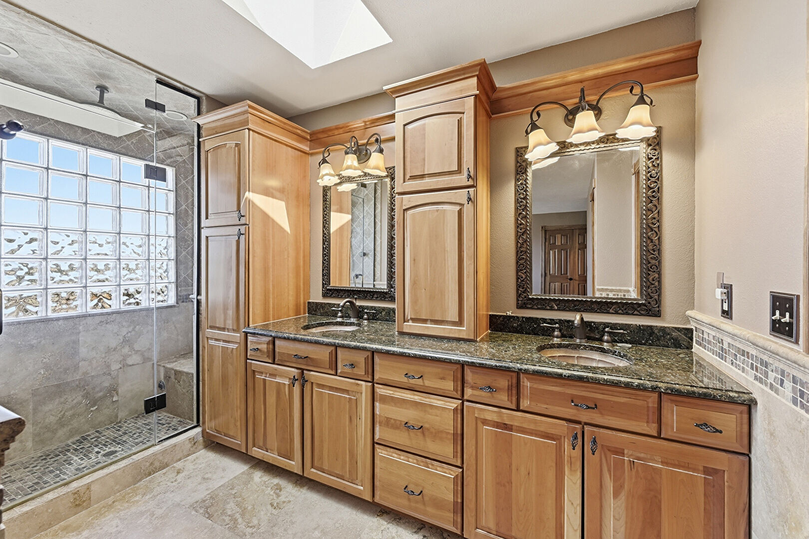 Double Vanity, Full Bathroom, Skylight, Textured Wall, Tile Wall, Natural Light, Wainscot Wall