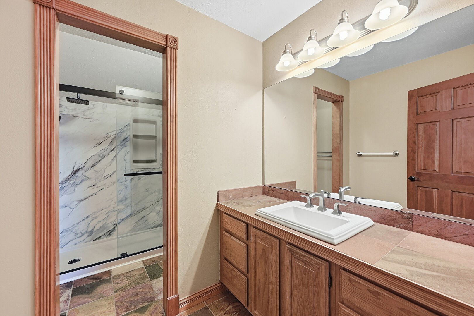 Drywall, Full Bathroom, Half Bathroom, Paneling Wall, Stone Finish Floor, Vanity, Wainscot Wall, Baseboards Wall, Textured Wall